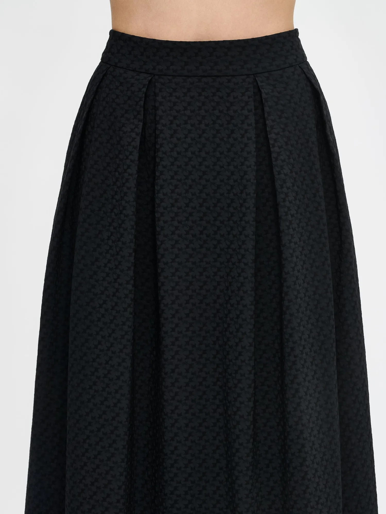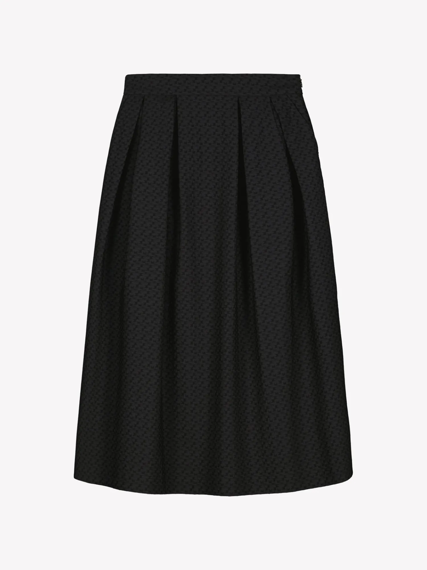 Naisten tyylikäs musta Reliefi-hame. Hameessa on laskokset vyötäröllä, levenevä helma ja sivuissa on taskut. Hameen toisessa sivussa on piilovetoketju. Hameen pituus koossa 38 on noin 84 cm. Materiaali on miellyttävän tuntuista kudottua polyesteri-viskoosi-elastaani, jossa on kaunis pintastruktuuri. Materiaalille on ominaista 3-5 % kutistuminen ensimmäisessä pesussa.