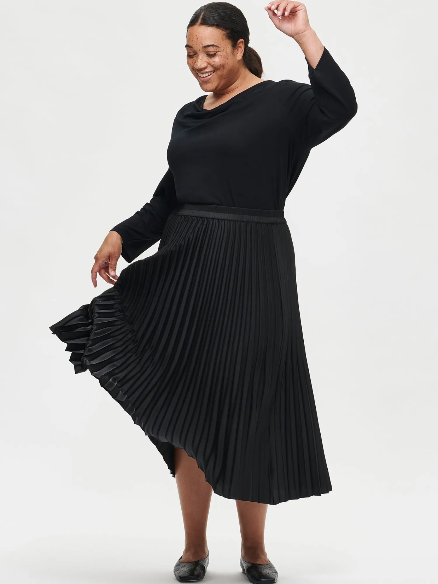 Naisten kauniisti laskeutuva musta Taite-hame. Tyylikäs Taite-hame muuntuu saumattomasti arjesta juhlaan erilaisten asusteiden ja yläosien avulla. Yhdistä hame vaikkapa mukavan saman sävyisen Pamela-neuleen kaveriksi. Hameessa on kaunis kapea pliseeraus, joustava vyötärö ja vuori. Hameen pituus koossa 38 on noin 85 cm. Materiaali on helppohoitoista polyesteria ja hameen vekit pysyvät siistinä käytössä.