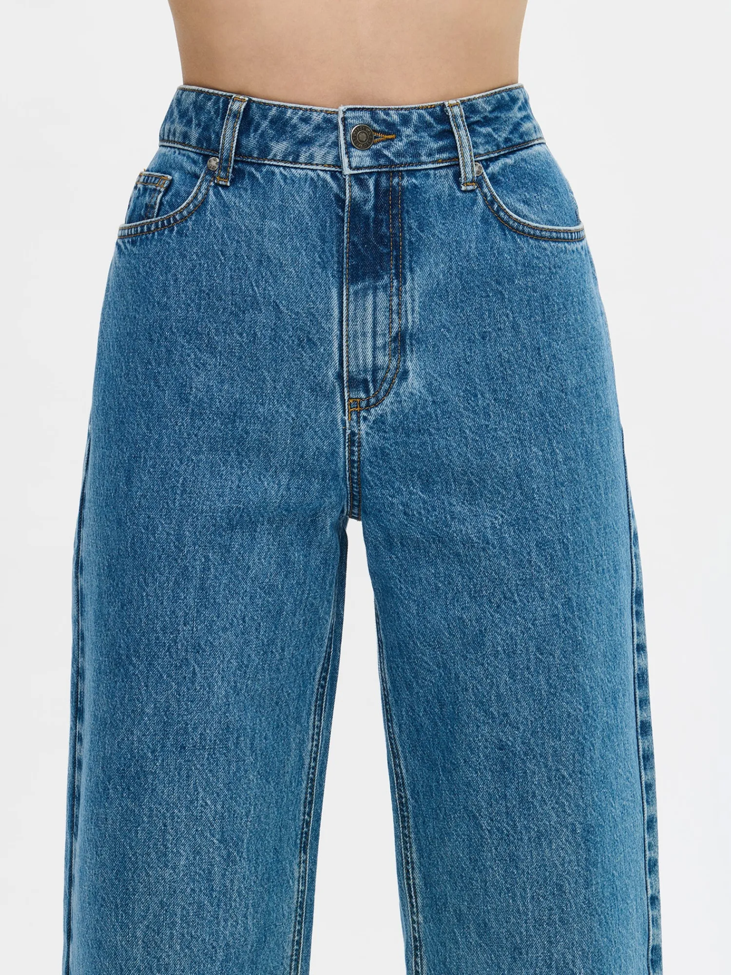 Naisten siniset Cropped Levee-farkut, joissa on normaalikorkuinen vyötärö. Trendikkäästi vajaamittaiset Levee-farkut ovat helppo ja tyylikäs valinta arkeen. Farkuissa on vyötärökaitale, edessä vetoketju ja nappikiinnitys. Rennoissa farkuissa on taskut edessä ja takana sekä levenevät, vajaamittaiset lahkeet. Lahkeen sisäpituus koossa 38 on noin 65 cm. Materiaali on kudottua twillsidoksista puuvilla-denimkangasta. 20 % kankaaseen käytetystä puuvillasta on kierrätettyä.