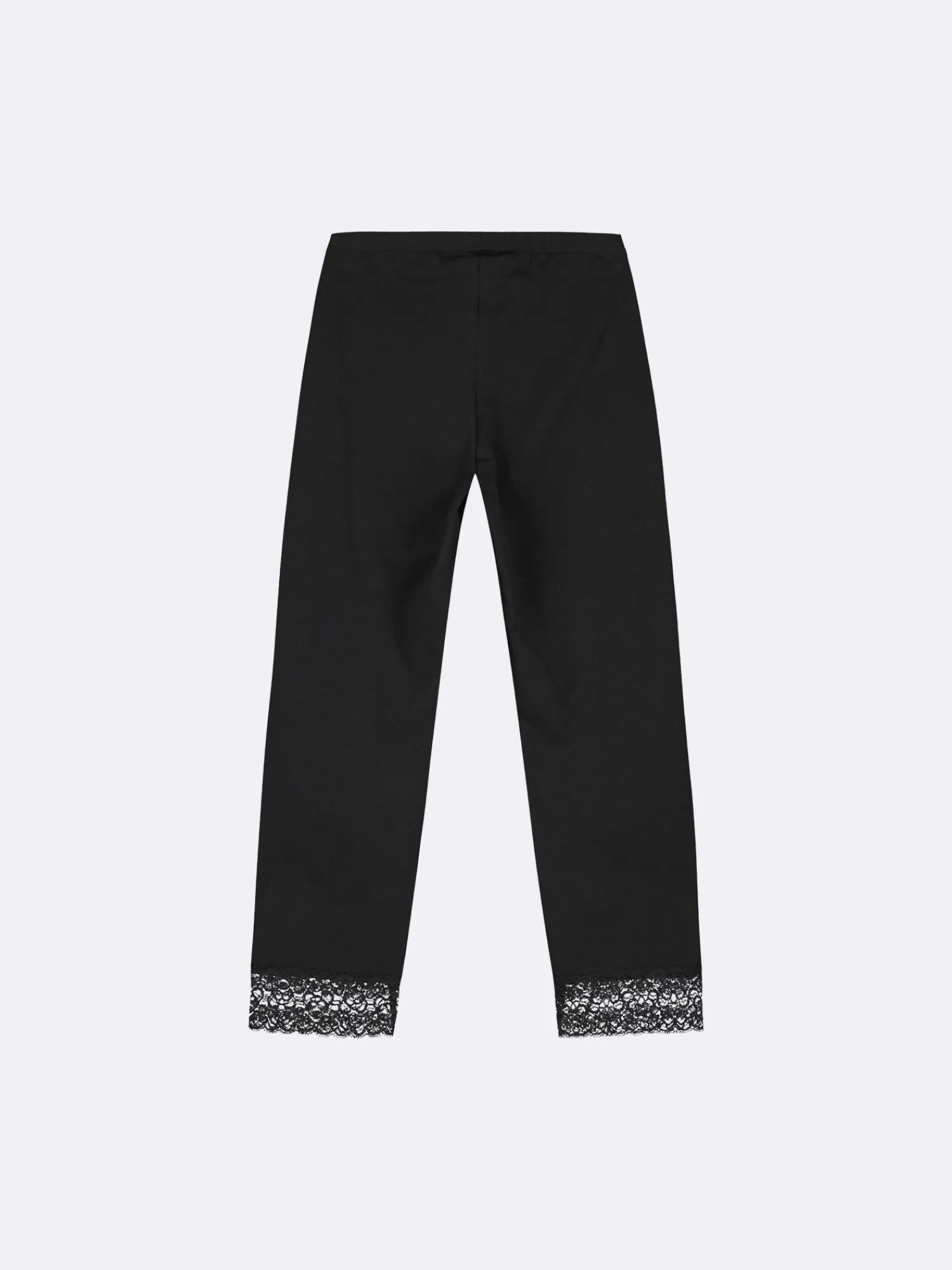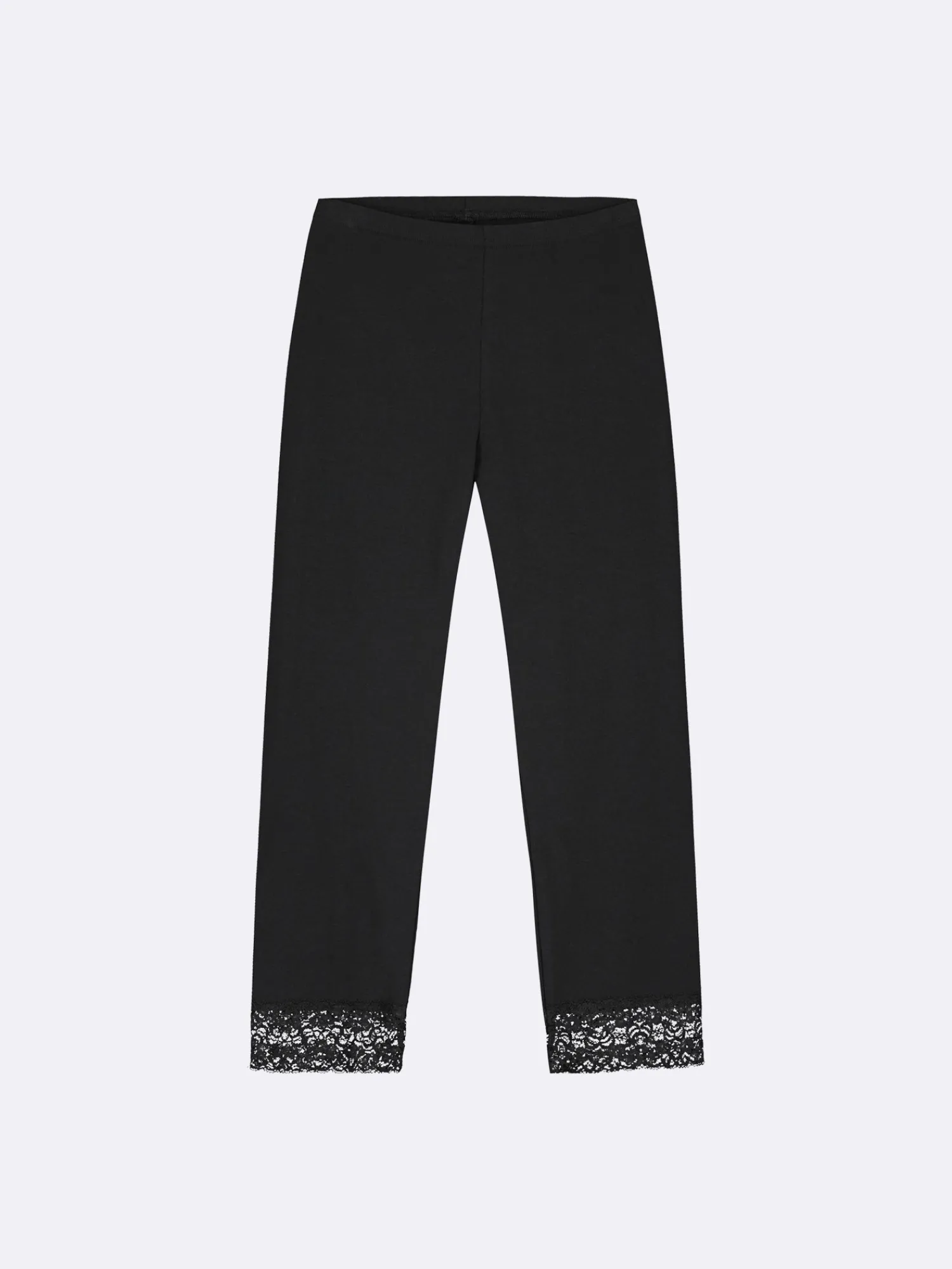 Naisten joustavat mustat Lempi-leggingsit. 3/4-mittaisissa leggingseissä on lahkeensuussa kauniit pitsikoristeet ja vyötäröllä on kuminauha. Lahkeen sisäpituus koossa M on noin 53 cm. Materiaali on miellyttävää ja joustavaa luomupuuvilla-elastaani-neulosta.