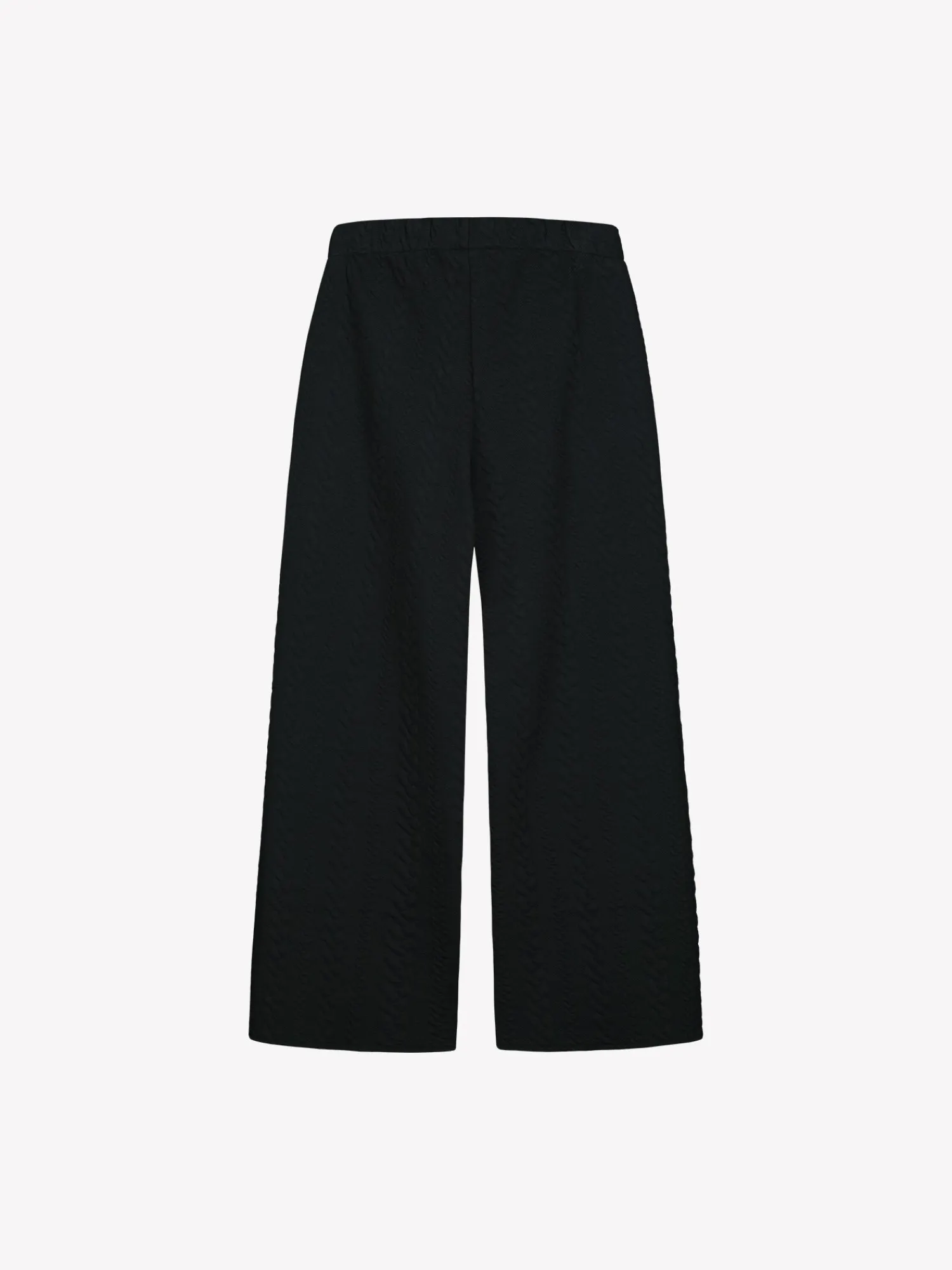 Naisten rennot mustat Letti-housut. Housuissa on sivutaskut, leveät lahkeet ja vyötäröllä mukava kuminauharakenne. Housut ovat täyspitkät. Ryhdikäs pintakuvioitu materiaali on miellyttävää puuvilla-elastaani neulosta. Materiaalille on ominaista 3-5 % kutistuminen ensimmäisessä pesussa.
