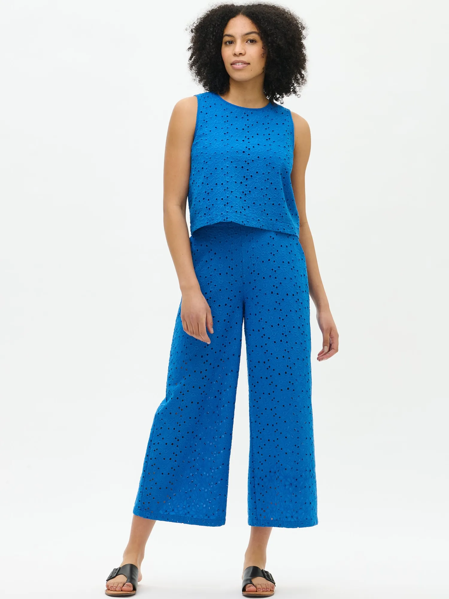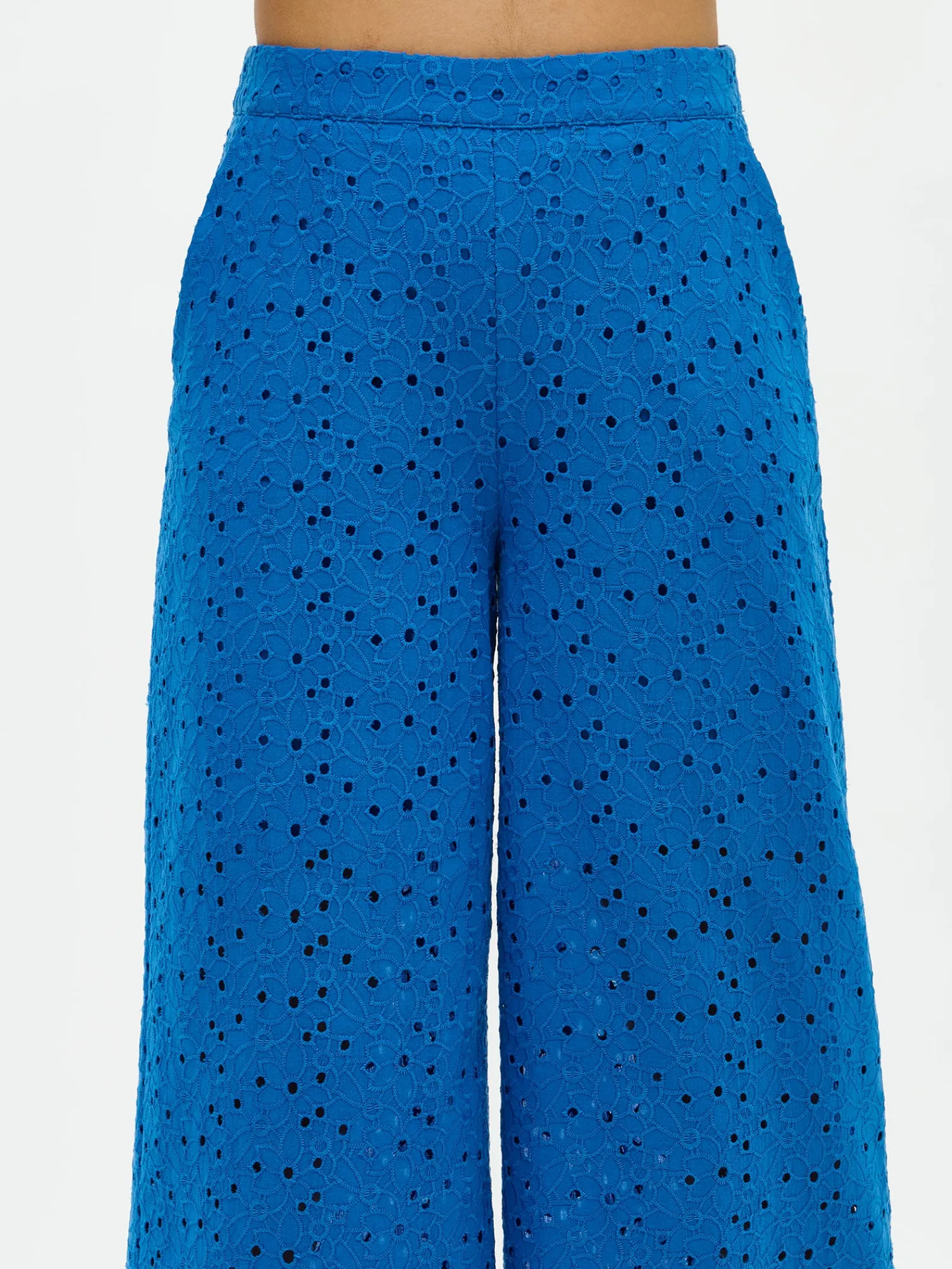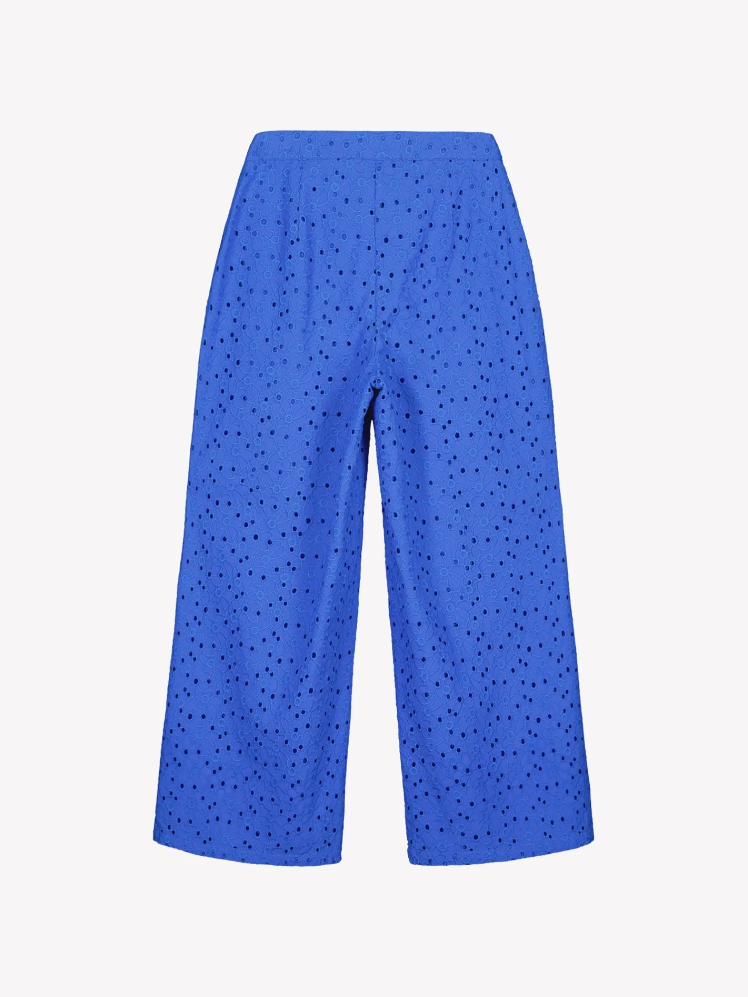 Naisten siniset brodeeratut Nuppu-housut. Leveä lahkeisissa housuissa on istuva vyötärö ja sivussa on taskut sekä vetoketju. Housut ovat 7/8 pituiset ja sisälahkeen pituus koossa 38 on noin 67 cm. Materiaali on kudottua puuvilla-popliinikangasta, jossa on kaunis brodeeraus. Materiaali on kevyttä ja hengittävää. Housujen yläosassa on ohut puuvillavuori.
