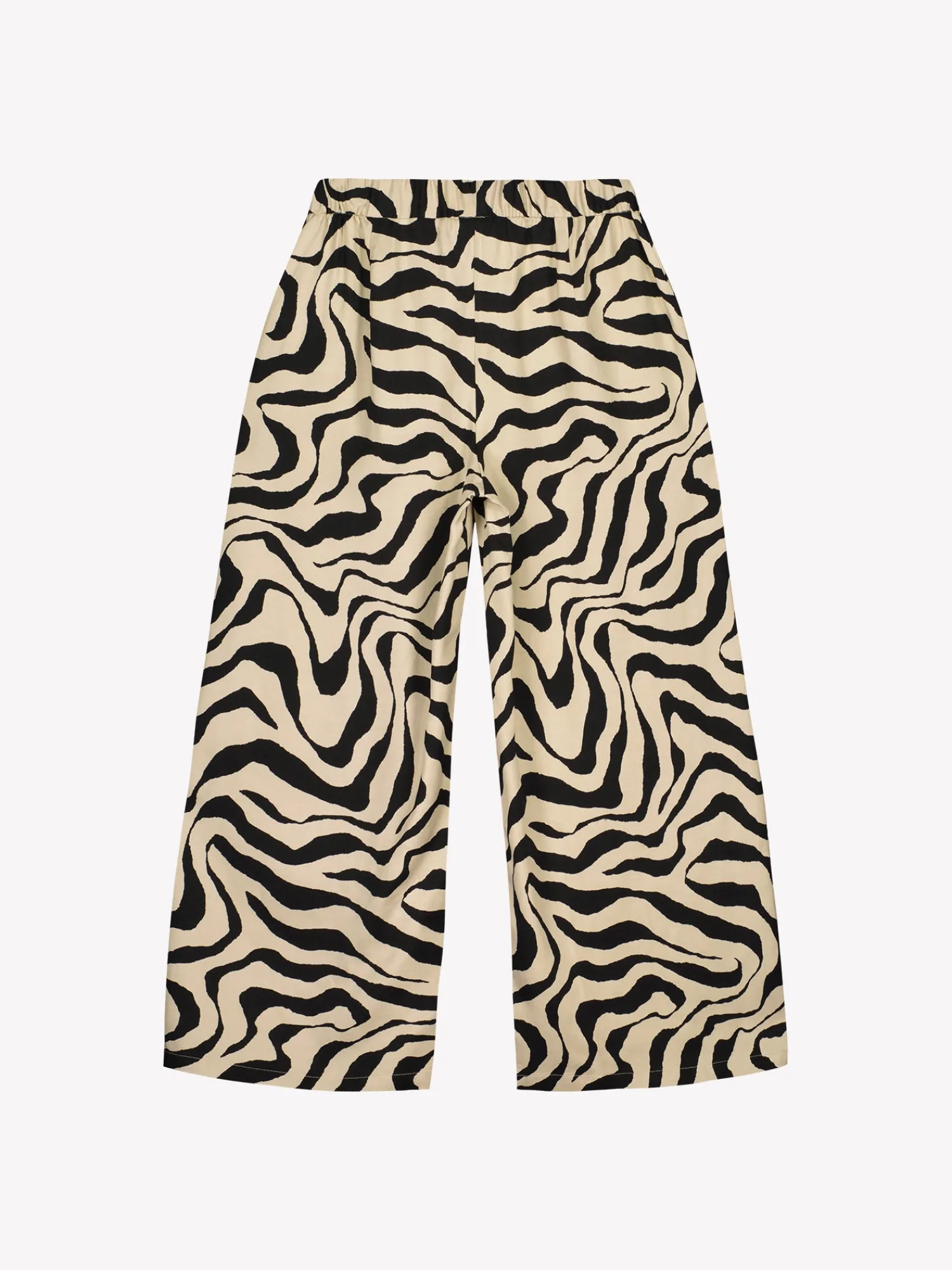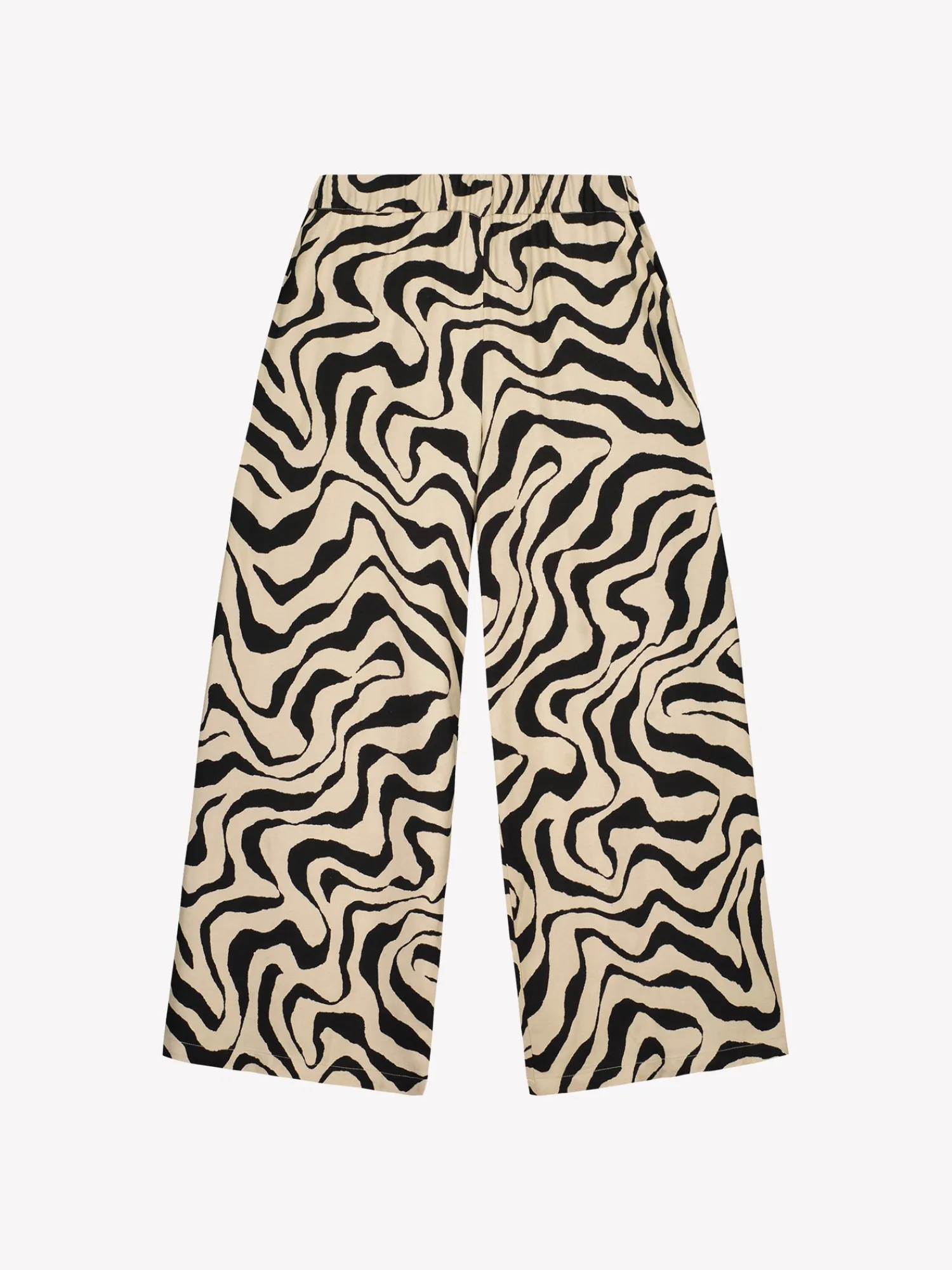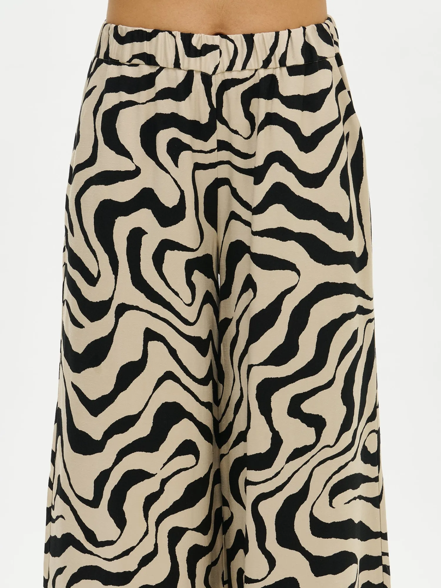 Naisten kuosilliset beiget Savanna-housut. Housuissa on leveät lahkeet, sivuissa taskut ja joustava vyötärö. Housut ovat täyspitkät ja lahkeen sisäpituus koossa 38 on noin 76 cm. Kauniisti laskeutuvien housujen materiaali on laadukasta ja miellyttävän tuntuista viskoosi-pellava-kangasta. Materiaalille on ominaista 3-5 % kutistuminen ensimmäisessä pesussa.