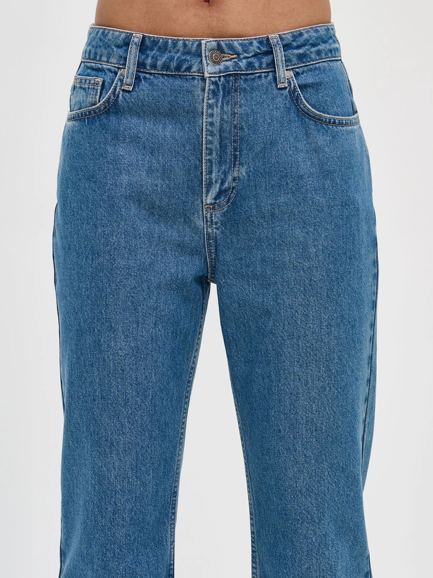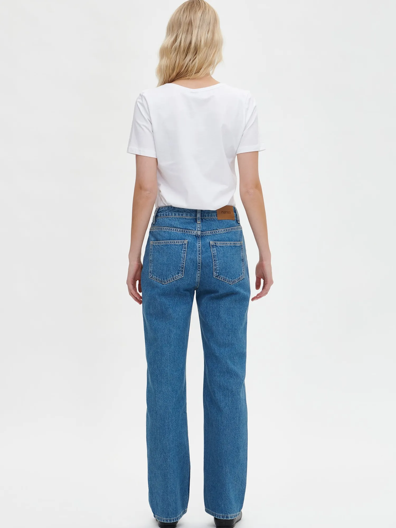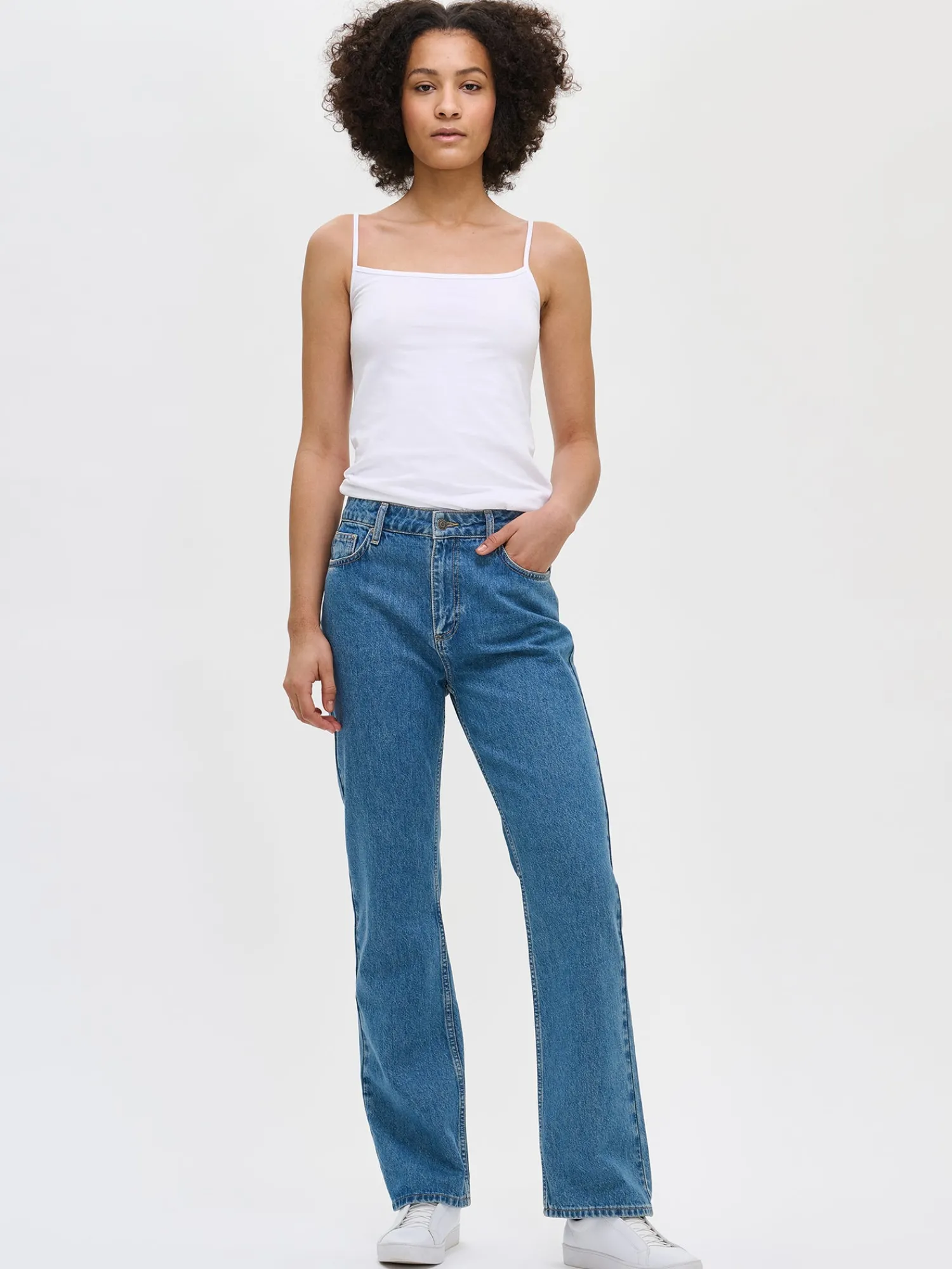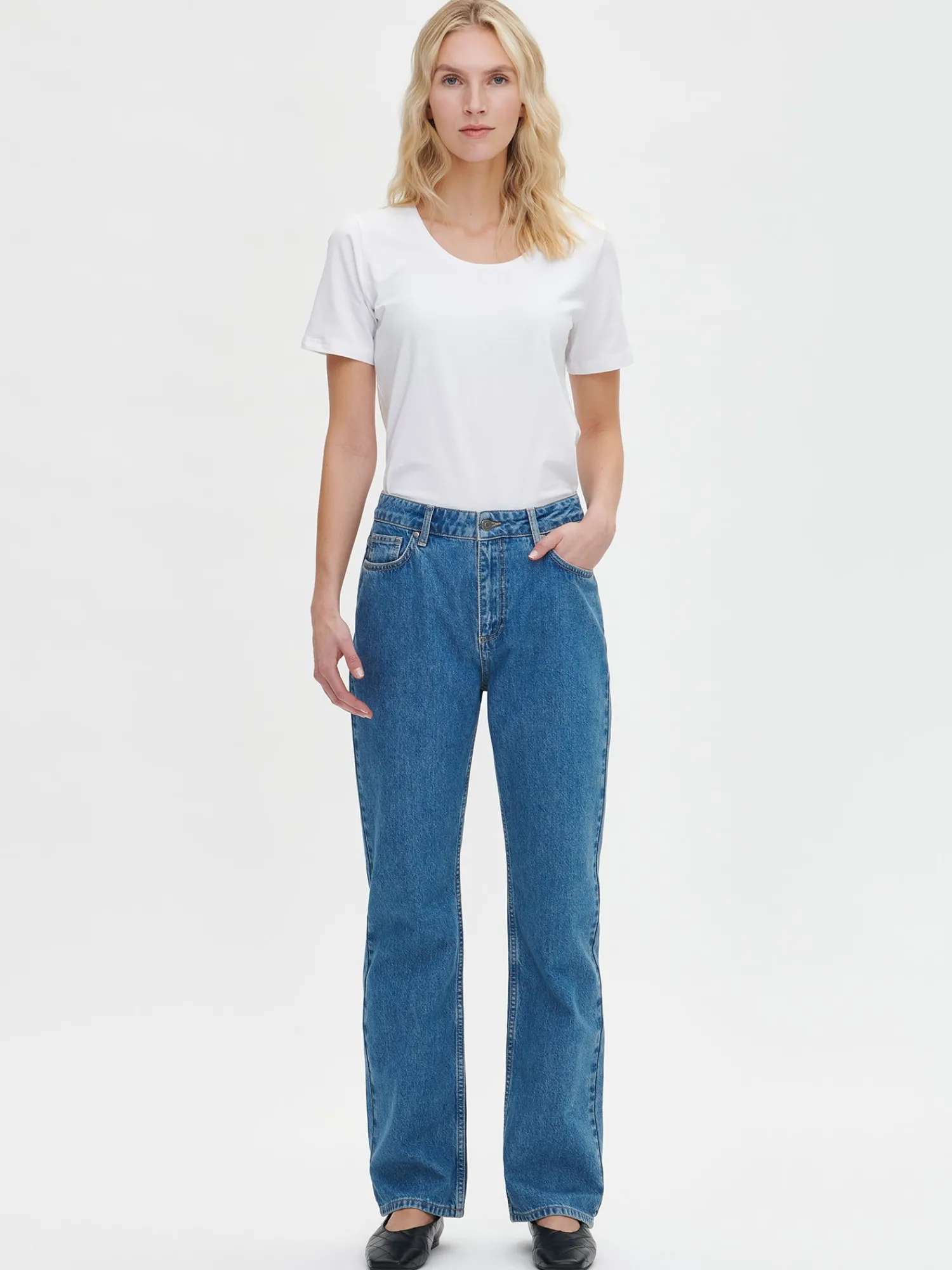 Naisten rennot vaaleansiniset Suora-farkut, joissa on normaalikorkuinen vyötärö. Klassiset ja mukavat suorat farkut ovat monen asukokonaisuuden runko. Hyvin istuvat farkut ovat vaatekaapin luottovaate, johon on aina ihanaa pukeutua. Suora-farkuissa on vyötärökaitale, edessä vetoketju ja nappikiinnitys. Farkuissa on taskut edessä sekä takana ja täyspitkät suorat lahkeet. Farkkujen lahkeen sisäpituus koossa 38 on noin 80 cm. Materiaali on kudottua twillsidoksista puuvilla-denimkangasta. 20% kankaaseen käytetystä puuvillasta on kierrätettyä.