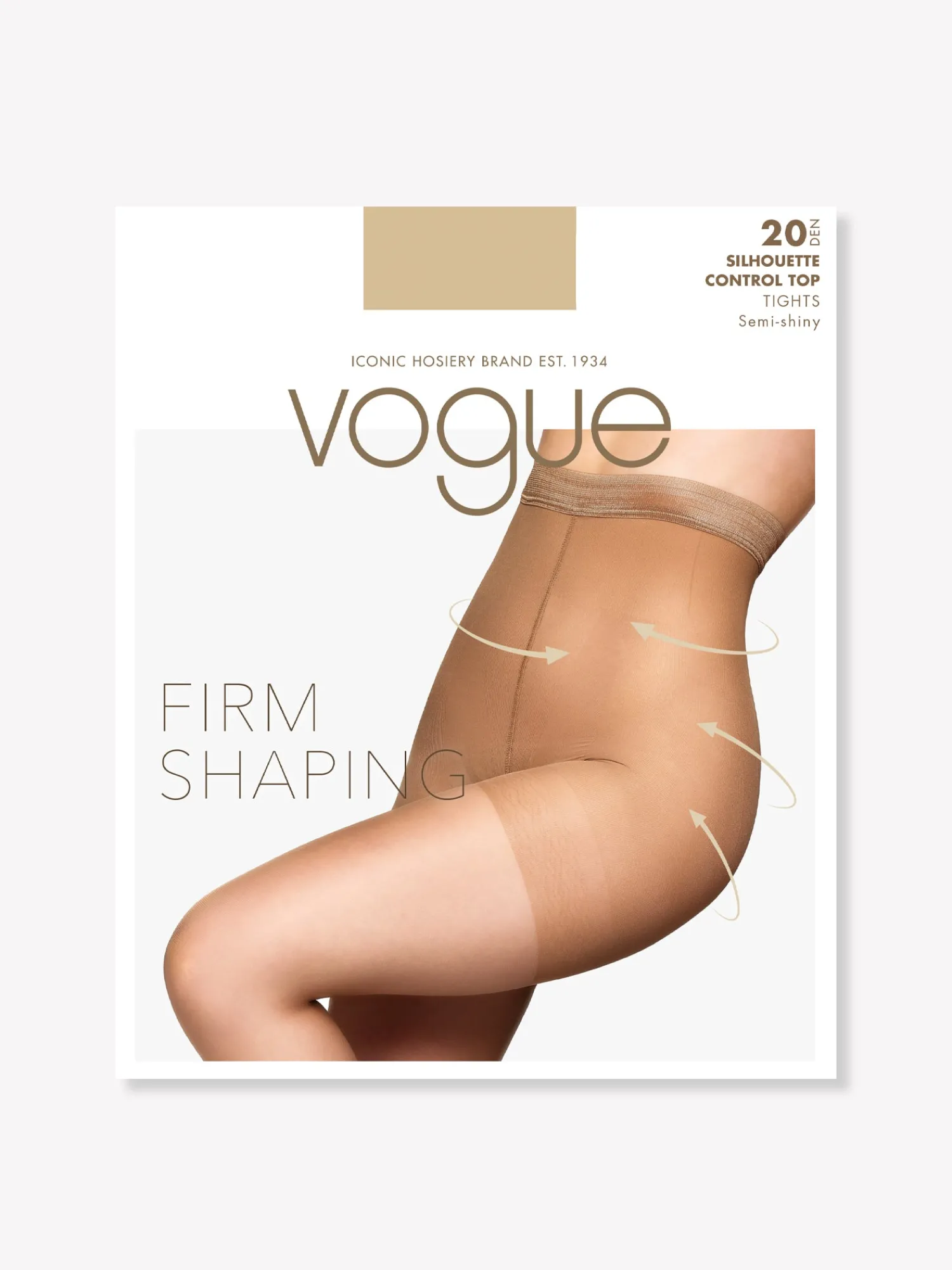 Voguen 20 denierin himmeäkiiltoiset mustat muotoilevat sukkahousut. Sukkahousujen Control Top- housuosa on 50 denierin paksuinen ja muotoilee voimakkaasti vyötäröltä reidelle. Sukkahousuissa on tasosauma, puuvillahaarakiila ja huomaamaton kärkivahvike. Sukkahousujen vyötärönauhalla on silikoninauha.