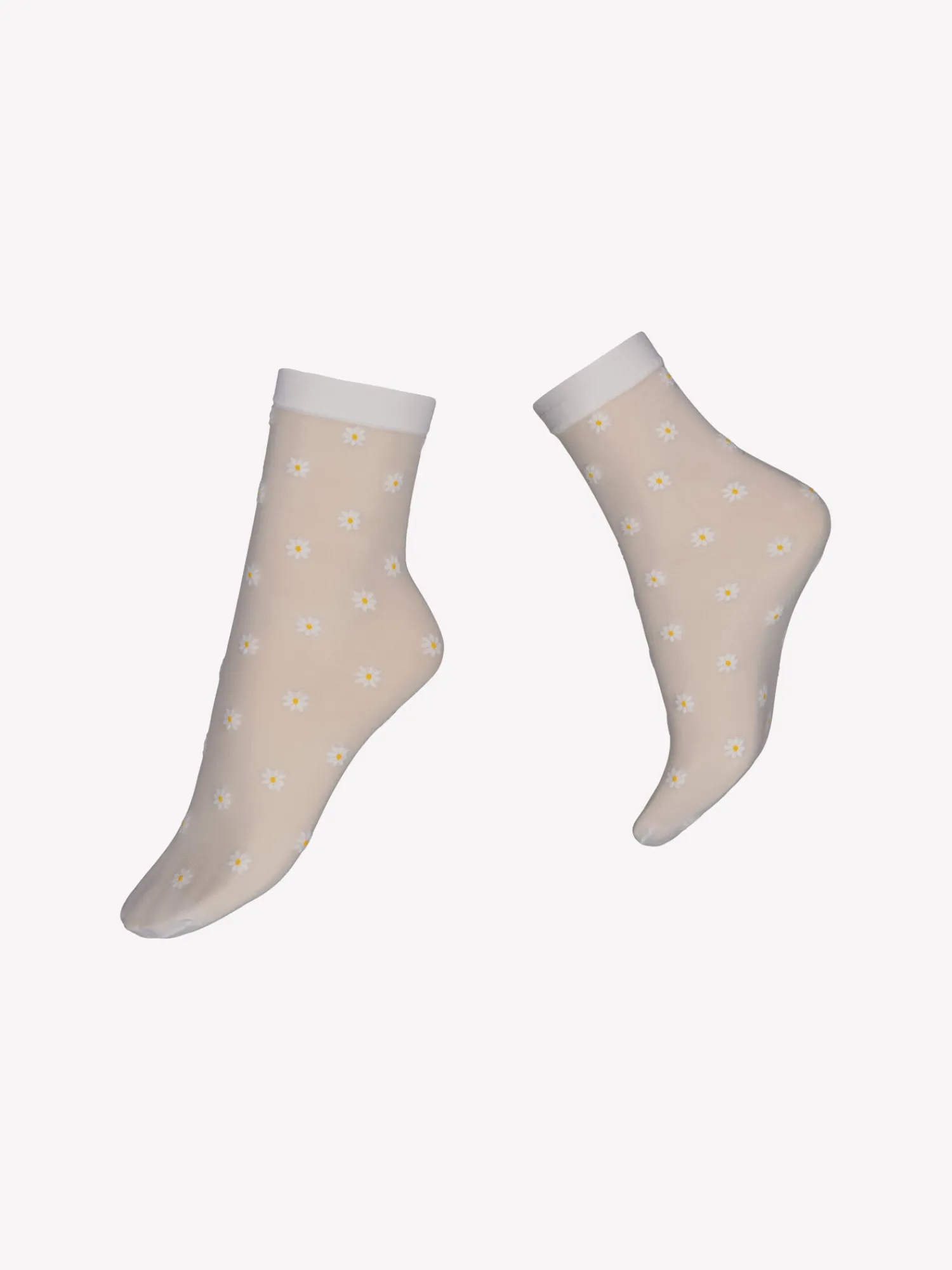 Voguen leikkisät kukkakuvioiset valkoiset 20 denierin nilkkasukat. Ohuet, läpikuultavat nilkkasukat ihastuttavalla päivänkakkarakuviolla ja sukissa on kärkivahvike.