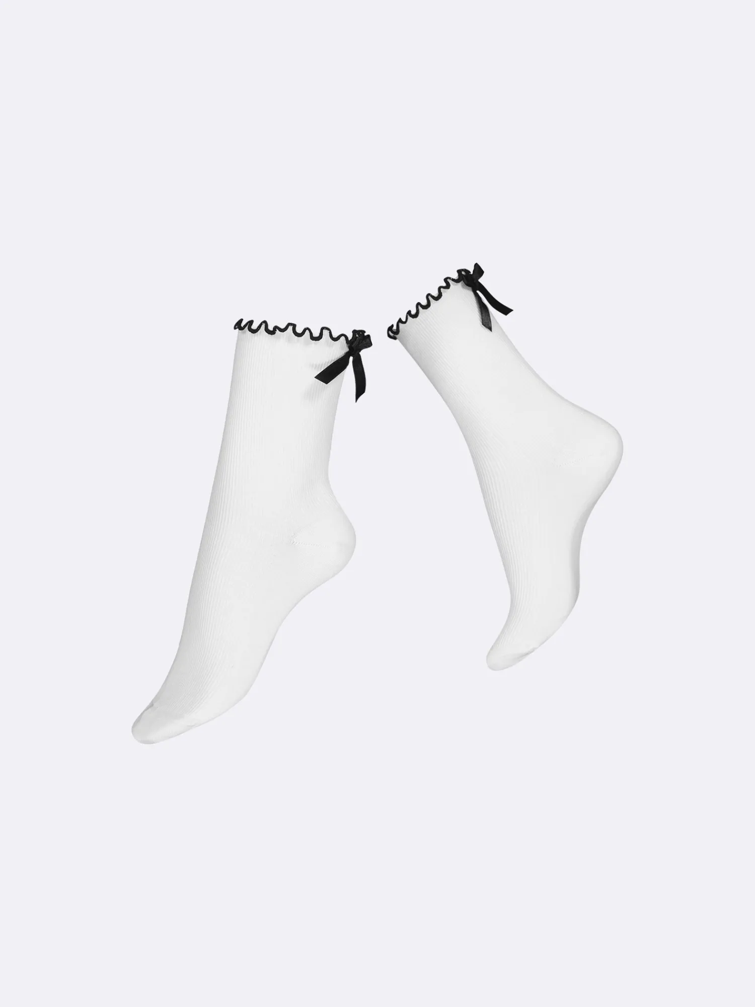 Voguen valkoiset puuvillasukat trendikkäällä kontrastivärisellä frillareunalla. Sukissa on takana varressa tyylikäs musta rusetti.