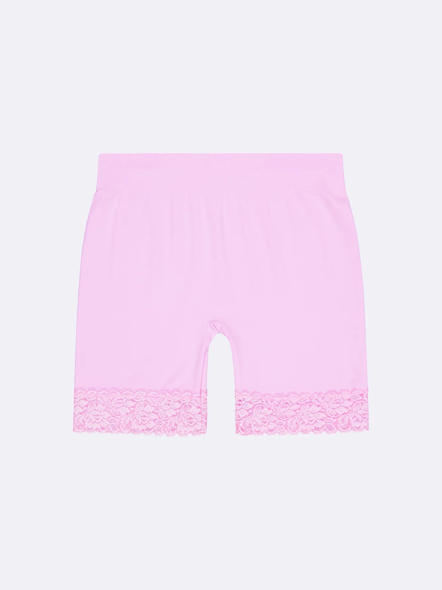 Voguen lyhyet vaaleanpunaiset Seamless leggingsit kauniilla pitsireunalla. Pehmeä ja silkkinen materiaali suojaa reisiä hankaukselta ja tuntuu ihanalta päällä. Lyhyet leggingsit ovatkin täydelliset käytettäväksi hameiden ja mekkojen alla. Tuotteessa on minimoitu saumojen määrä.