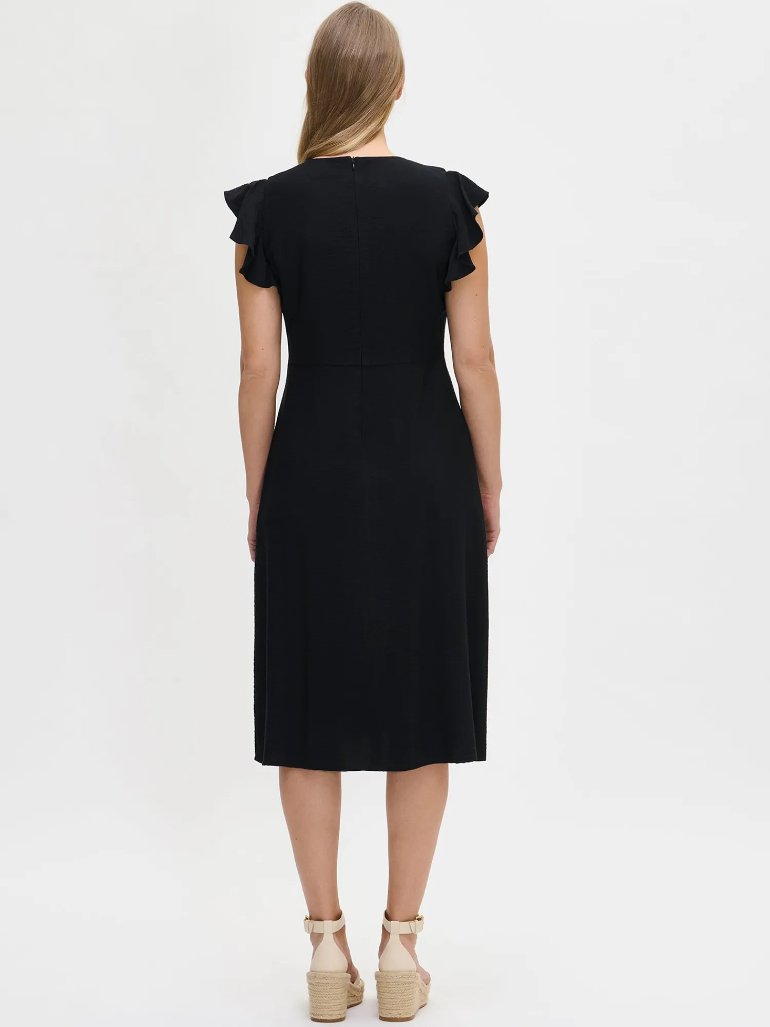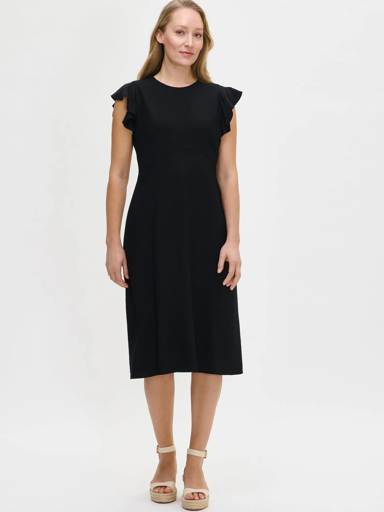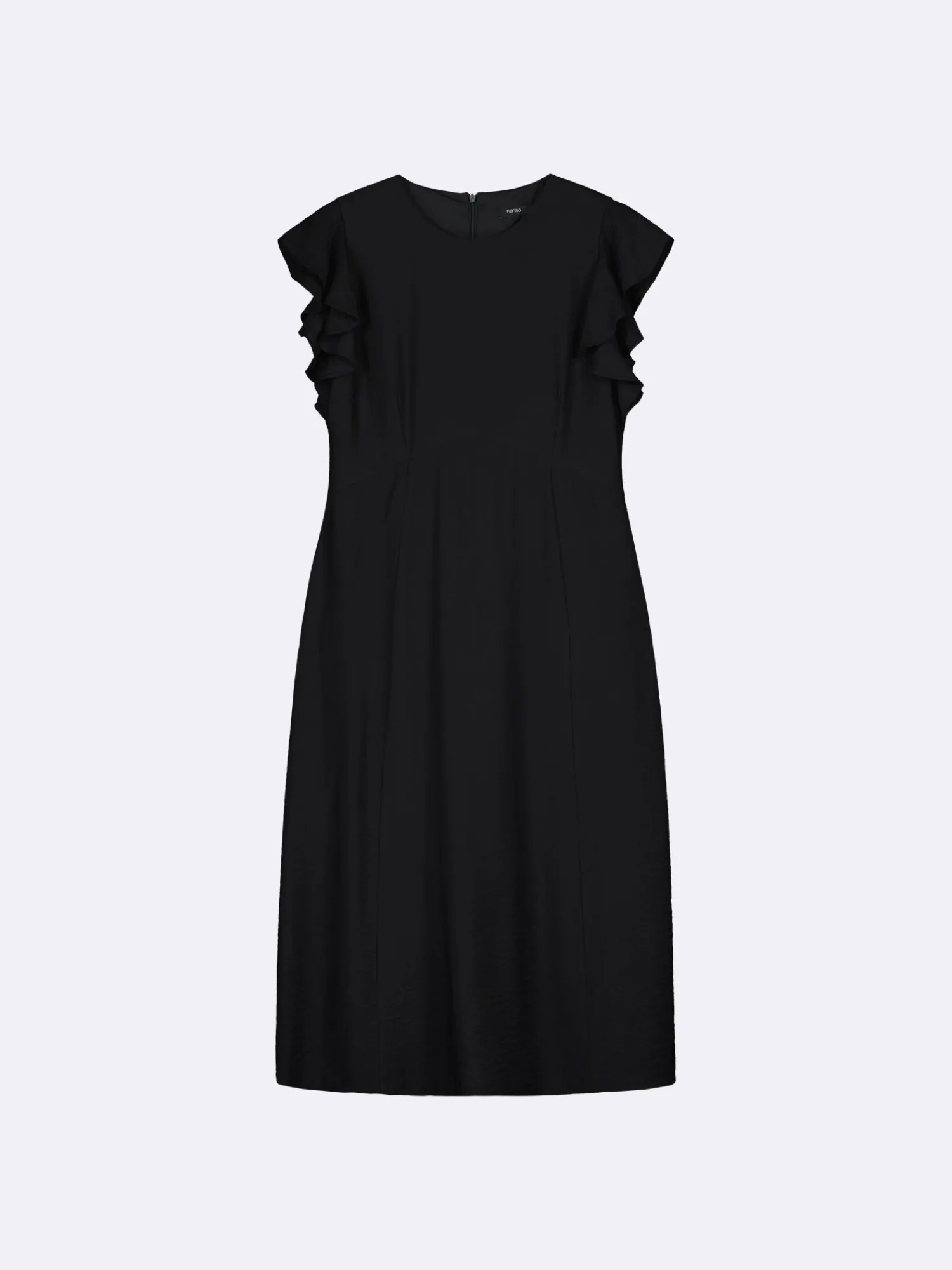 Naisten yksivärinen musta Antonia-mekko. Mekossa on pyöreä pääntie, takana piilovetoketju, vuori ja kauniit frillat kädenteillä. Mekko on yläosasta istuva ja helma kauniisti kellottuva. Mekon pituus koossa 38 on noin 115 cm. Materiaali on kauniisti laskeutuvaa ja kevyttä viskoosi-polyamidi sekoitekangasta. Materiaalin viskoosi LENZING™ ECOVERO™ -viskoosia. Materiaalille on ominaista 3-5% kutistuminen ensimmäisessä pesussa.