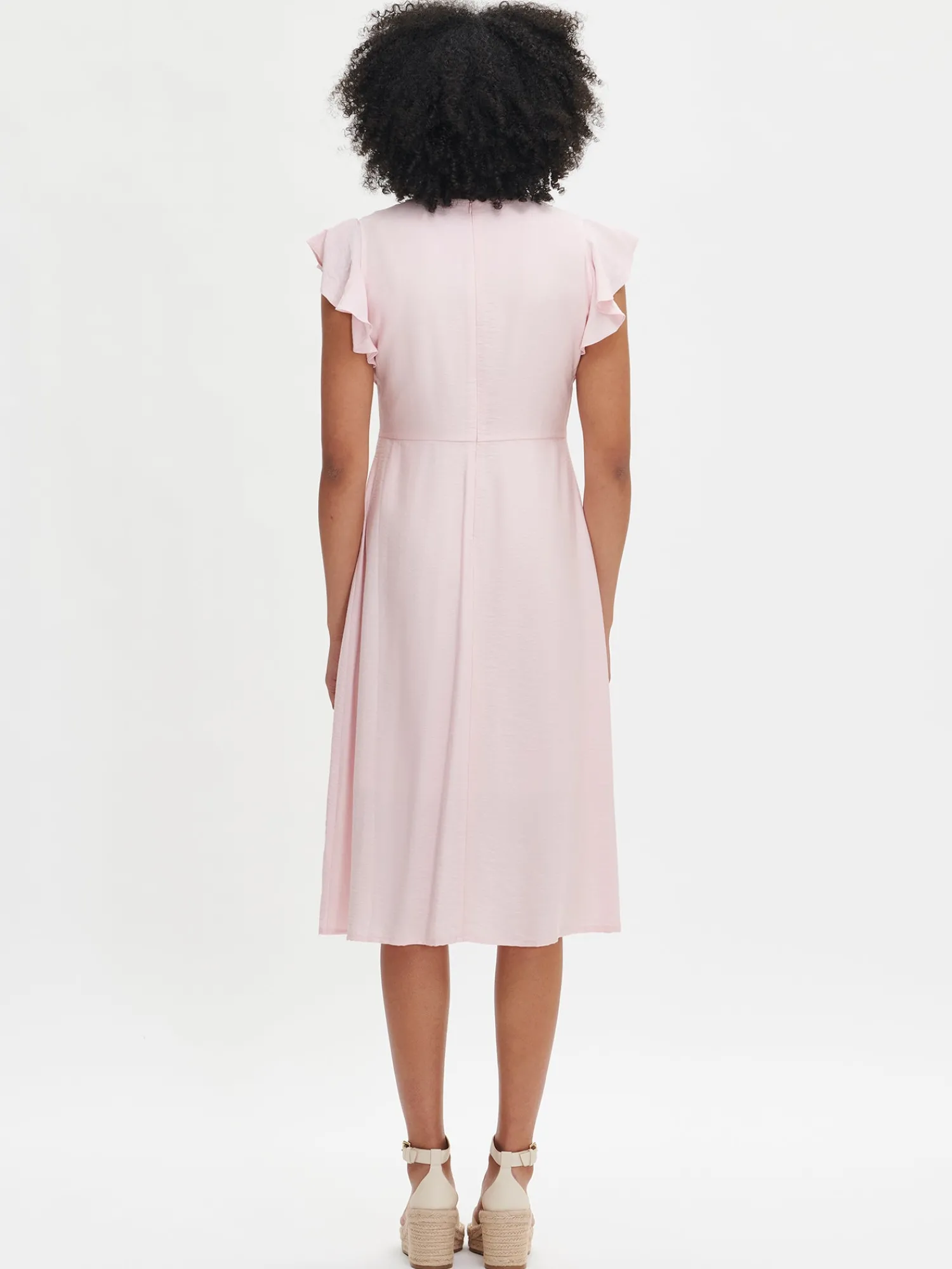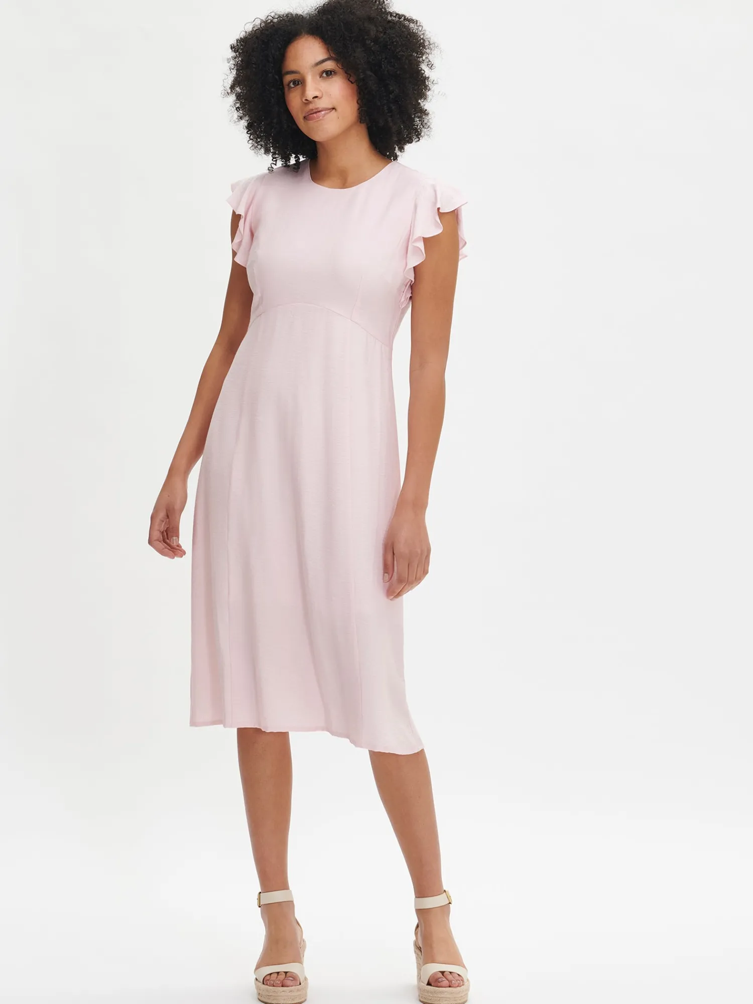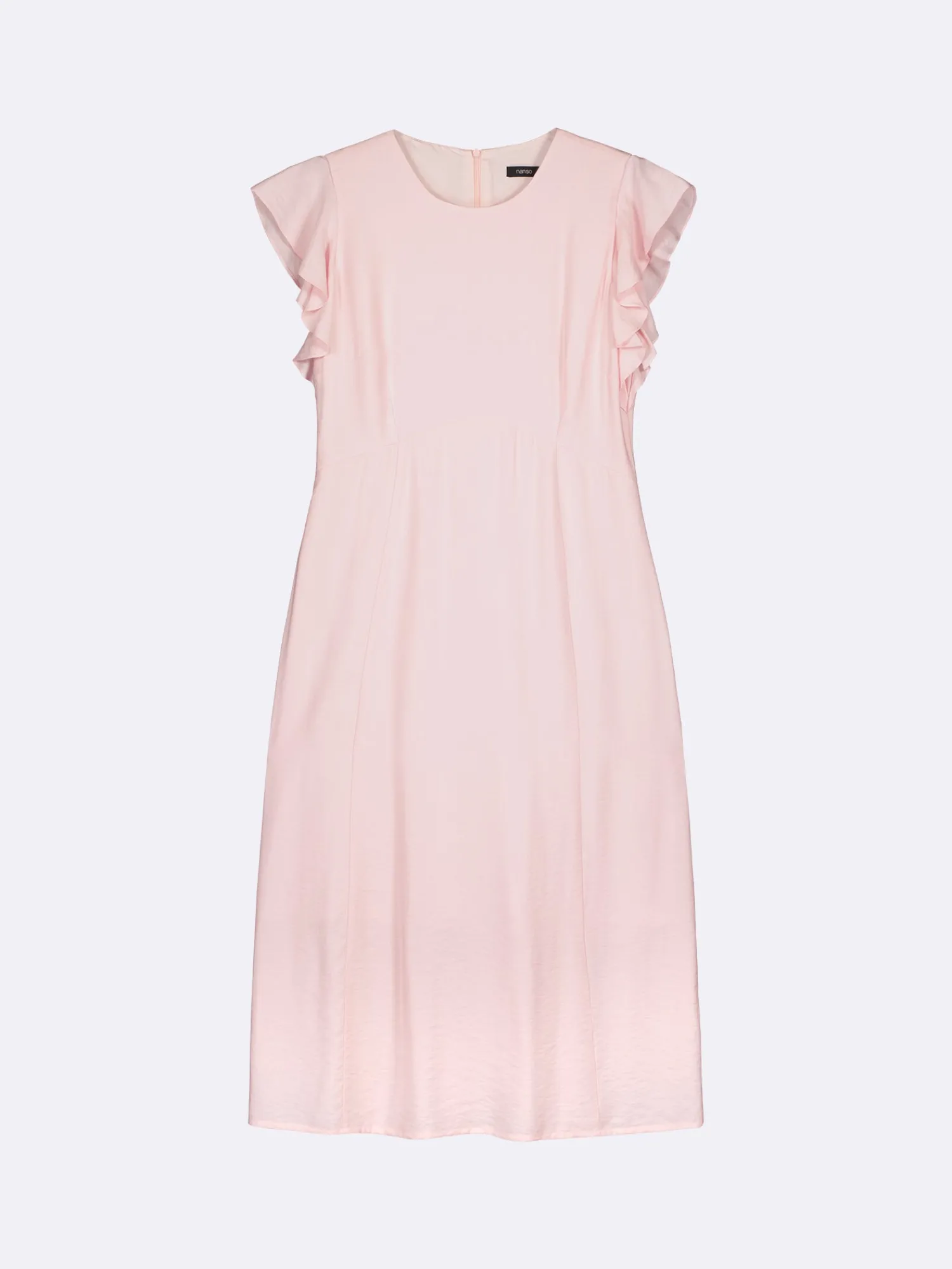 Naisten yksivärinen vaaleanpunainen Antonia-mekko. Mekossa on pyöreä pääntie, takana piilovetoketju, vuori ja kauniit frillat kädenteillä. Mekko on yläosasta istuva ja helma kauniisti kellottuva. Mekon pituus koossa 38 on noin 115 cm. Materiaali on kauniisti laskeutuvaa ja kevyttä viskoosi-polyamidi sekoitekangasta. Materiaalin viskoosi LENZING™ ECOVERO™ -viskoosia. Materiaalille on ominaista 3-5% kutistuminen ensimmäisessä pesussa.