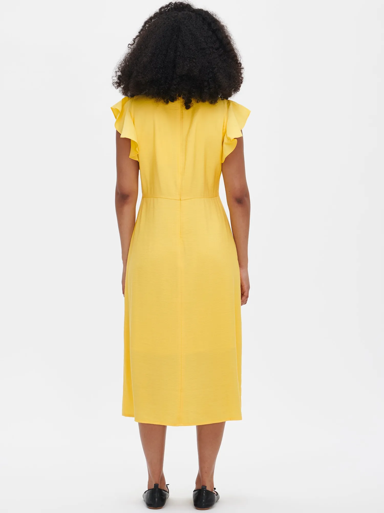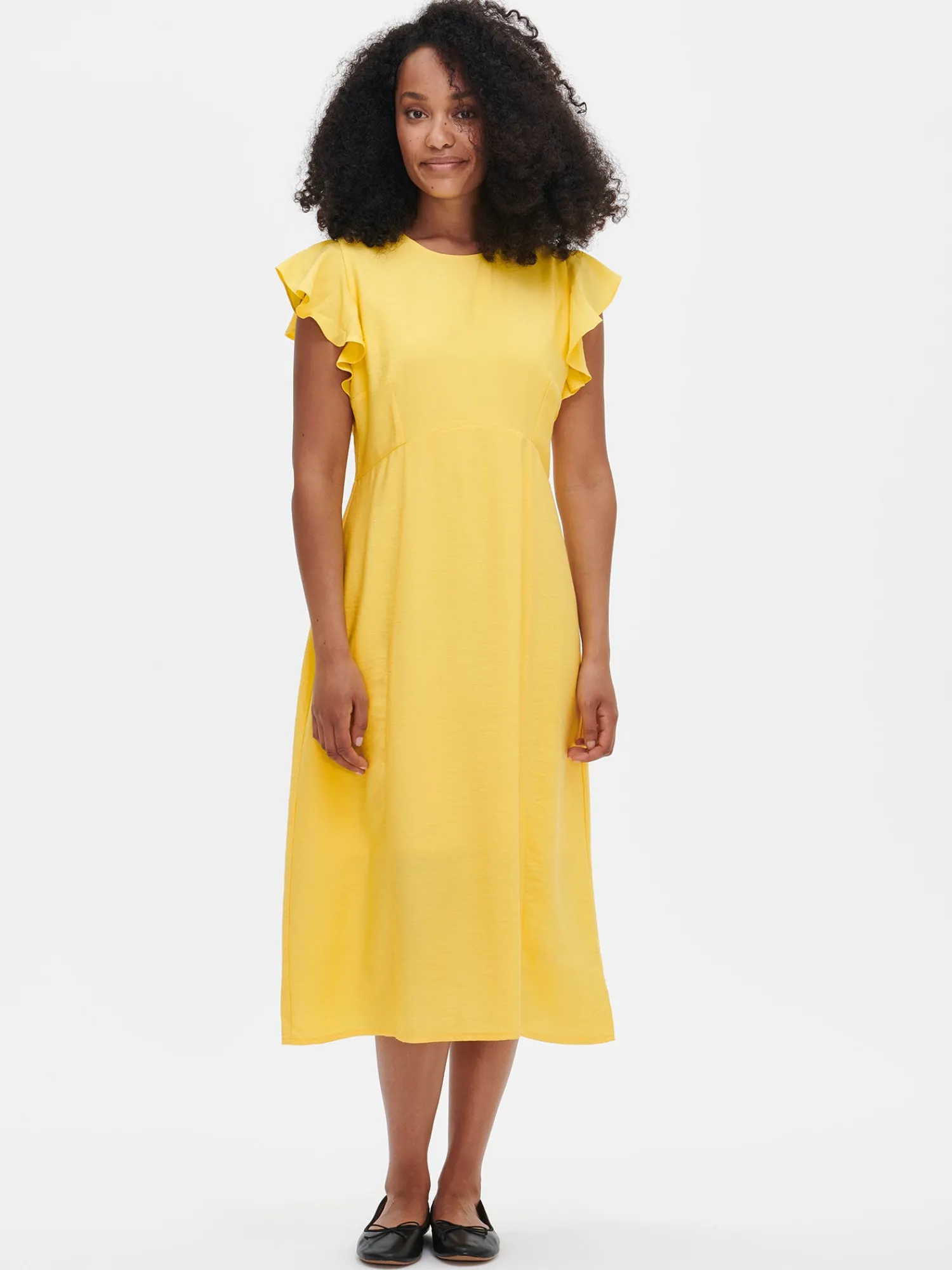 Naisten yksivärinen keltainen Antonia-mekko. Mekossa on pyöreä pääntie, takana piilovetoketju, vuori ja kauniit frillat kädenteillä. Mekko on yläosasta istuva ja helma kauniisti kellottuva. Mekon pituus koossa 38 on noin 115 cm. Materiaali on kauniisti laskeutuvaa ja kevyttä viskoosi-polyamidi sekoitekangasta. Materiaalin viskoosi LENZING™ ECOVERO™ -viskoosia. Materiaalille on ominaista 3-5% kutistuminen ensimmäisessä pesussa.