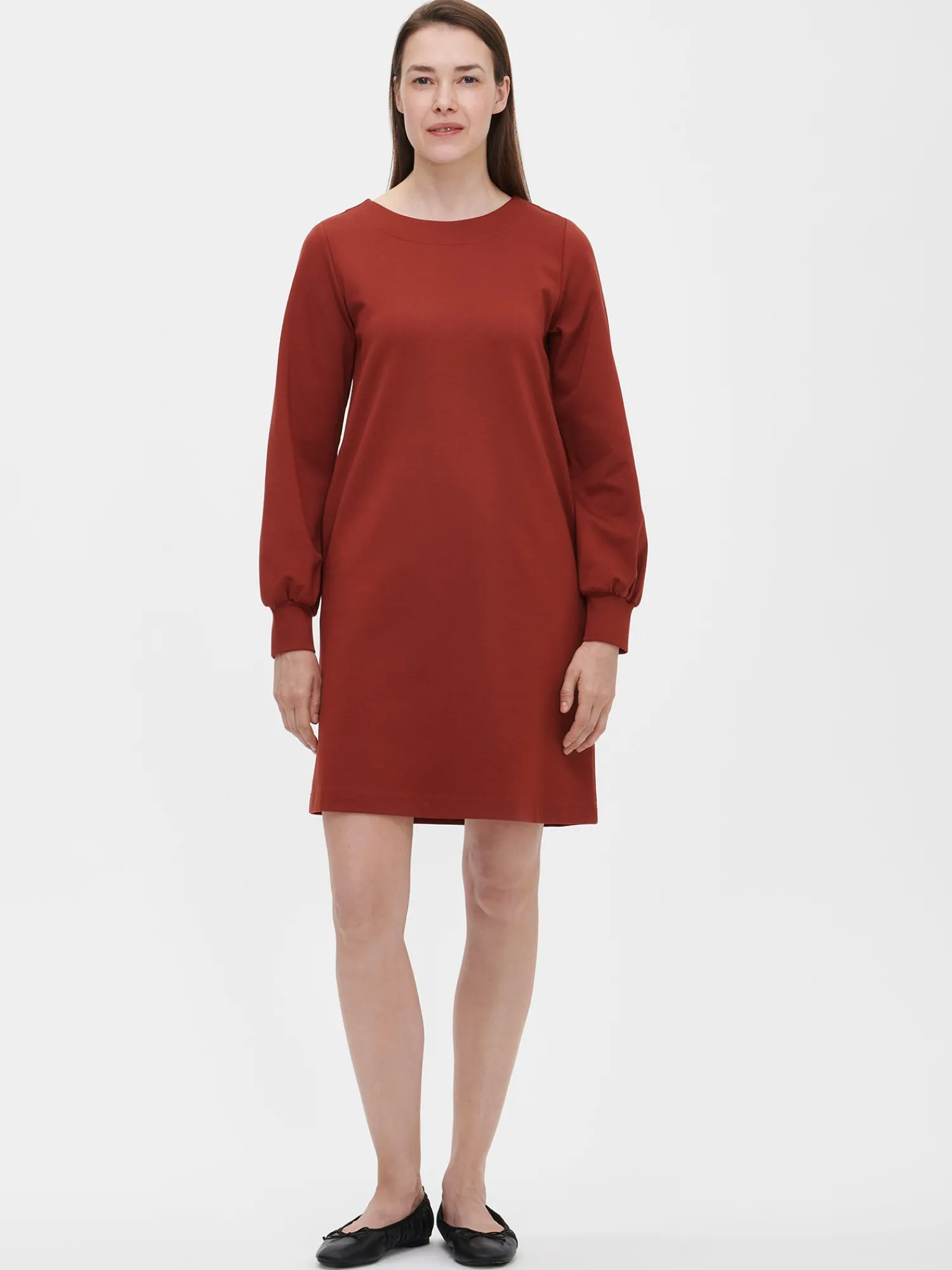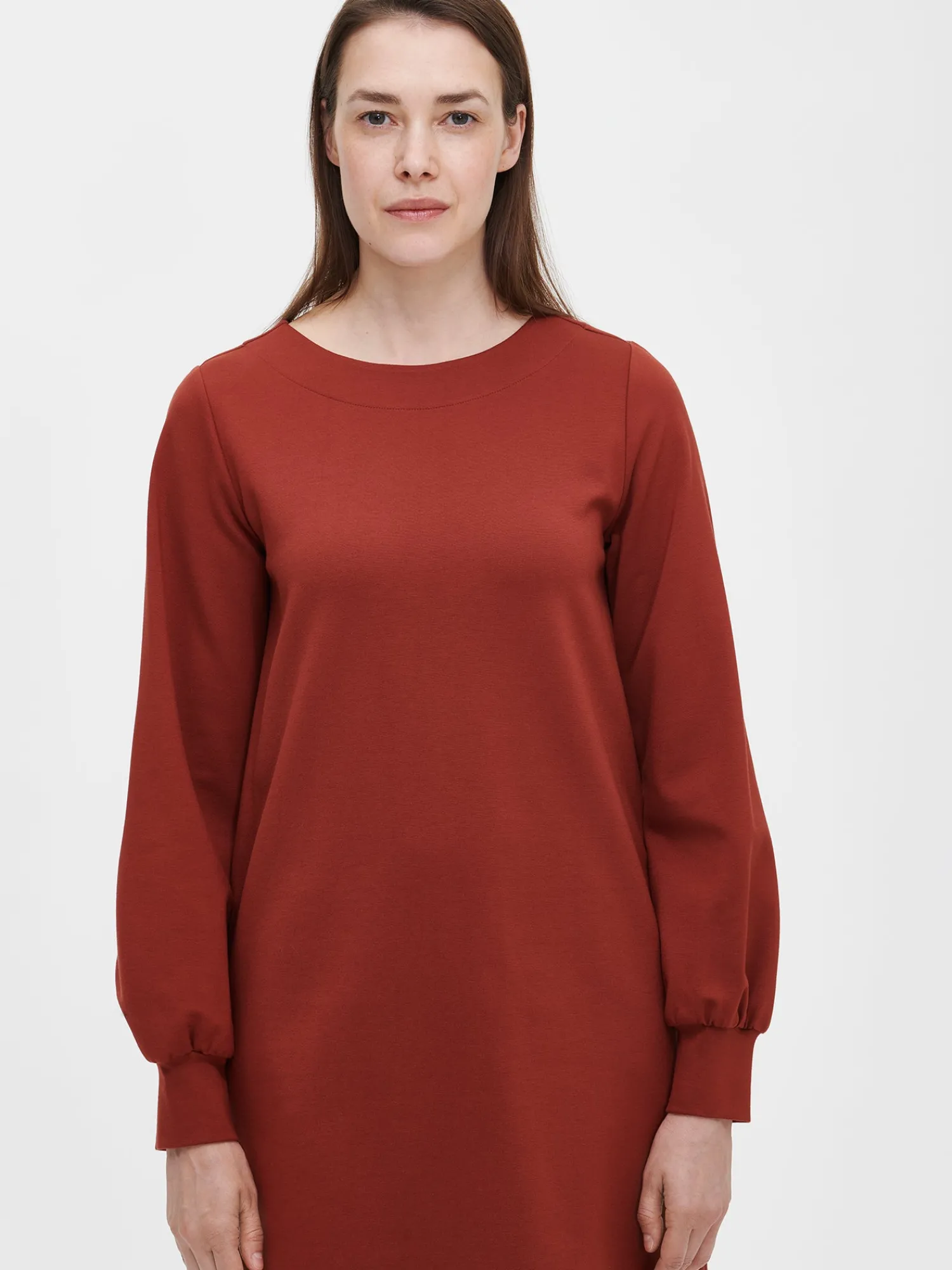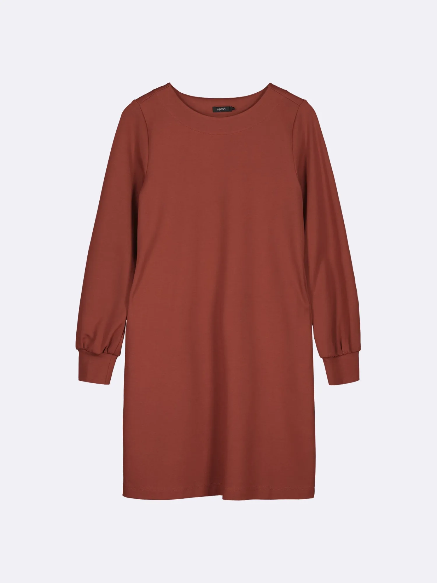Naisten tyylikäs ruskea Arkki-mekko. Mekossa on ovaali pääntie, joka on huoliteltu alavaralla. A-linjaisessa mekossa on sivutaskut ja suora helma. Täyspitkät hihat poimuttuvat kauniisti hihansuun leveän kaksinkertaisen kaitaleen yläpuolelle. Mekon pituus koossa 38 on noin 95 cm. Materiaali on laadukasta ja miellyttävän tuntuista viskoosi-polyamidi-elastaani-neulosta. Viskoosineulos on sähköistymätöntä ja helppohoitoista. Materiaalille on ominaista 3-5% kutistuminen ensimmäisessä pesussa.
