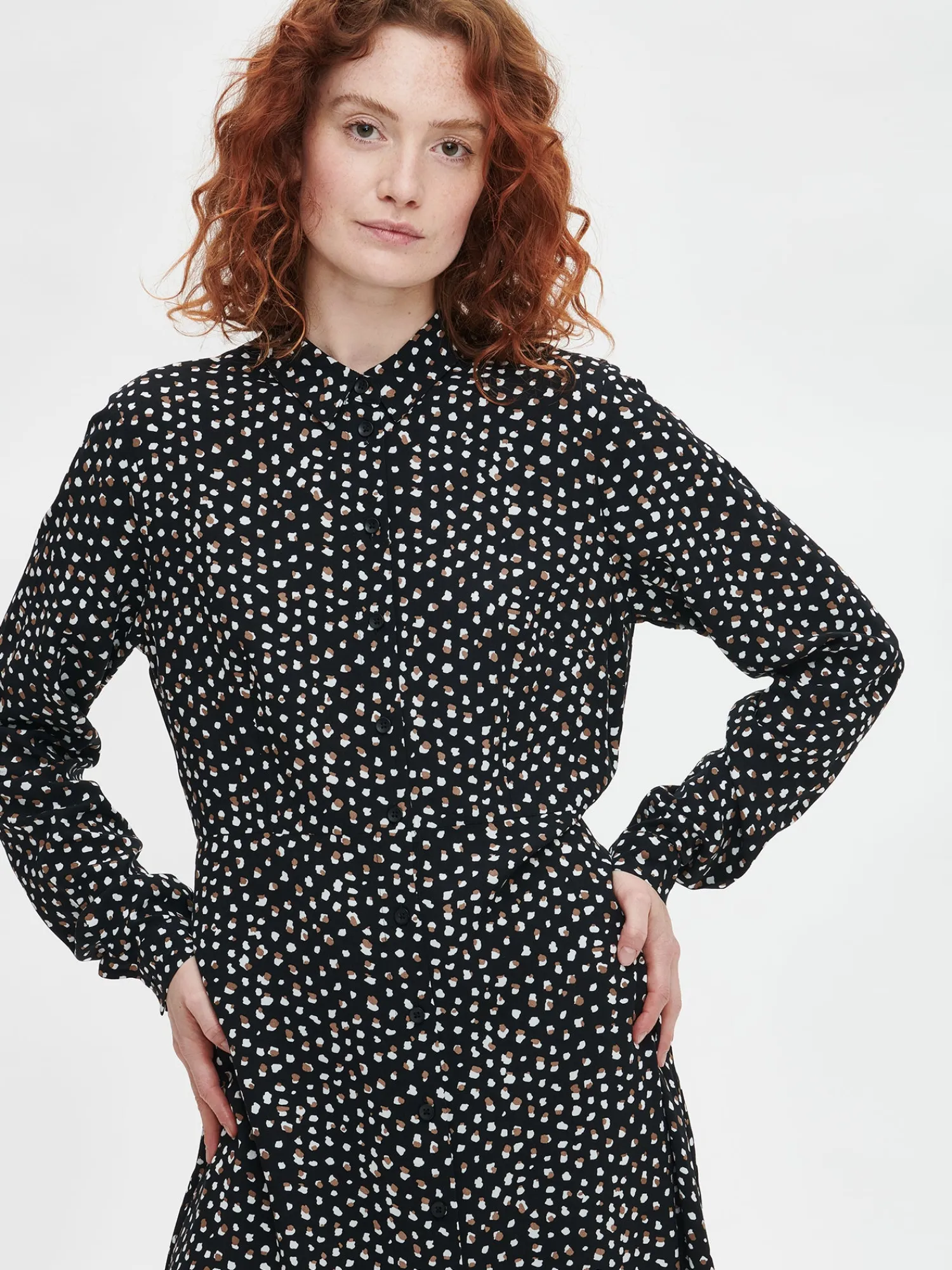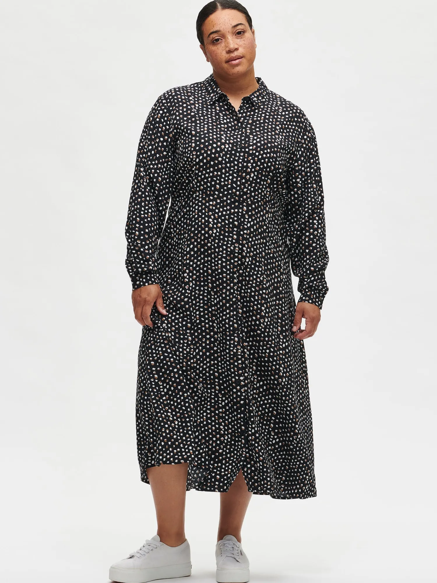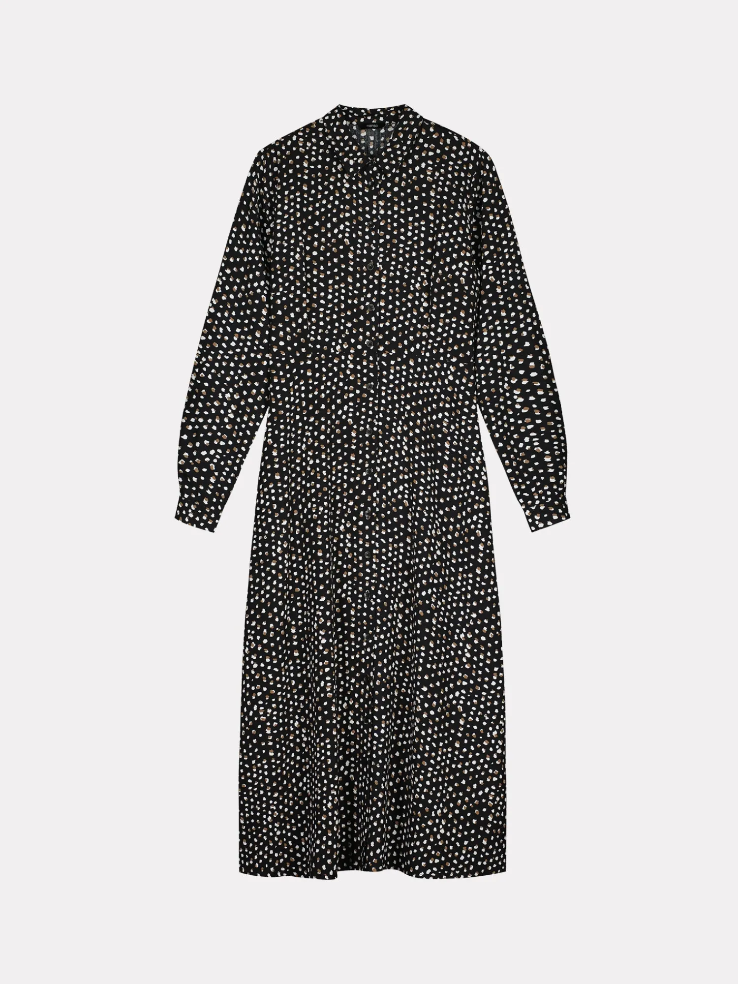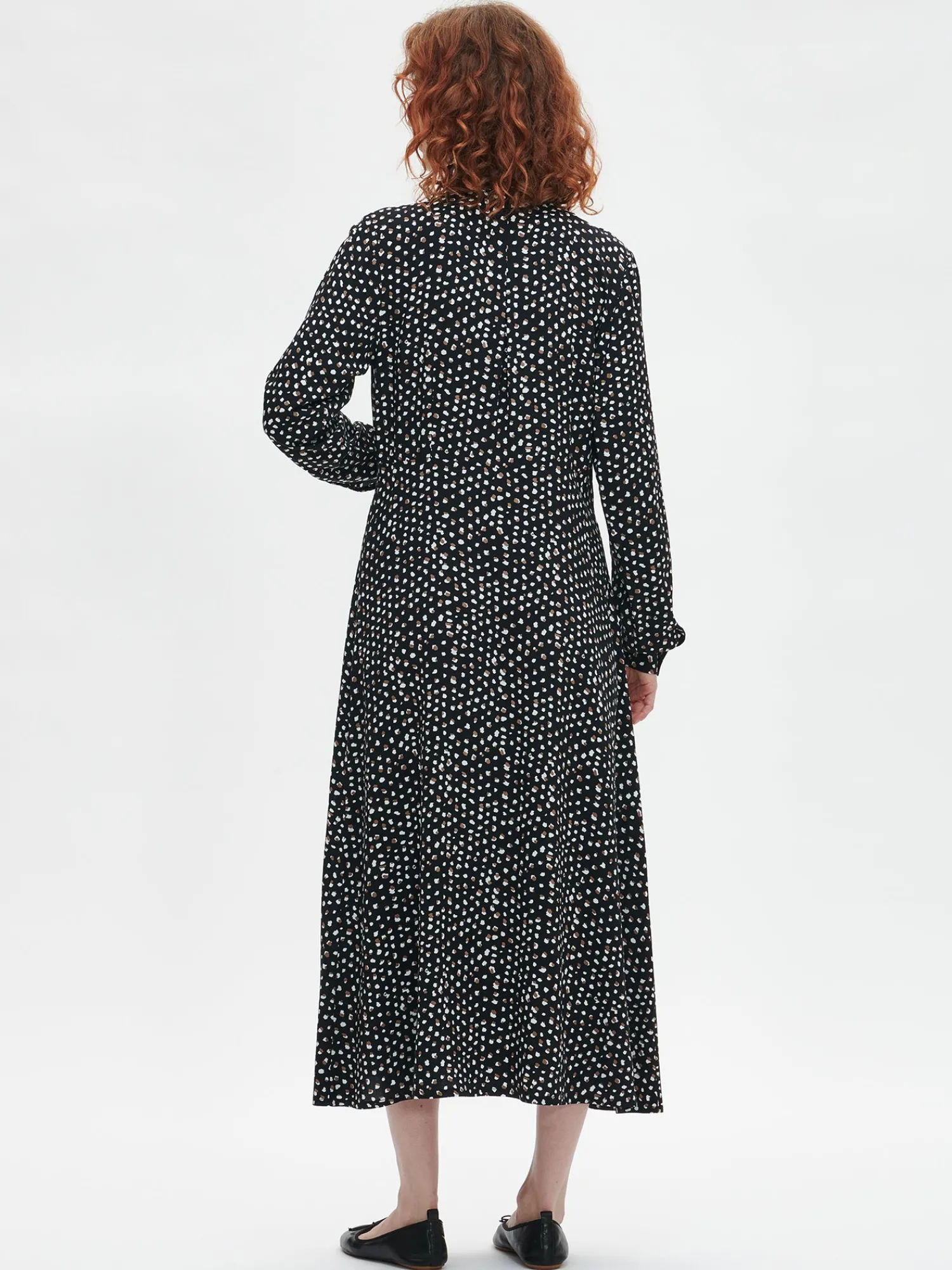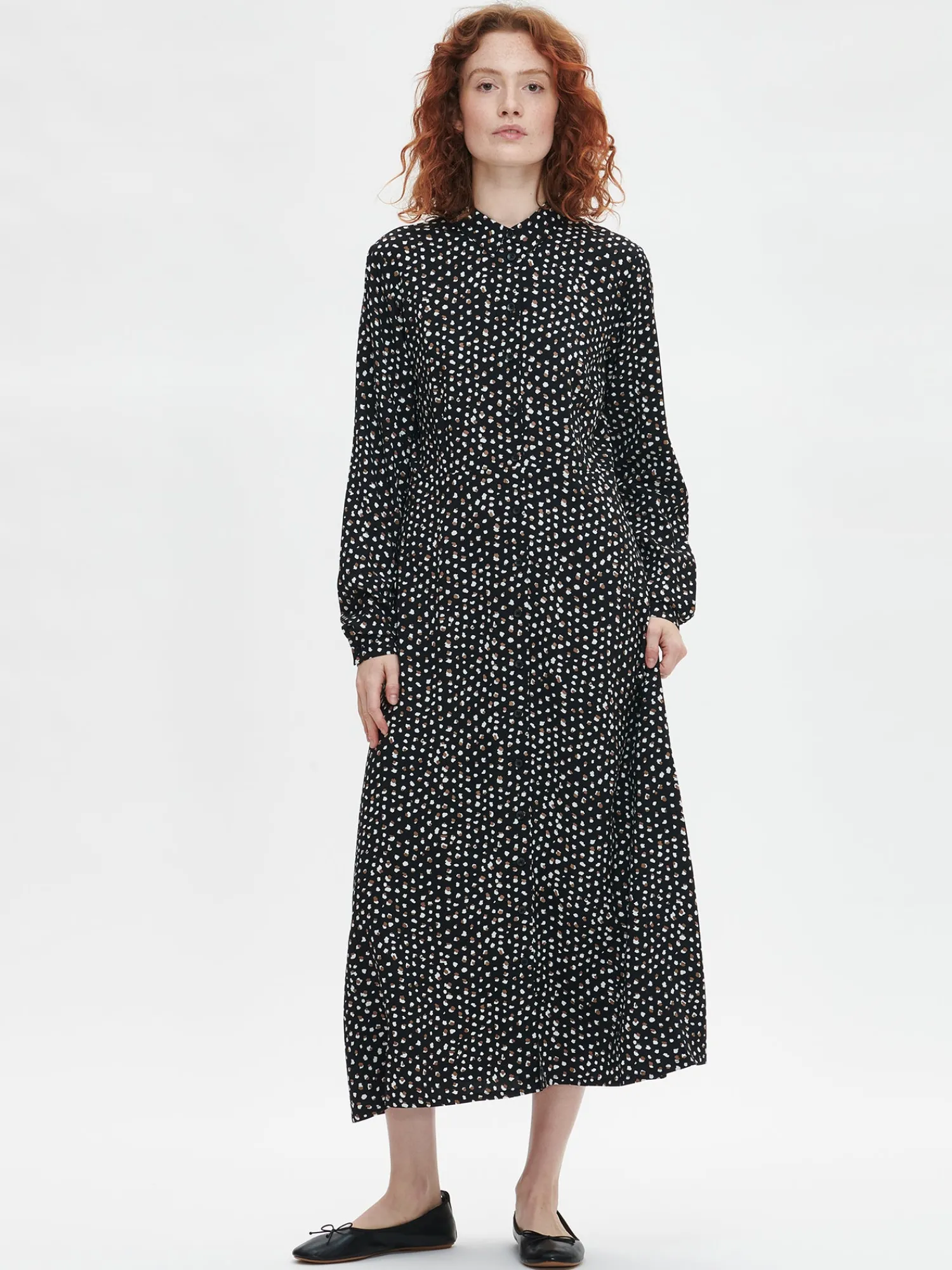 Naisten kuosillinen musta Dippi-mekko. Istuvassa, pitkässä mekossa on klassinen kaulus, edessä nappikiinnitys sekä kauniisti kellottuva helma. Hihat ovat täyspitkät ja hihansuissa on nappihalkiot. Mekon pituus koossa 38 on noin 130 cm. Materiaali on kauniisti laskeutuvaa ja kevyttä kudottua 100 % viskoosikangasta. Materiaalille on ominaista 3-5% kutistuminen ensimmäisessä pesussa.