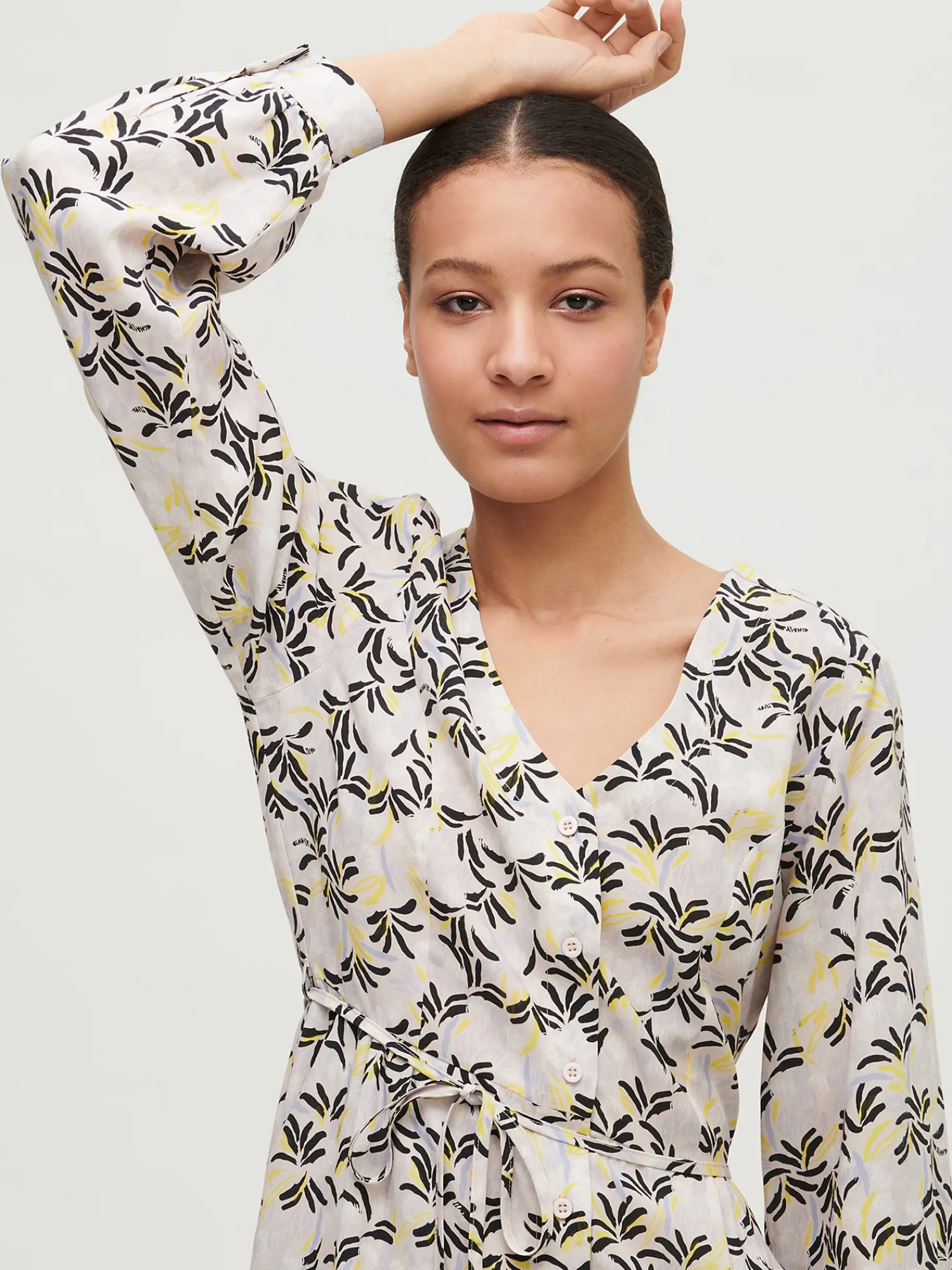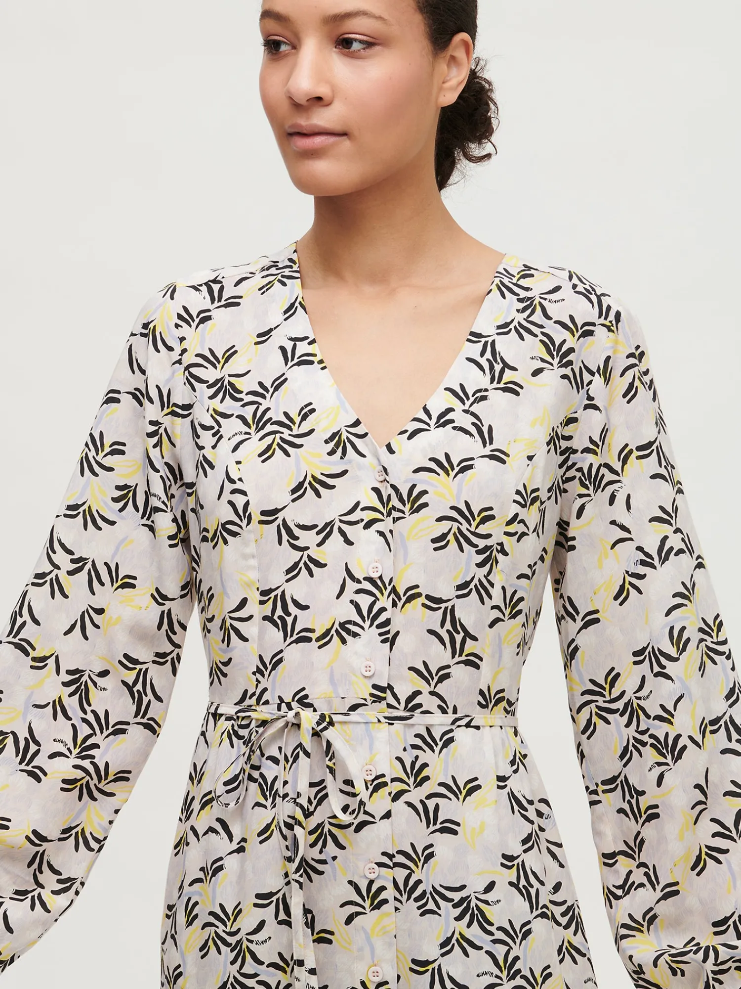 Leila (ensimmäisessä kuvassa) on 180 cm pitkä ja hänellä on päällään tuotteesta koko 36. Mallin ympärysmitat ovat: rinta 80 cm, vyötärö 63 cm ja lantio 89 cm.