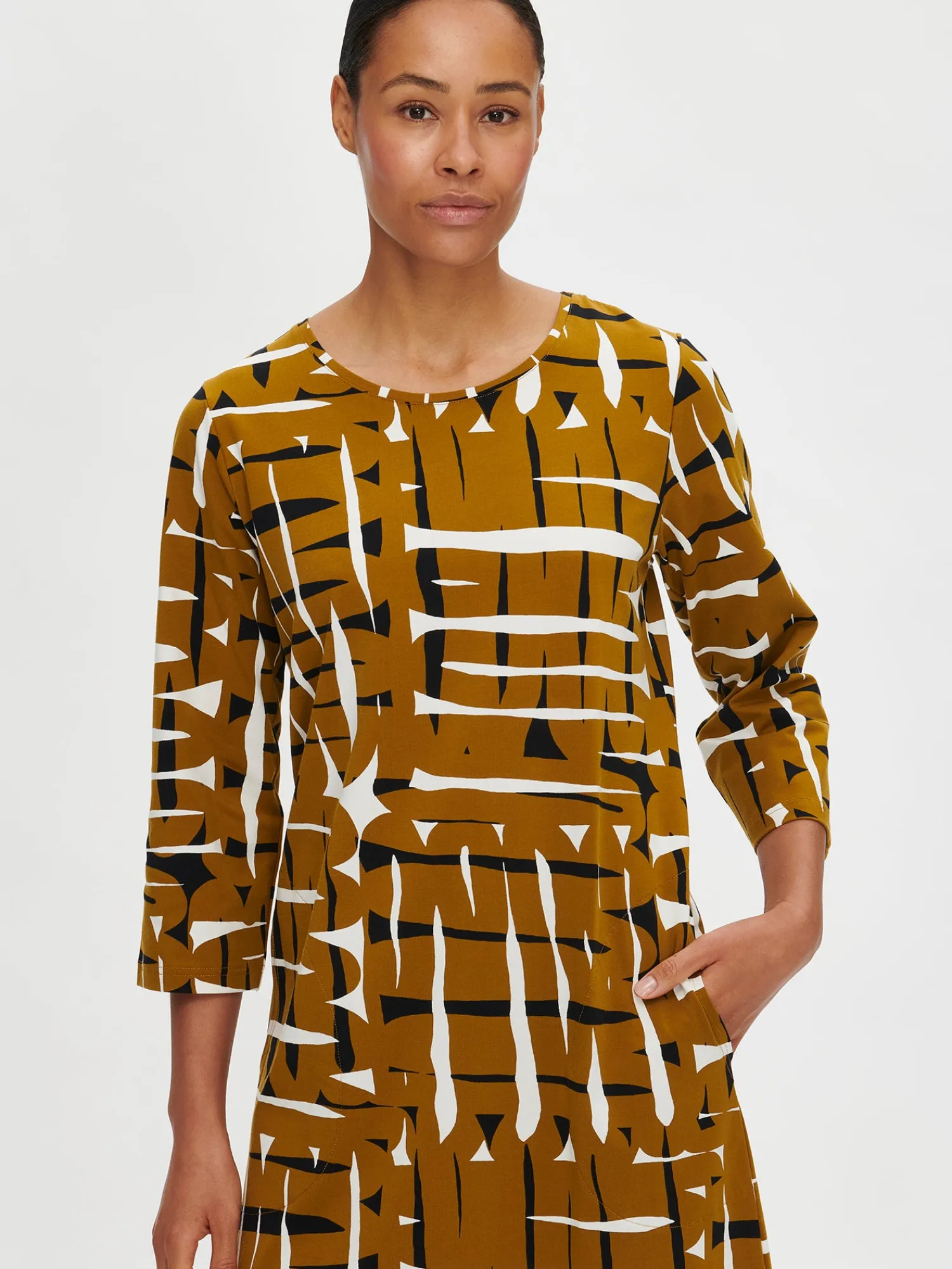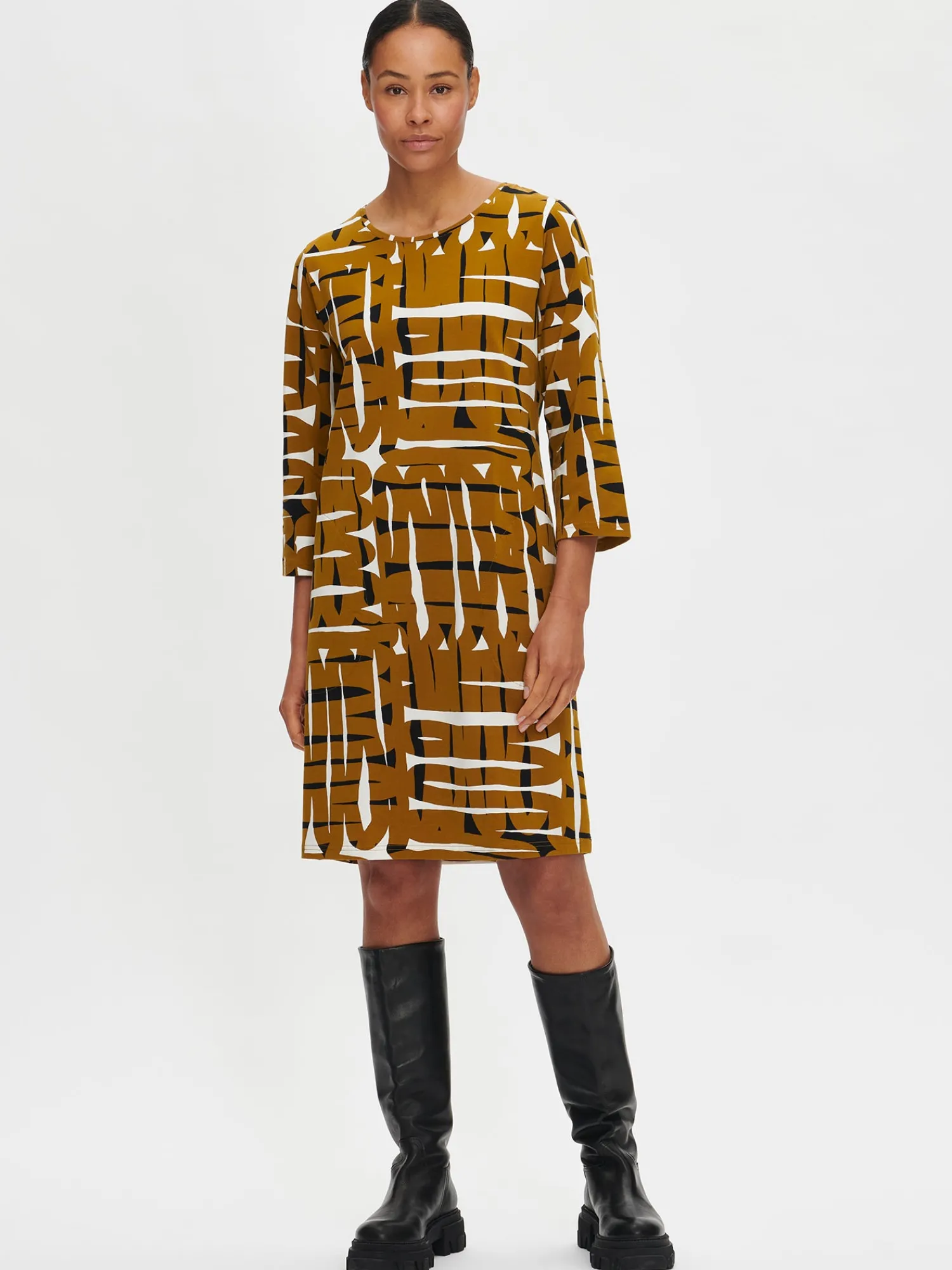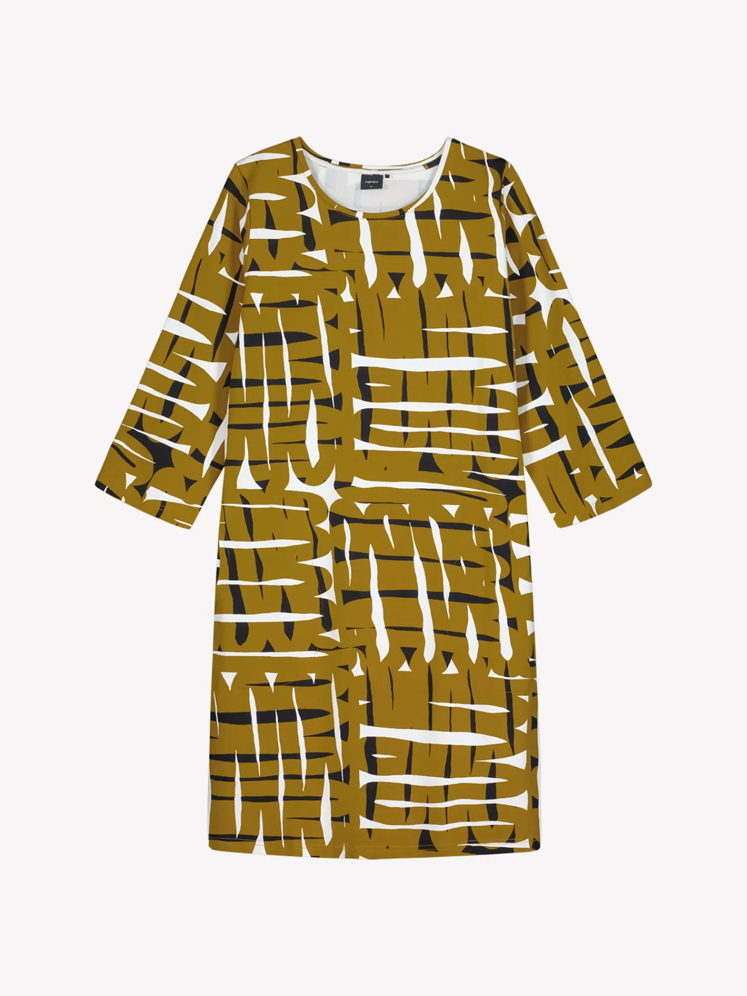 Naisten kuosillinen ruskea Kaiku-mekko. Mekossa on tereellä viimeistelty pyöreä pääntie, sivutaskut ja 3/4 pituiset suoralinjaiset hihat. Mekon pituus koossa M on noin 98 cm. Materiaali on miellyttävän tuntuista ja helppohoitoista puuvilla-elastaani-neulosta.
