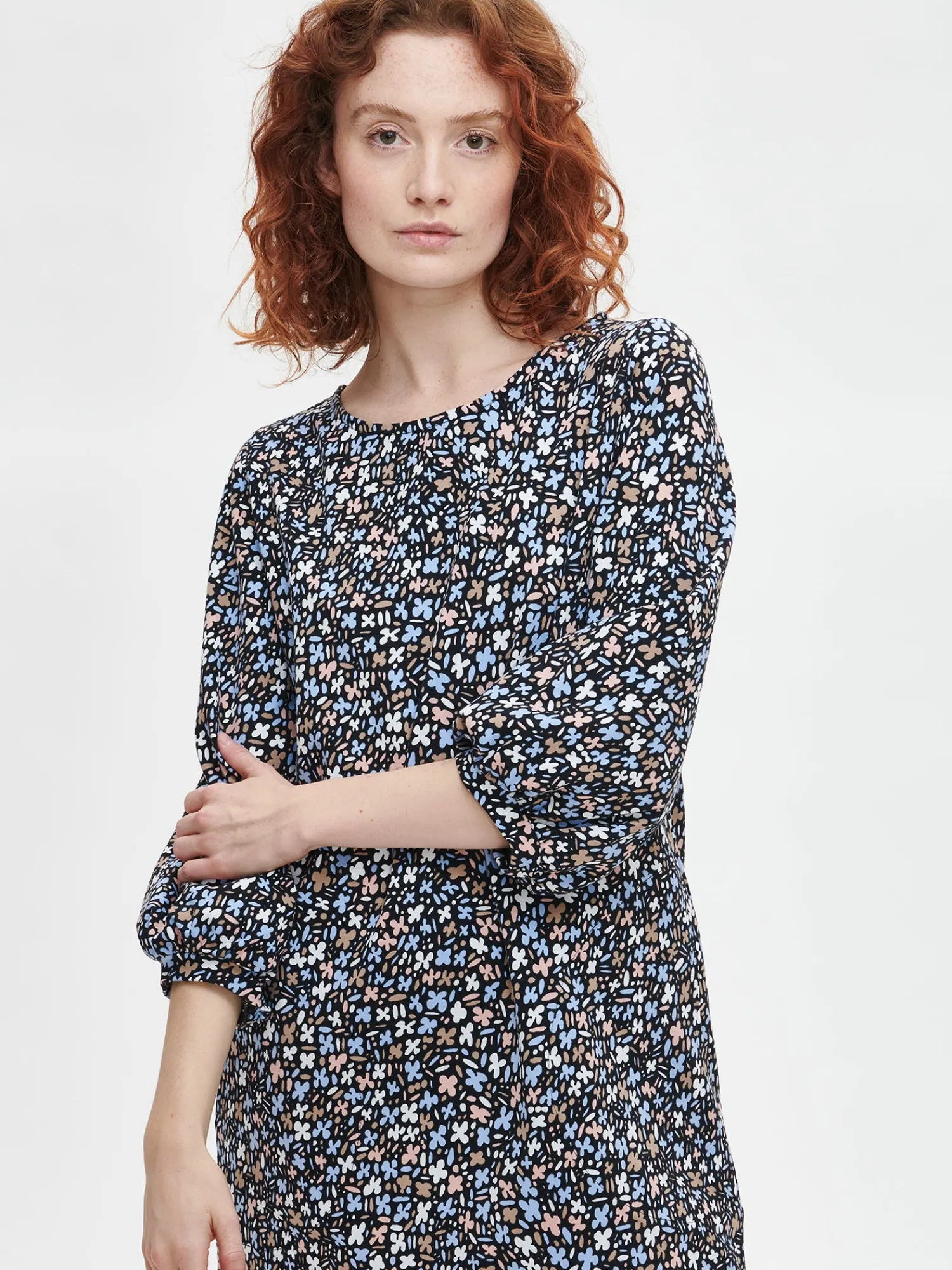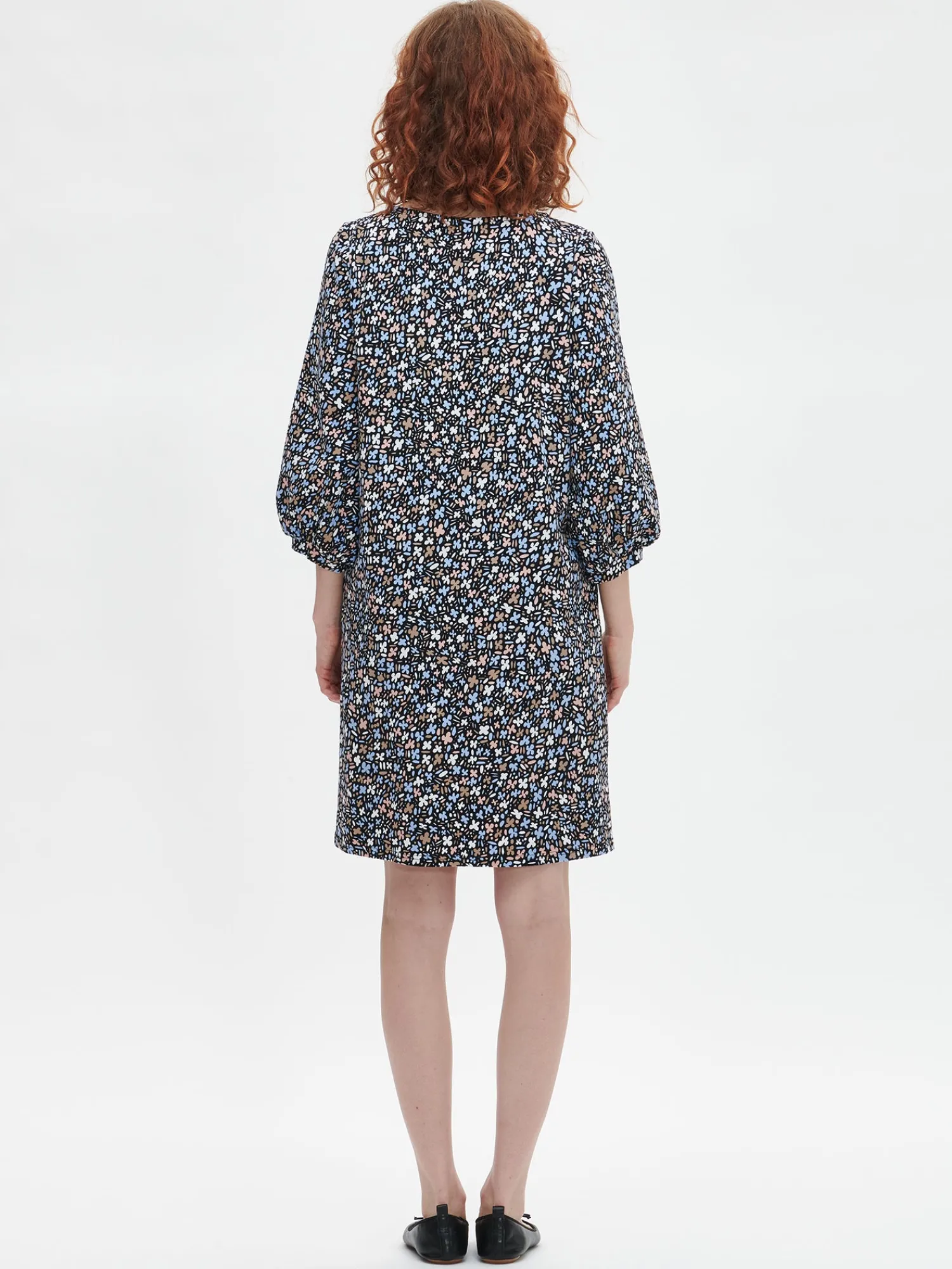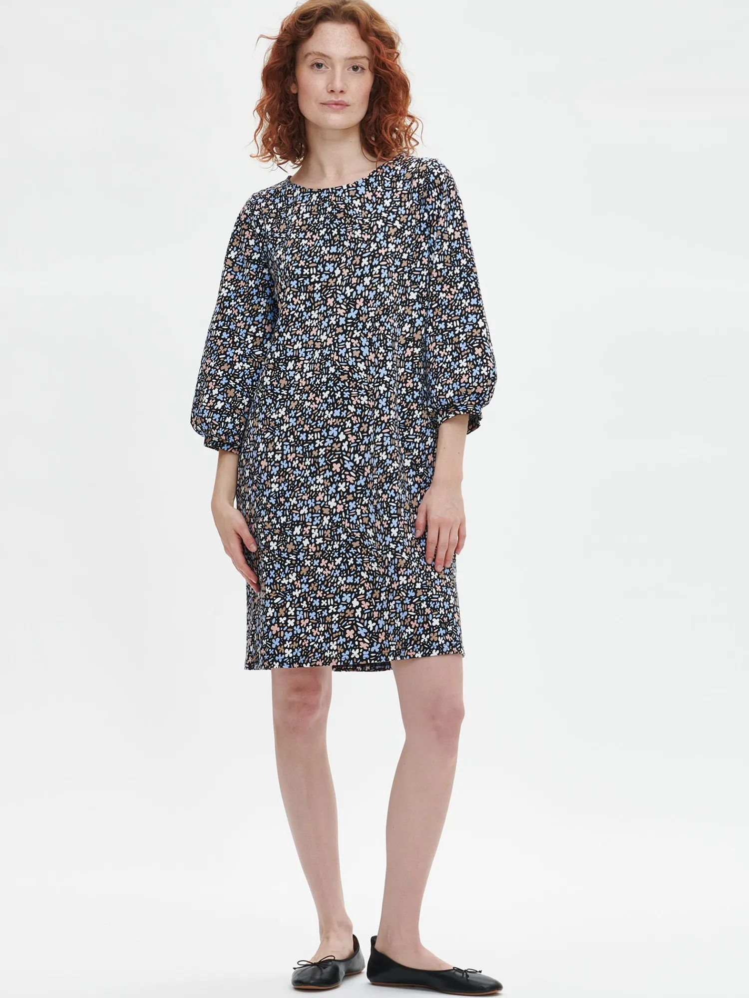 Naisten kuosillinen monivärinen Krassi-mekko. Mukavassa mekossa on venepääntie, taskut sivuissa ja suora helma. Mekossa on 3/4 pituiset hihat, jotka poimuttuvat hihansuusta. Mekon pituus koossa M on noin 95 cm. Materiaali on laadukasta ja helppohoitoista puuvilla-elastaani -neulosta, joka pysyy hyvänä pesusta toiseen.