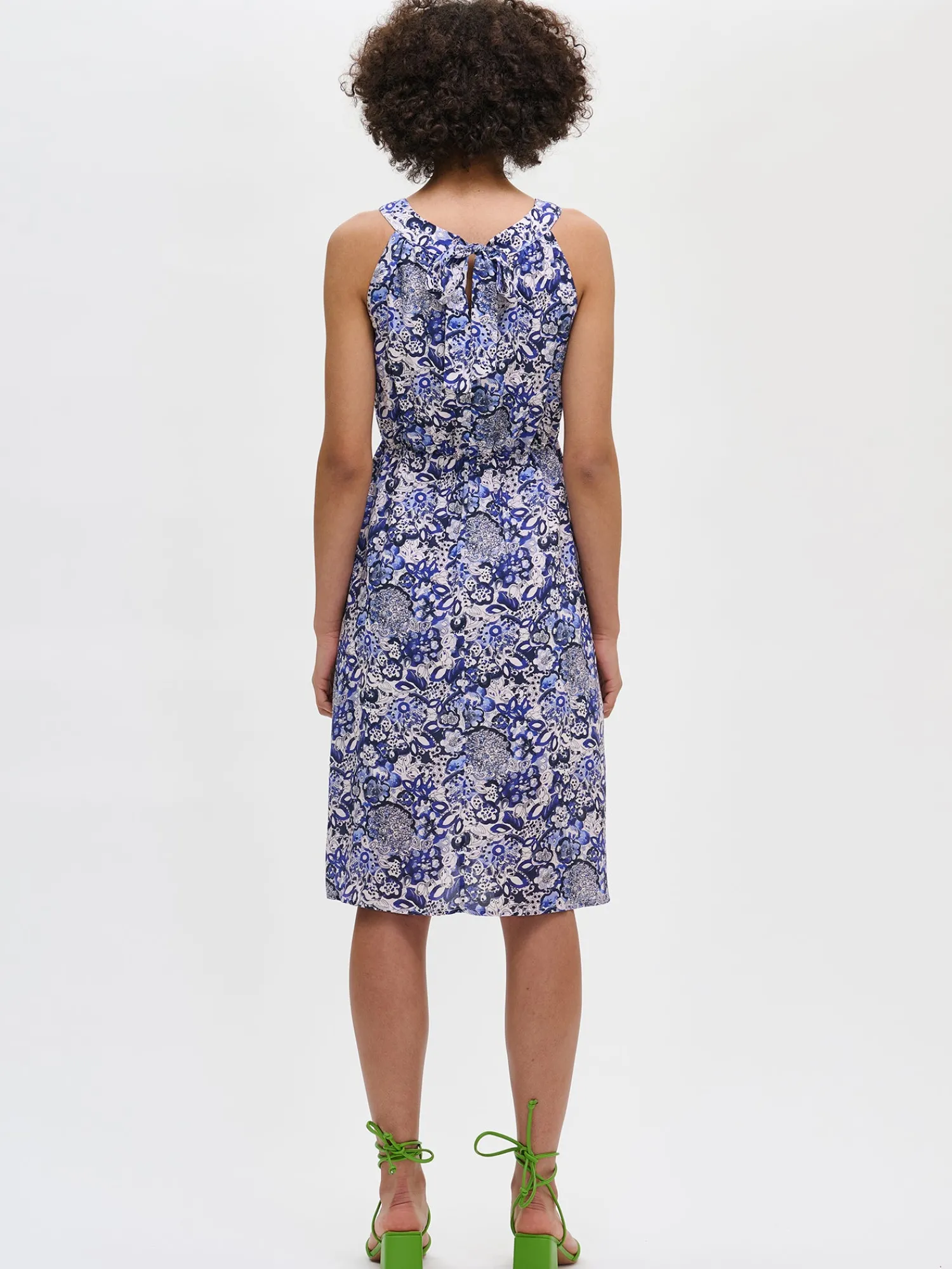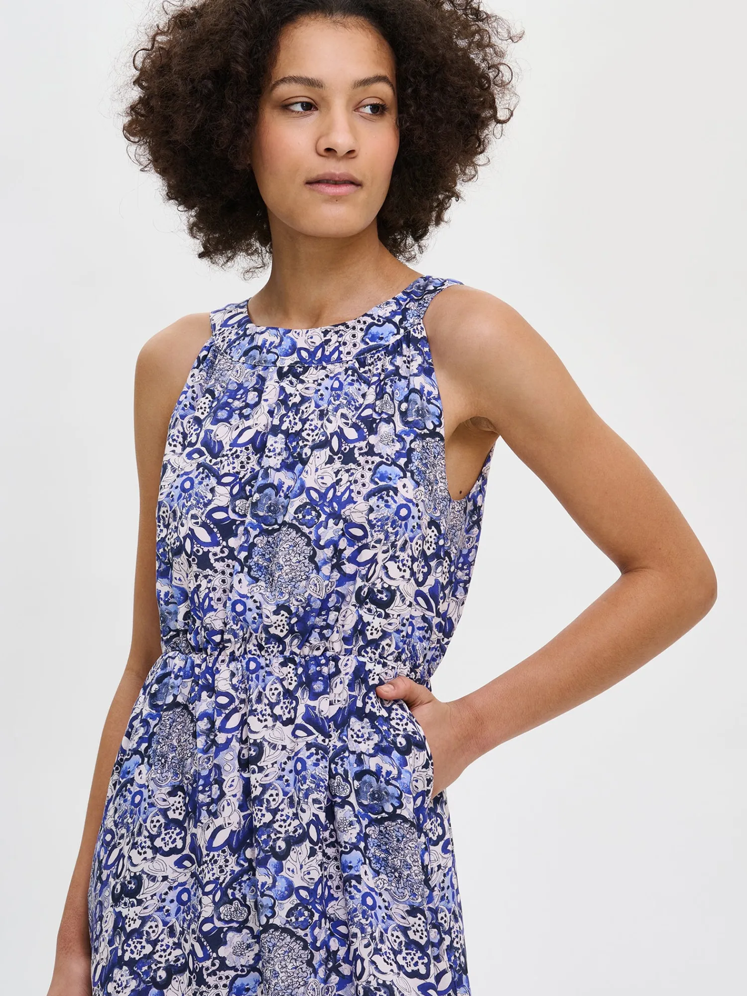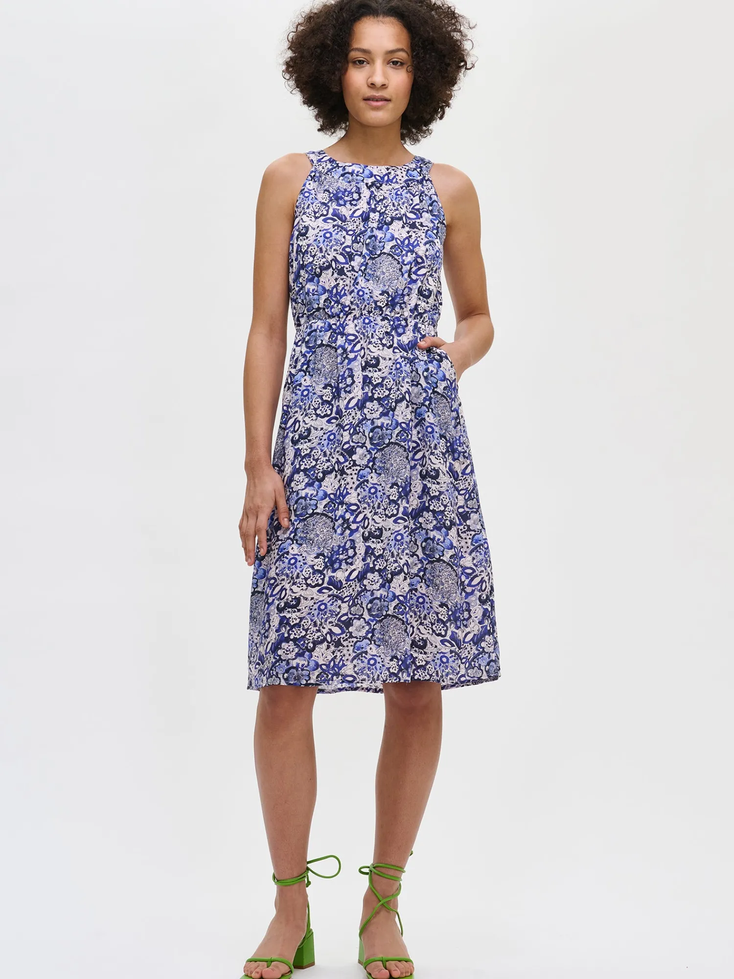 Naisten ihastuttava kuosillinen sininen Kreeta-mekko. Kauniissa mekossa on pyöreä pääntie, jonka edessä on poimutusta ja takana rusettihalkio. Hihattoman mekon vyötäröllä on kuminauha ja sivuissa on taskut. Mekon helma kellottuu kauniisti. Mekko on vuoritettu yläosasta polven korkeudelle. Mekon pituus koossa 38 on noin 110 cm. Materiaali on kevyttä ja läpikuultavaa miellyttävän tuntuista LYOCELL TENCEL™ -kangasta. Materiaalille on ominaista 3-5% kutistuminen ensimmäisessä pesussa.