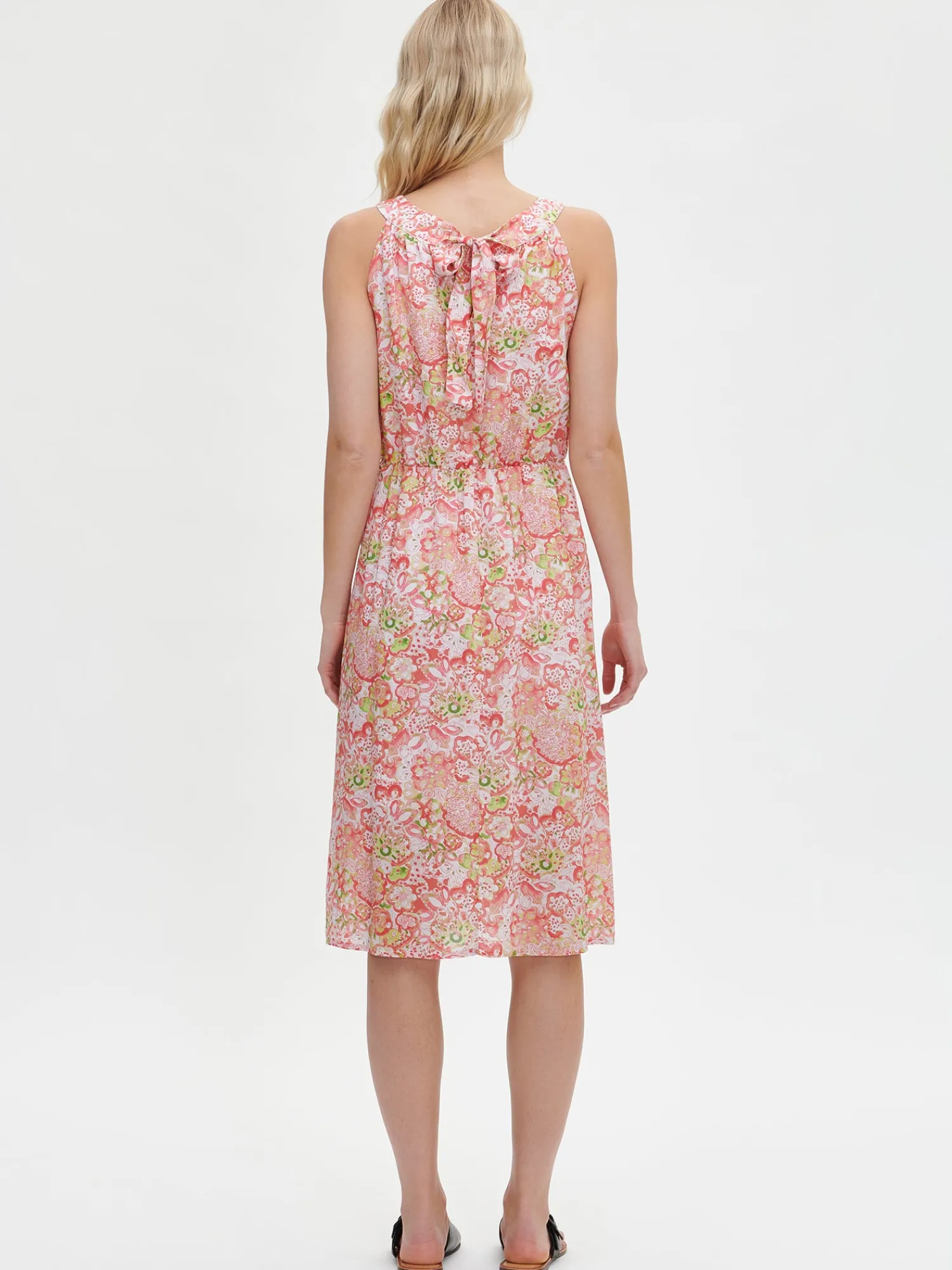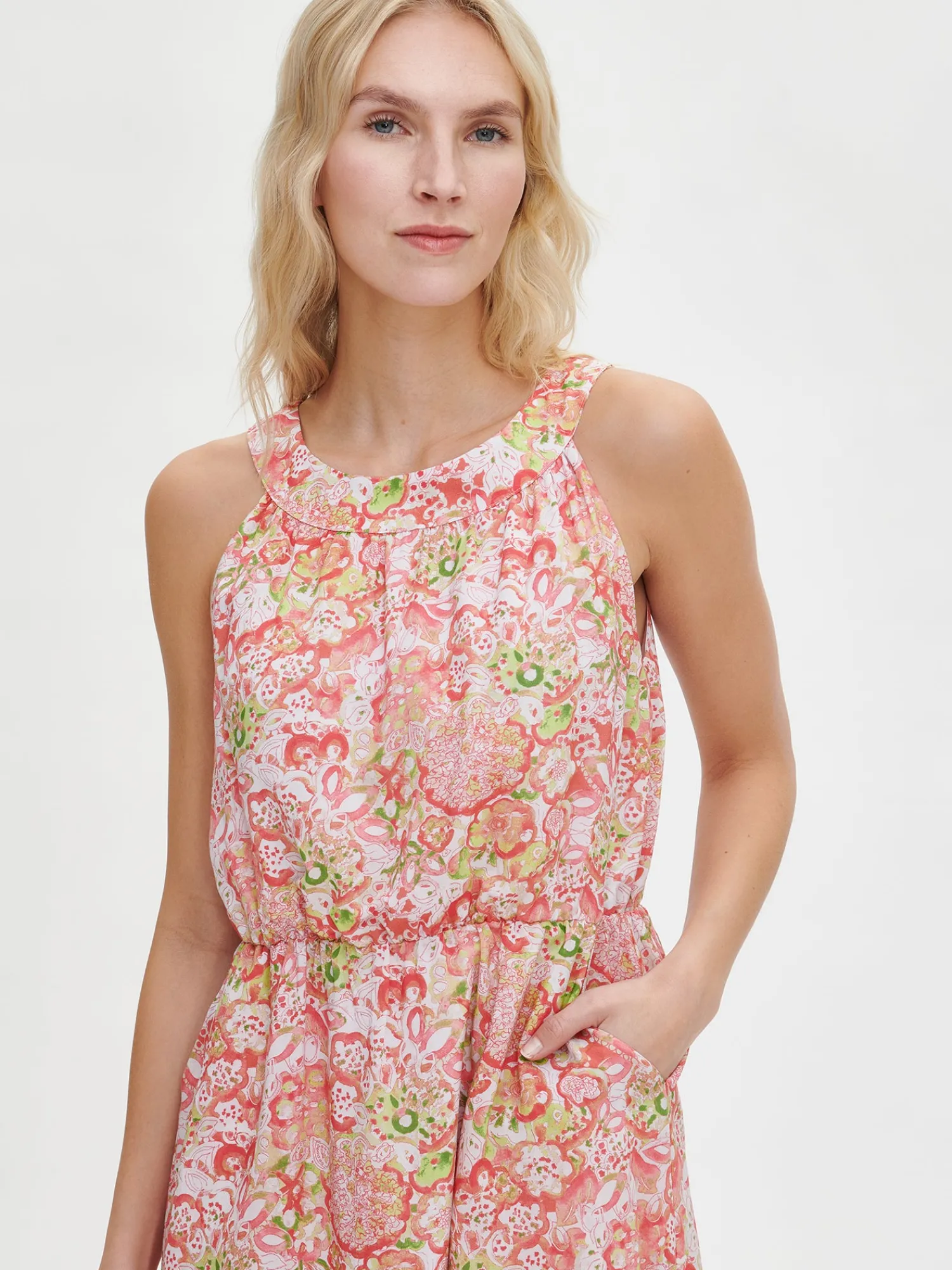 Naisten ihastuttava monivärinen Kreeta-mekko. Kauniissa mekossa on pyöreä pääntie, jonka edessä on poimutusta ja takana rusettihalkio. Hihattoman mekon vyötäröllä on kuminauha ja sivuissa on taskut. Mekon helma kellottuu kauniisti. Mekko on vuoritettu yläosasta polven korkeudelle. Mekon pituus koossa 38 on noin 110 cm. Materiaali on kevyttä ja läpikuultavaa miellyttävän tuntuista LYOCELL TENCEL™ -kangasta. Materiaalille on ominaista 3-5% kutistuminen ensimmäisessä pesussa.