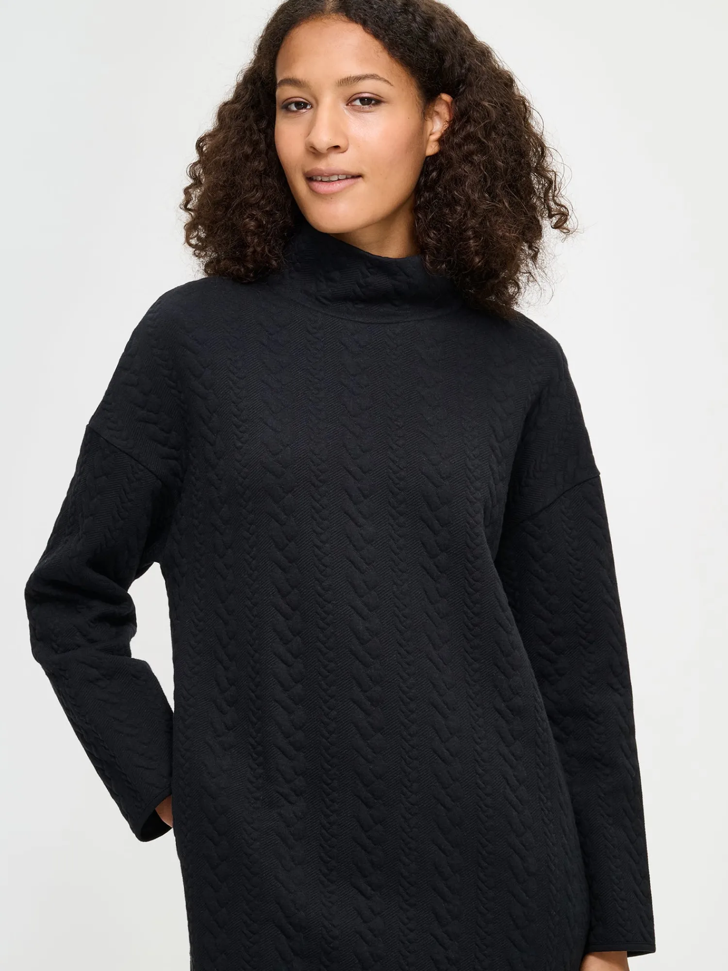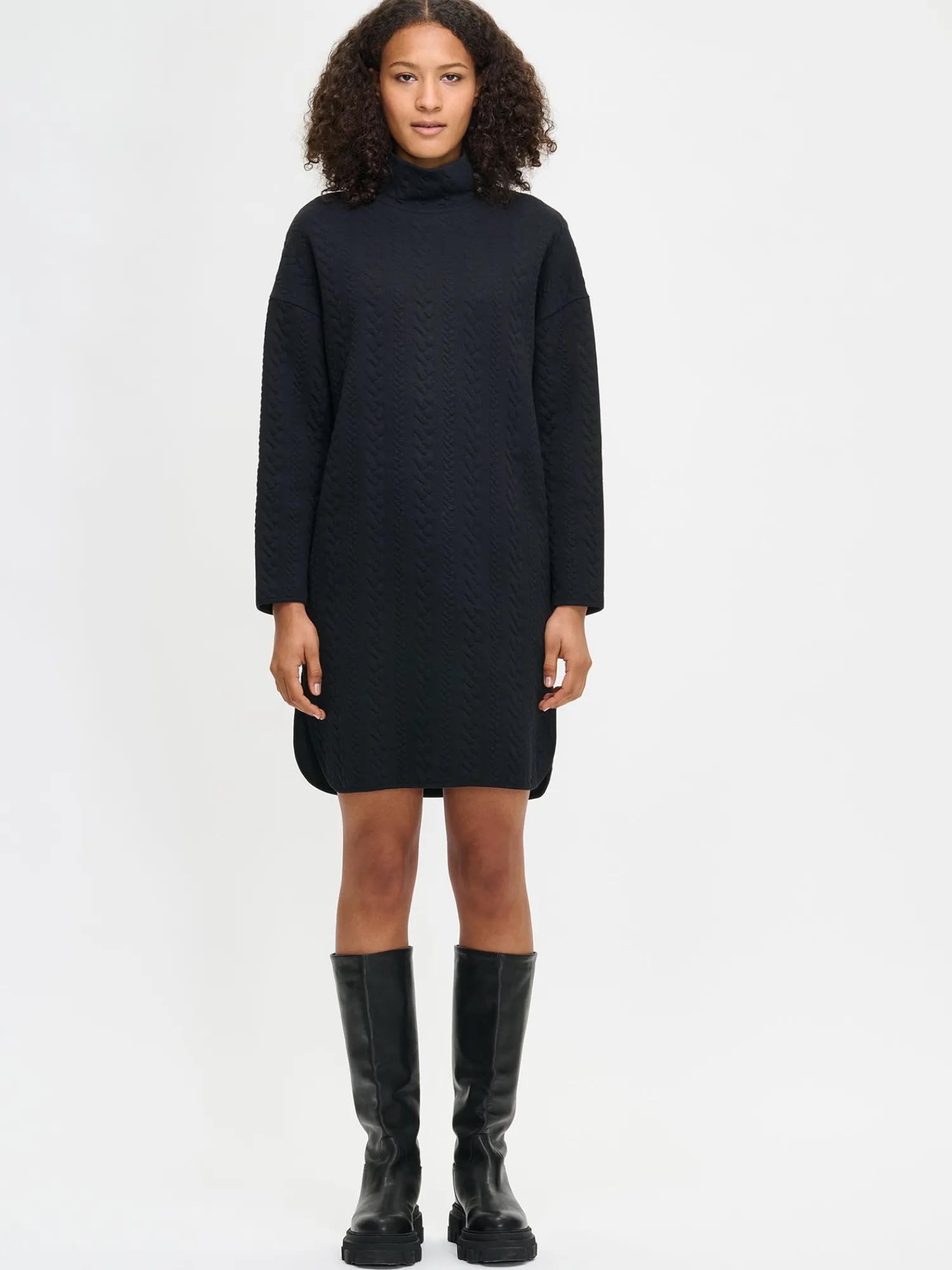 Naisten mukava musta Letti-mekko poolokauluksella. Mekossa on pudotettu olkalinja, täyspitkät hihat ja sivutaskut. Helmassa on pyöristetyt halkiot. Mekon pituus koossa M on noin 97 cm. Ryhdikäs palmikkomaisesti pintakuvioitu materiaali on miellyttävää puuvilla-elastaanineulosta. Materiaalille on ominaista 3-5% kutistuminen ensimmäisessä pesussa.