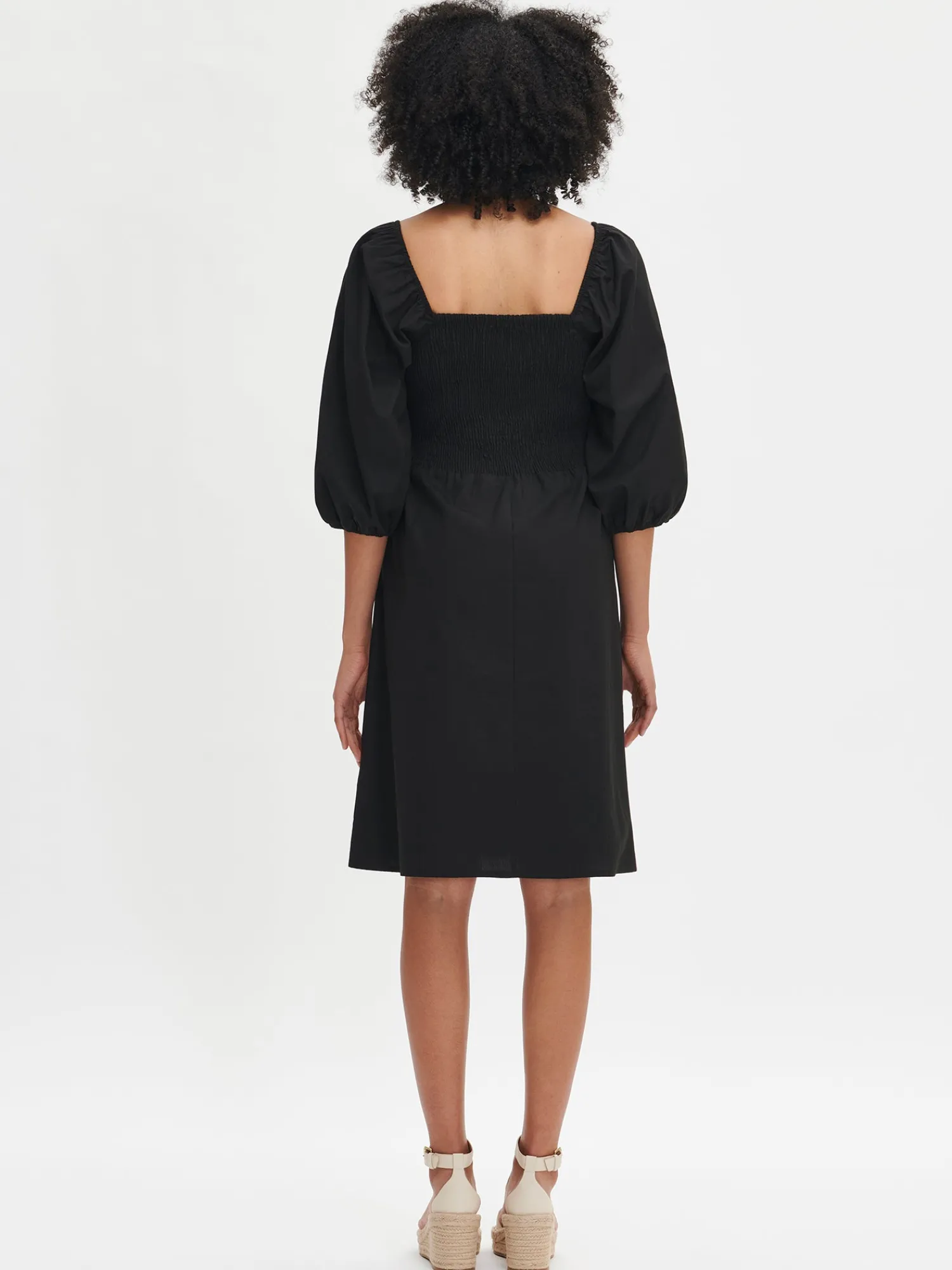Naisten musta lyhyt Luisa-mekko. Klassinen musta mekko on varma valinta sekä juhlaan että arkeen. Mekossa on neliskanttinen pääntie, smokkipoimutettu yläosa ja kellotettu helma. Mekossa on 3/4 pituiset hihat, jotka poimuttuvat kauniisti olalta ja hihansuusta. Mekon pituus koossa 38 on noin 100 cm. Materiaali on kevyttä, kauniisti laskeutuvaa puuvillapopliinikangasta.