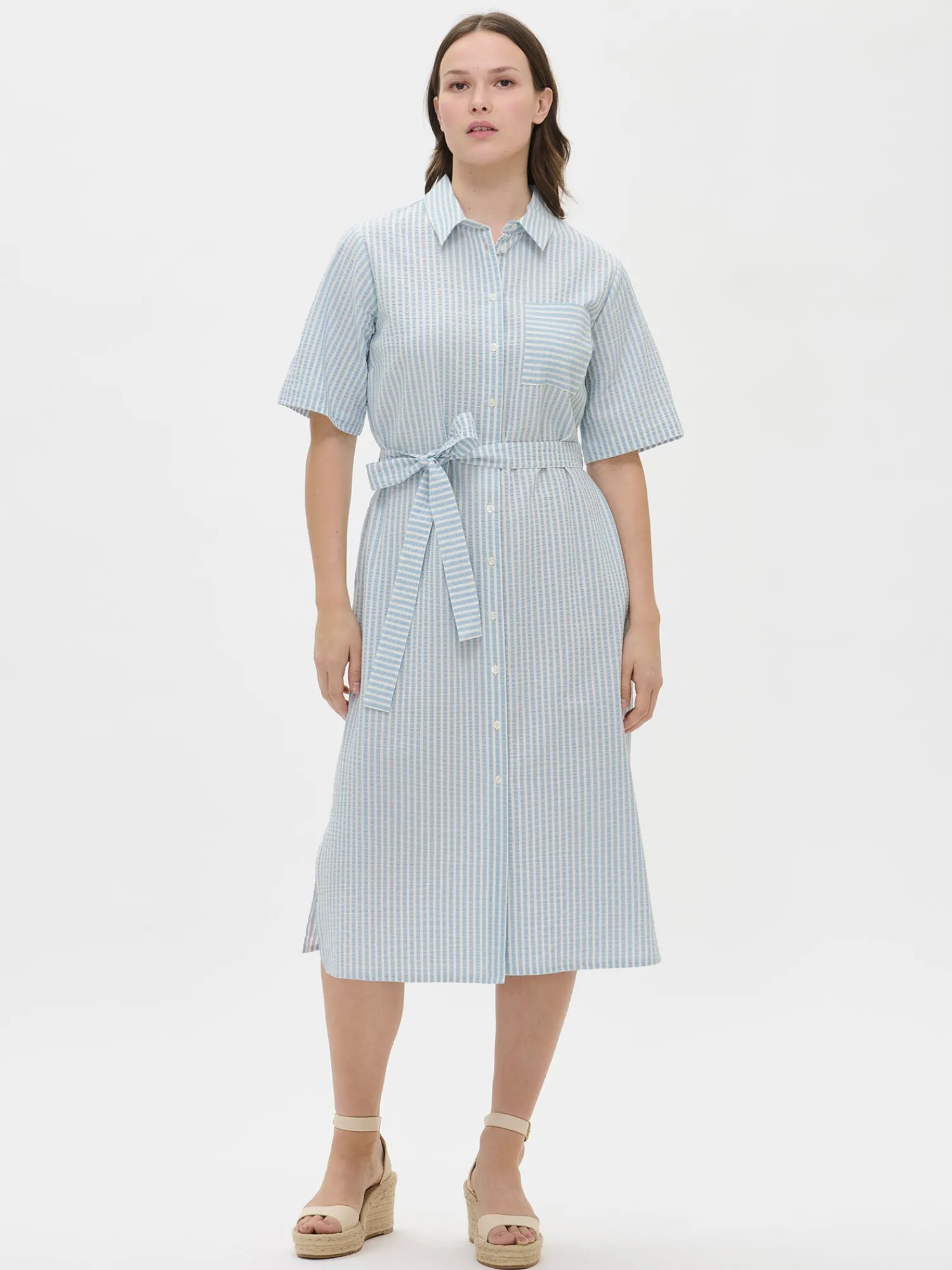 Naisten raidallinen vaaleansininen Marea-paitamekko. Raikas raitamekko on klassinen ja ajaton luottovaate kesään. Rennossa mekossa on pudotettu olkalinja, kaulus ja napit edessä. Mekossa on yksi rintatasku ja sivutaskut. Leveät hihat ovat 2/4 pituiset. Vyötäröllä on irrotettava vyö ja helmassa pitkät halkiot. Mekon pituus koossa 38 on noin 120 cm. Materiaali on kevyttä kudottua puuvilla-viskoosi-elastaanikangasta, jossa on kaunis pintastruktuuri.