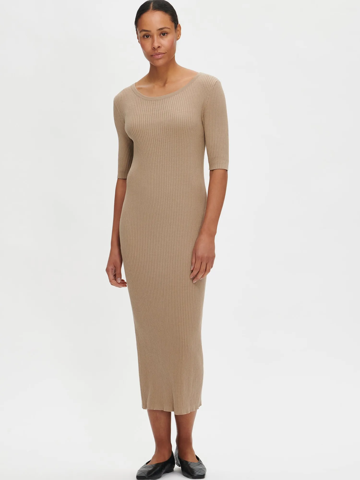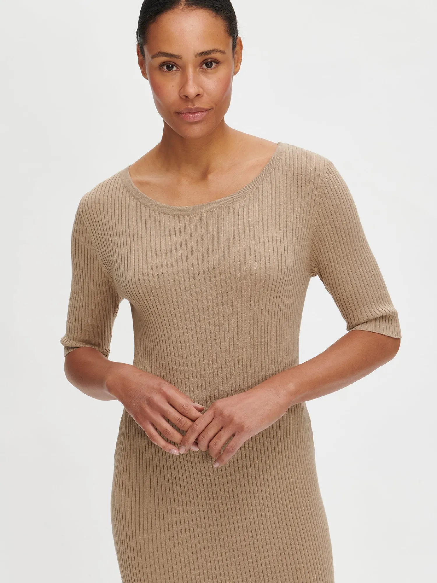 Naisten yksinkertaisen tyylikäs ruskea Lea ribbimekko venepääntiellä. Kaunis ja ajaton neulemekko on aina varma valinta pukeutumiseen. Laadukkaasta luomupuuvillan ja silkin sekoitteesta muotoonneulotussa mekossa on 2/4 pituiset hihat. Mekon pituus koossa M on noin 125 cm.