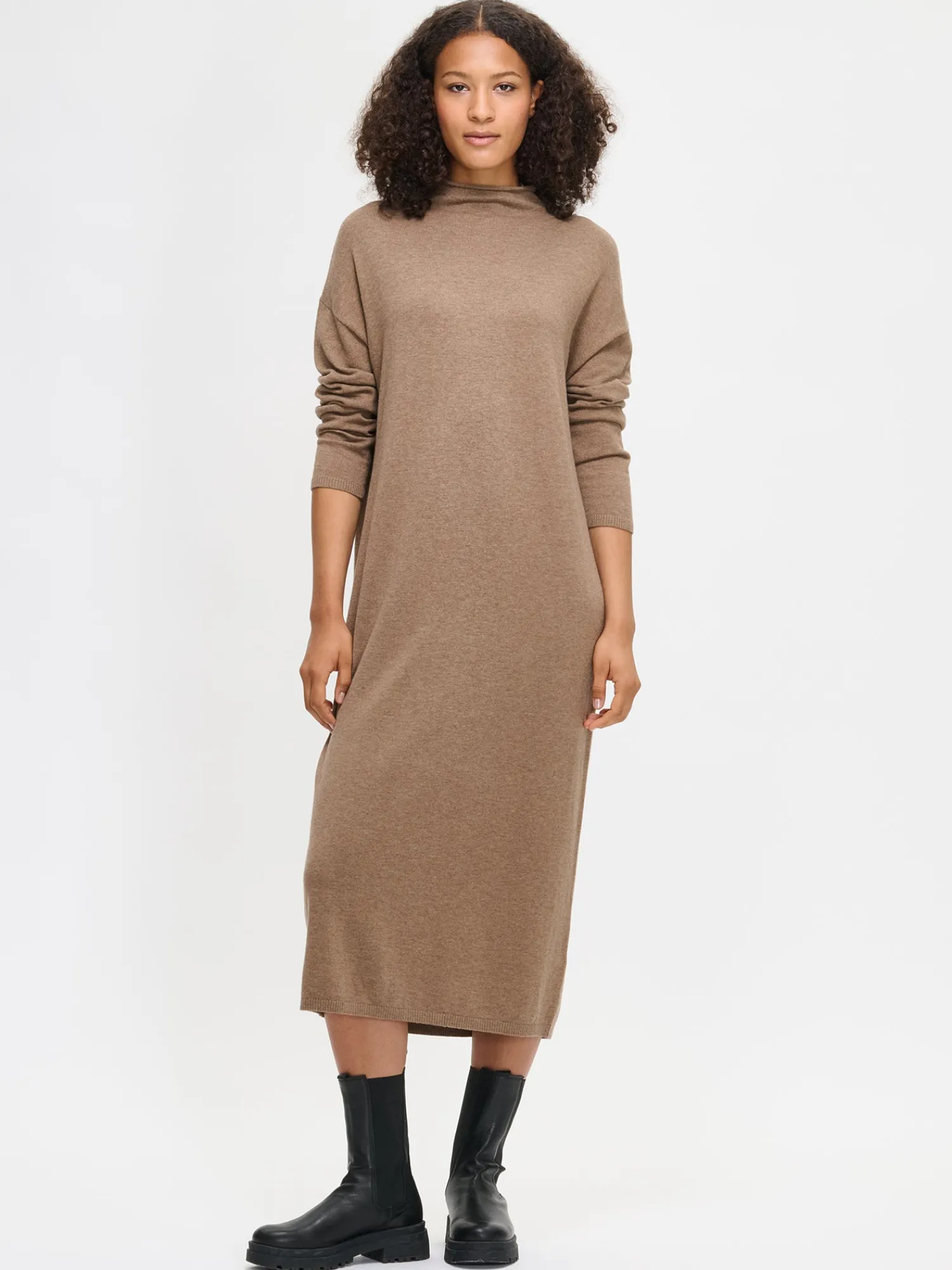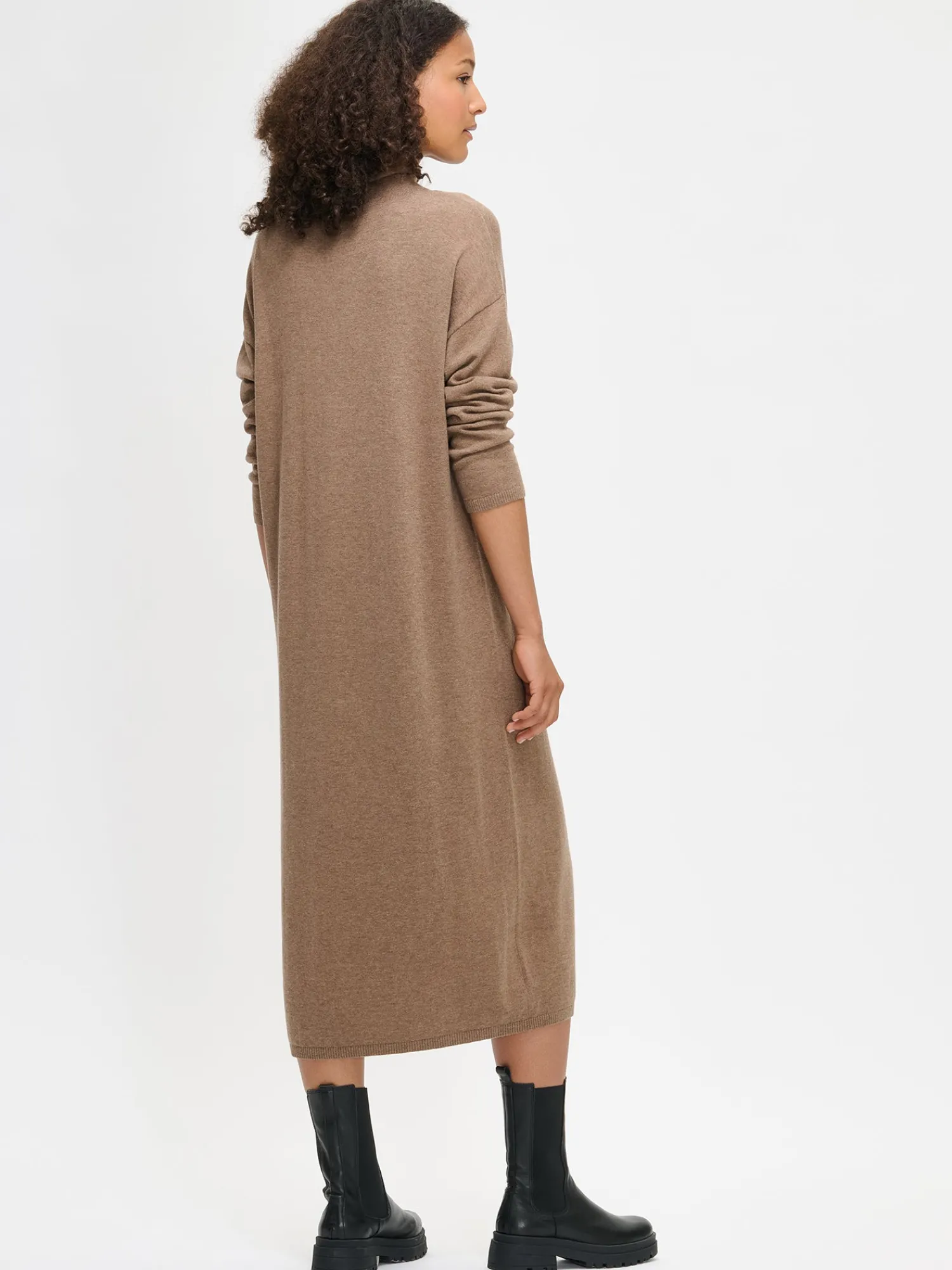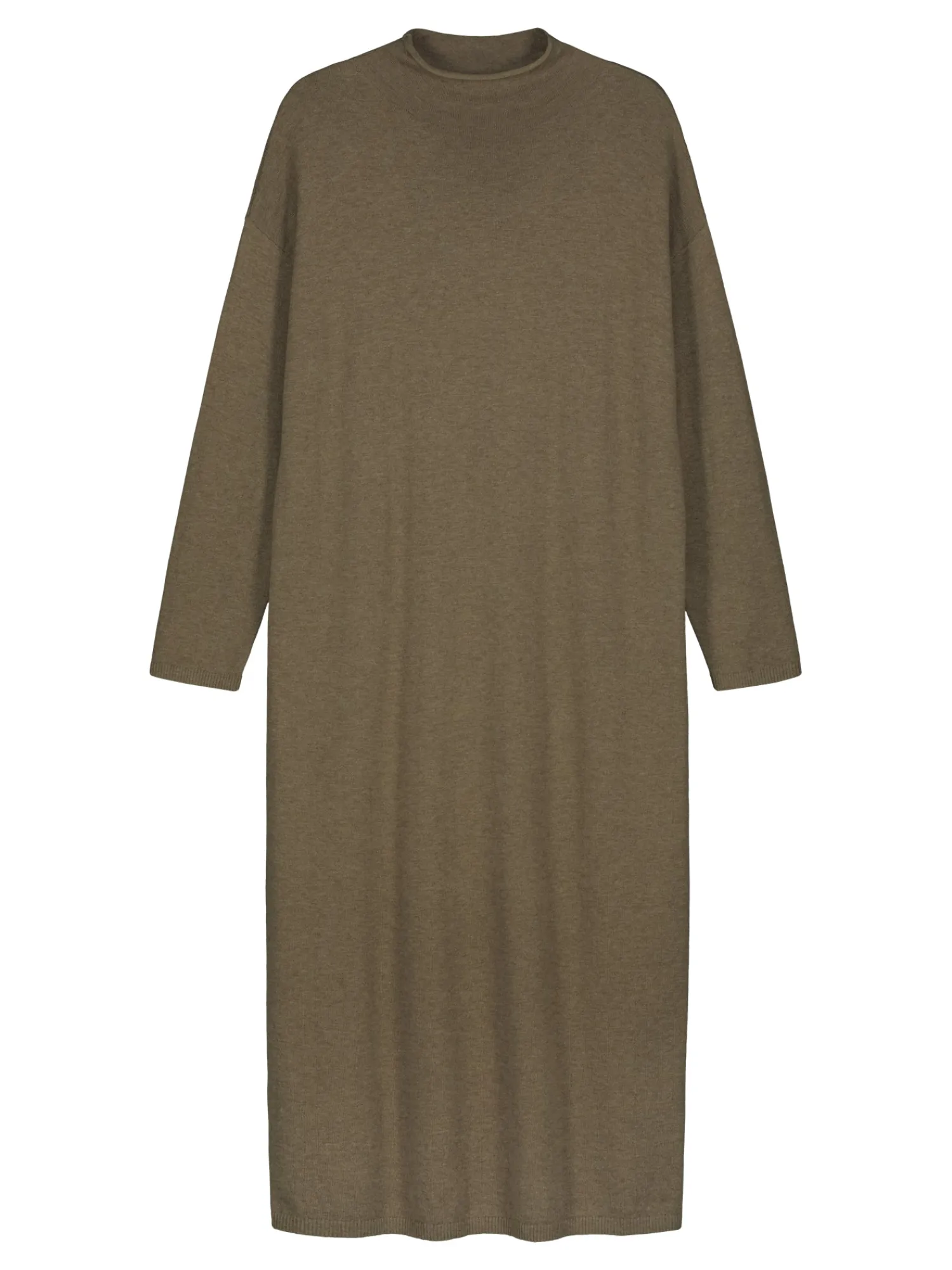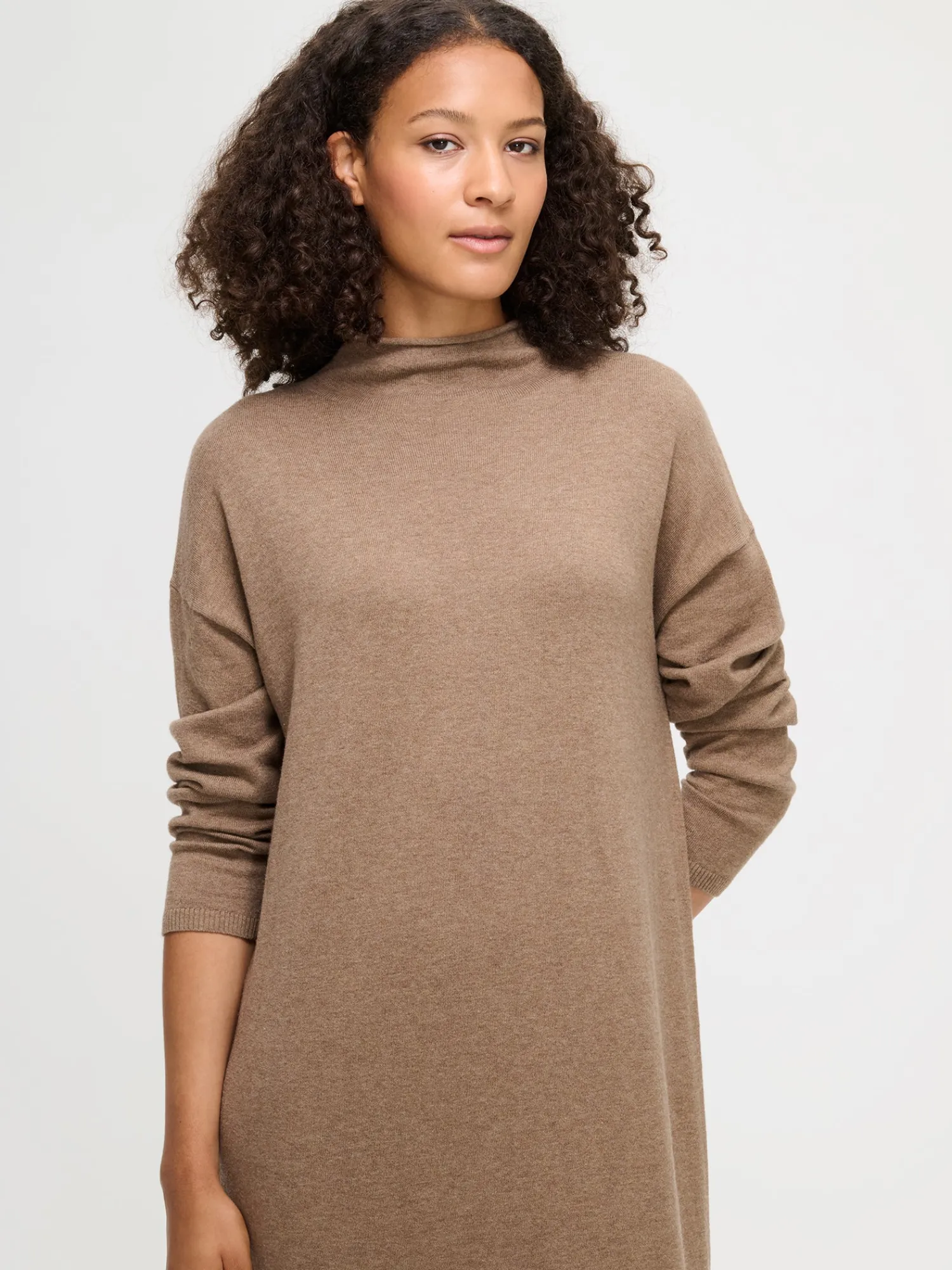 Naisten yksinkertaisen tyylikäs ruskeanharmaa Villis-neulemekko. Kauniissa suoralinjaisessa mekossa on leveä kilpikonnakaulus, pudotettu olkalinja ja täyspitkät hihat. Mekon helmassa ja hihansuissa on kapea resori. Mekon pituus koossa M on noin 120 cm. Materiaali on laadukasta merinovillan ja puuvillan sekoitetta. Tuotteen valmistuksessa on käytetty mulesing-vapaata merinovillaa.