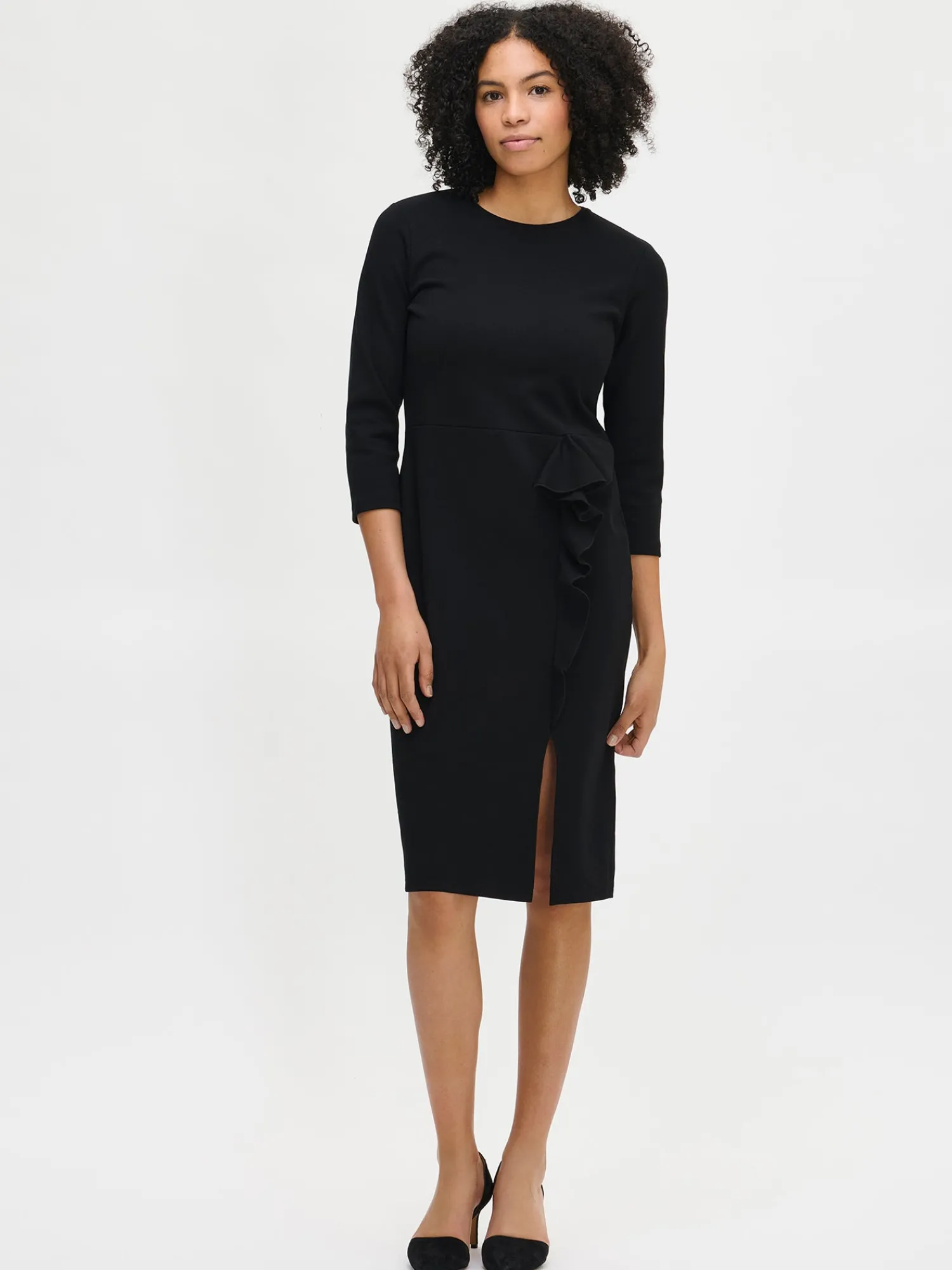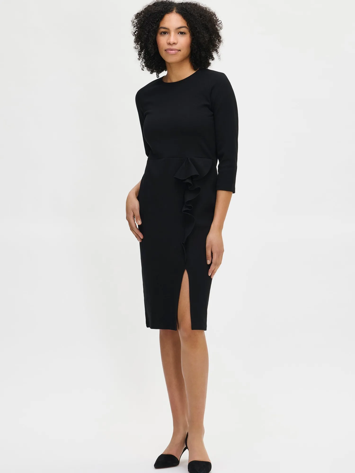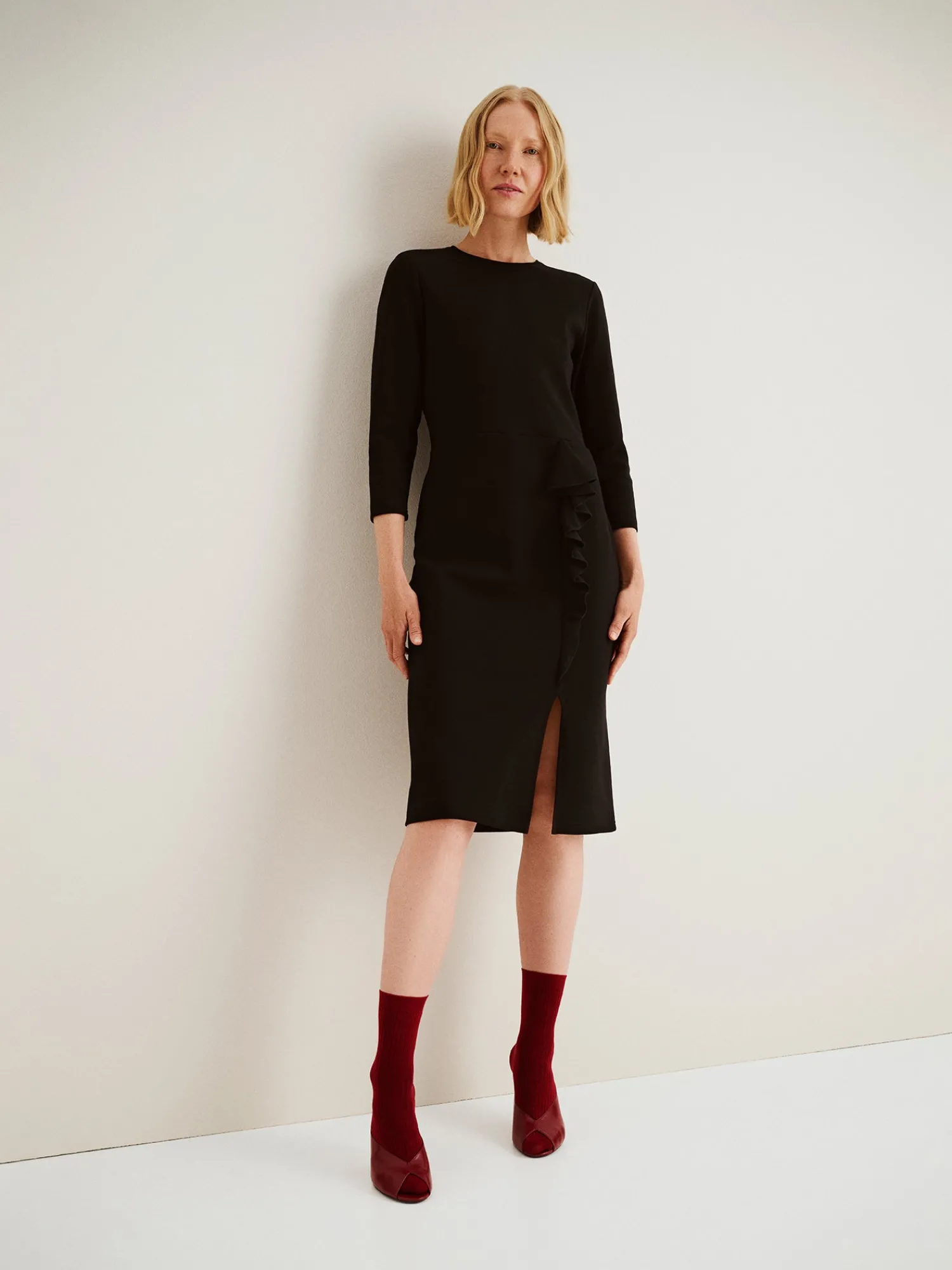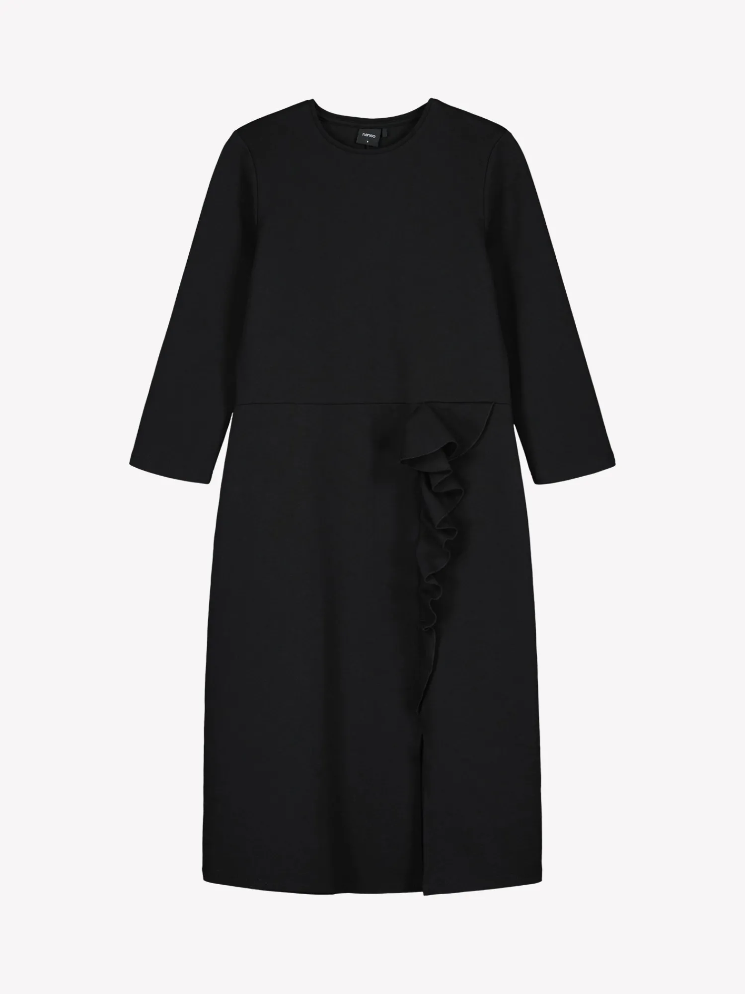 Naisten ajaton yksivärinen Opera-mekko. Istuvassa mekossa on pyöreä pääntie, poikkileikkaussauma vyötäröllä sekä 3/4-pituiset hihat. Suoralinjaisessa helmassa on halkio ja kaunis frilla. Pituus koossa M on noin 110 cm. Materiaali on miellyttävän tuntuista, paksumpaa interlock-neulosta.