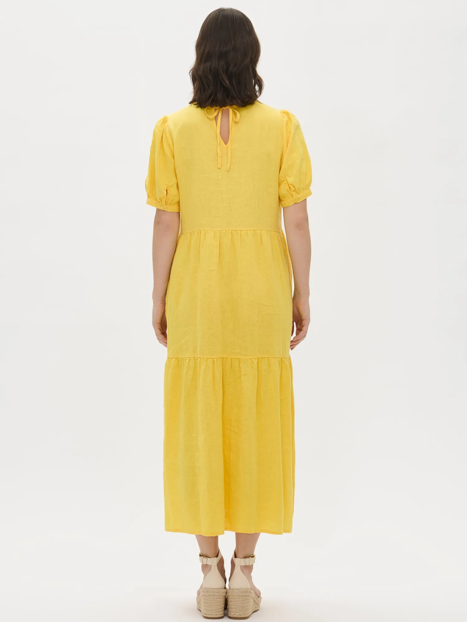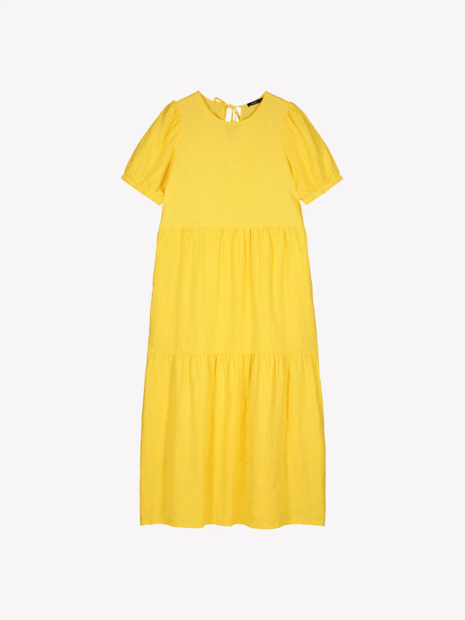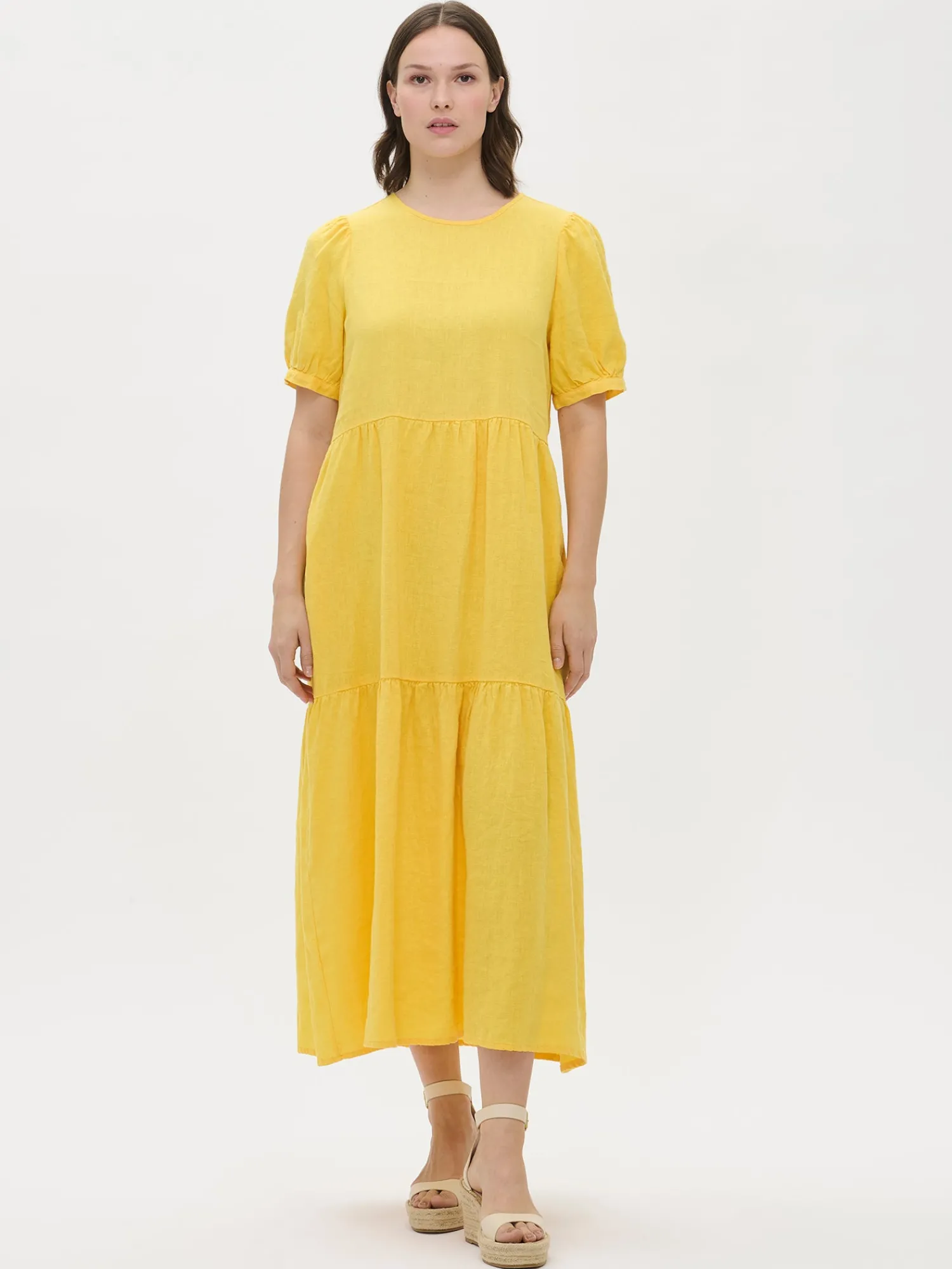 Naisten kaunis keltainen Sarastus-pellavamekko volyymisilla frillakerroksilla ja lyhyillä puhvihihoilla, joissa on napit säätövaralla. Tyylikäs ja rento Sarastus-pellavamekko on kesän kestosuosikki vuodesta toiseen. Mekossa on sivutaskut, pyöreä pääntie sekä niskassa pieni halkio ja solmittavat nyörit. Pellavamekon pituus koossa M on noin 130 cm. Materiaali kudottua pellavakangasta, joka on kestävää ja hengittävää. Pellavalle on ominaista luonnollinen pieni rypistyminen. Tuote on esipesty tuotannossa, joten se ei kutistu ensimmäisessä pesussa.