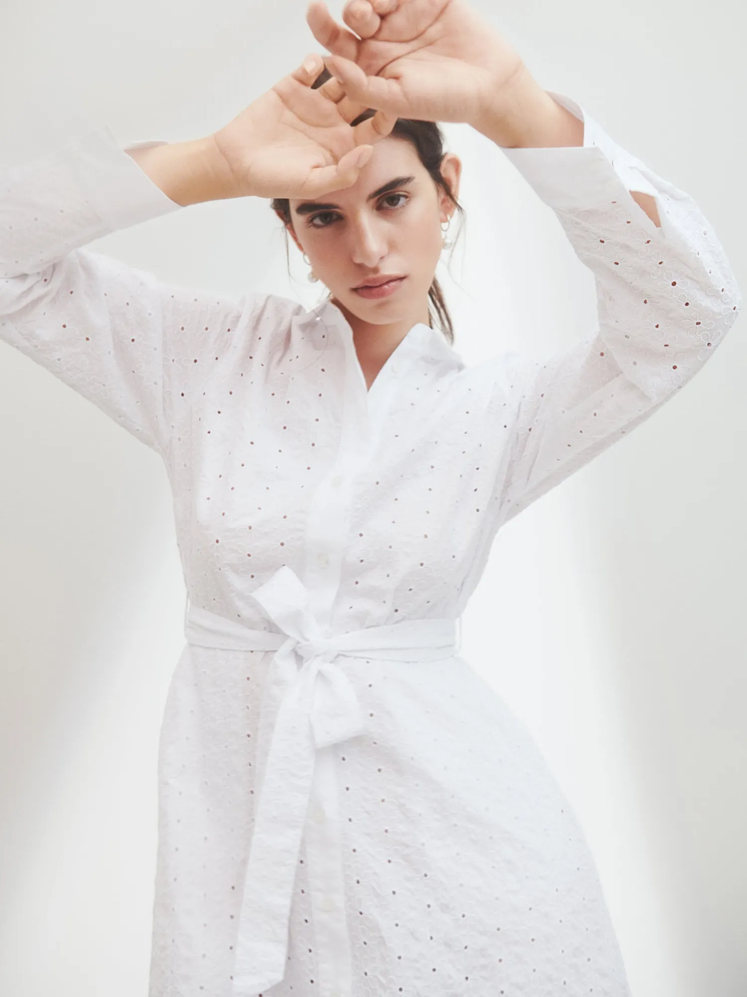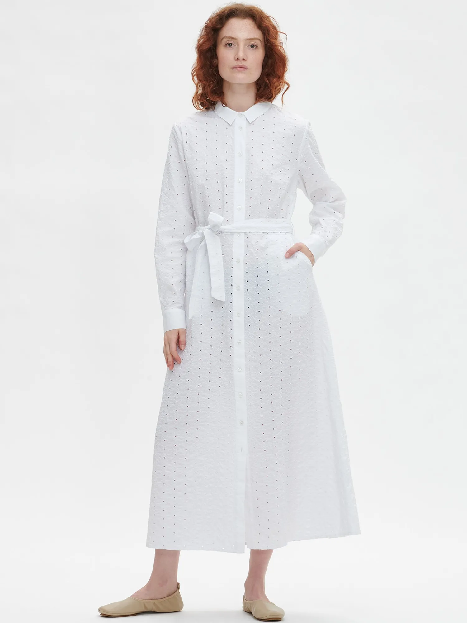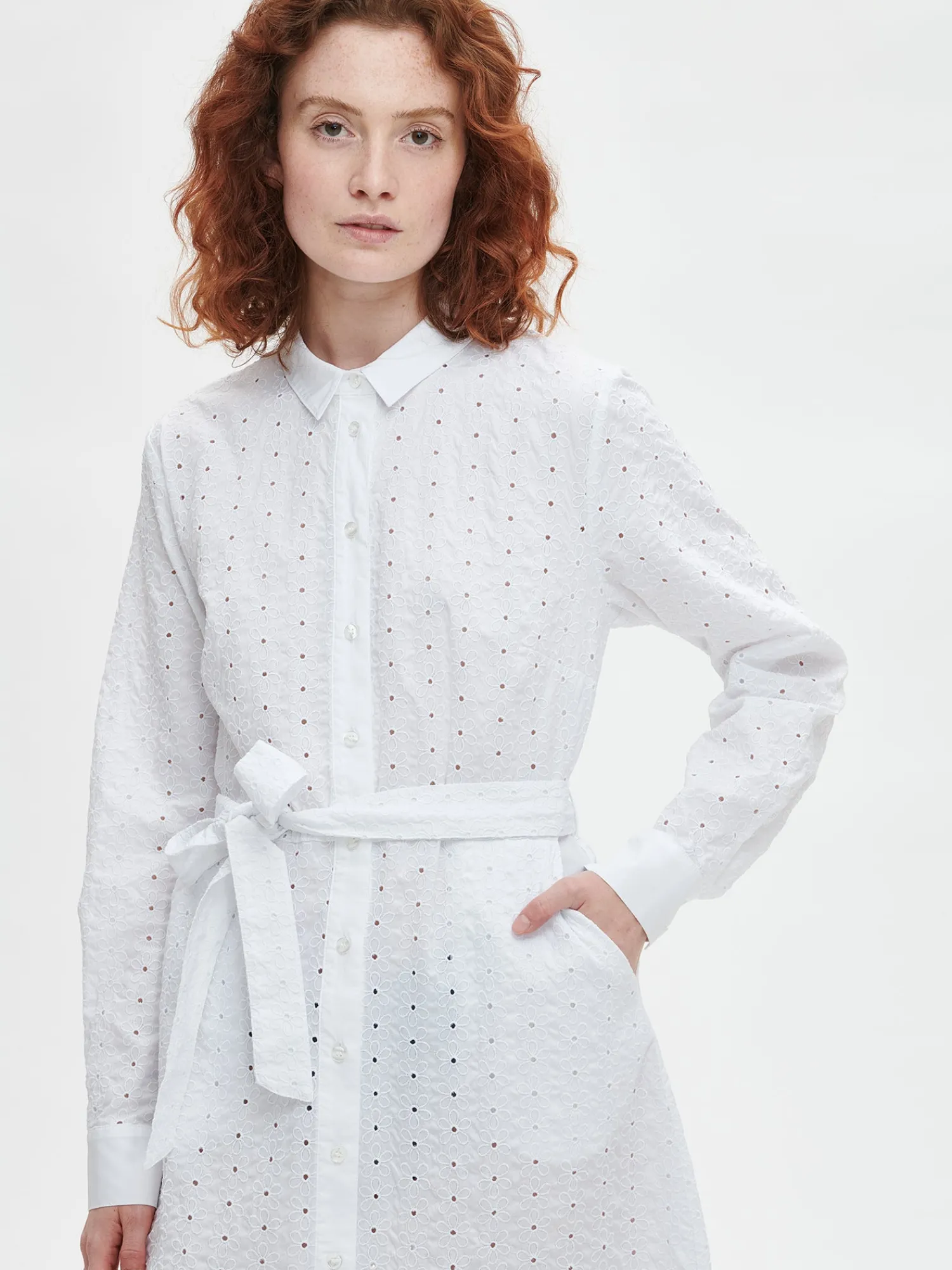 Naisten ihastuttava valkoinen Petra-paitapuseromekko. Tyylikäs mekko on helppo valinta kesän juhliin. Istuvassa paitapuseromekossa on napitus edessä ja hihat ovat täyspitkät. Hihansuissa on nappihalkiot ja mekon vyötäröllä on irroitettava vyö. Mekon sivuissa on taskut. Mekon takana on kaarroke, jonka alapuolella on poimutusta. Mekon pituus koossa 38 on noin 135 cm. Materiaali on kudottua puuvilla-popliinikangasta, jossa on kaunis brodeeraus. Materiaali on kevyttä ja hengittävää. Petra-paitapuseromekko yhdistyy täydellisesti kanssa.