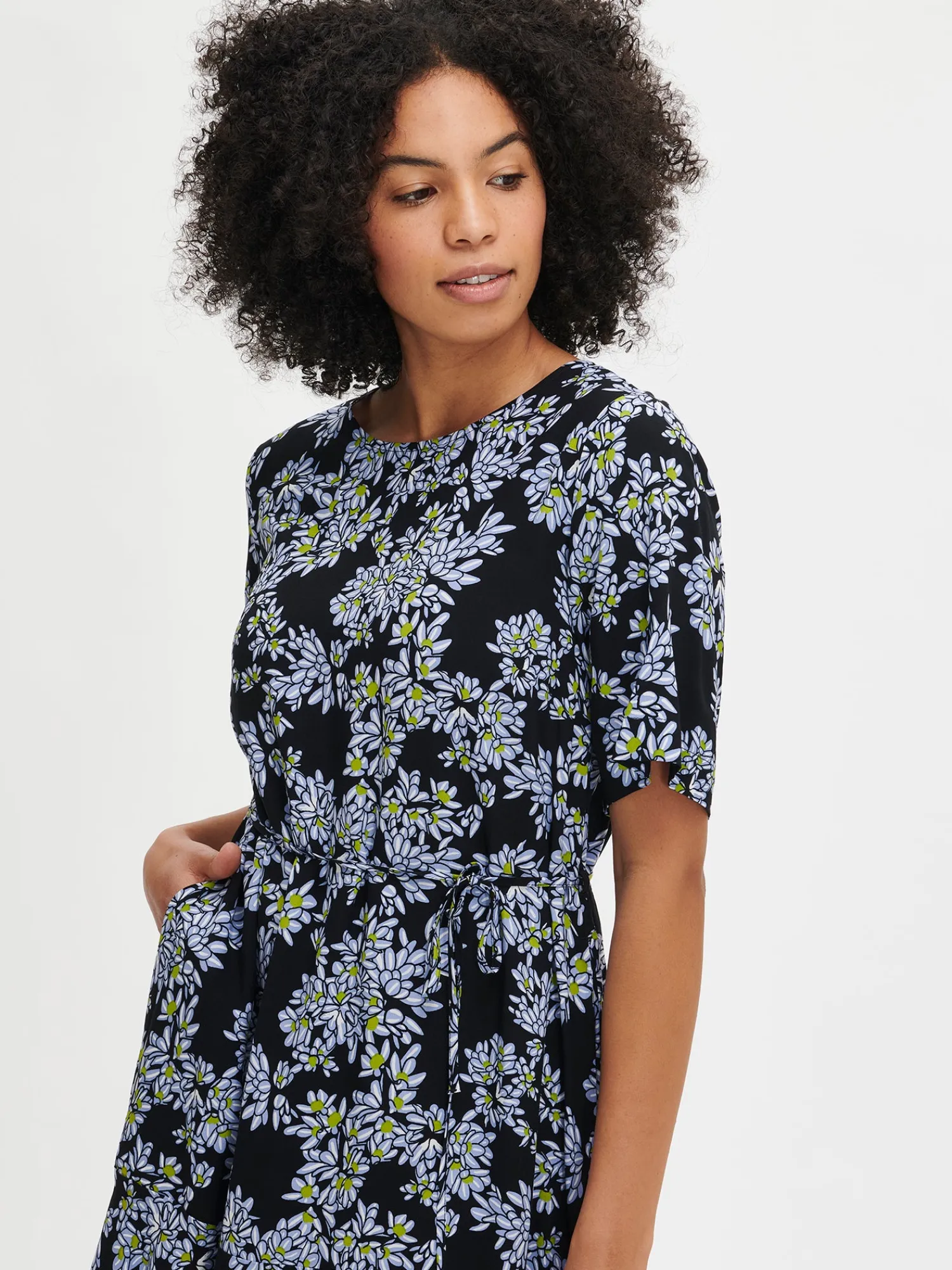 Naisten kuosillinen lyhythihainen Pihlaja-mekko. Mekossa on pyöreä pääntie, jossa nappihalkio takana. Mekon hihat ovat 2/4 pituiset. Mekon sivuissa on taskut ja helmassa kellotus. Mekon vyötäröllä on kapea irrotettava vyö. Mekon pituus koossa 38 on noin 98 cm. Materiaali on kauniisti laskeutuvaa kudottua 100 % viskoosikangasta. Materiaalille on ominaista 3-5 % kutistuminen ensimmäisessä pesussa.