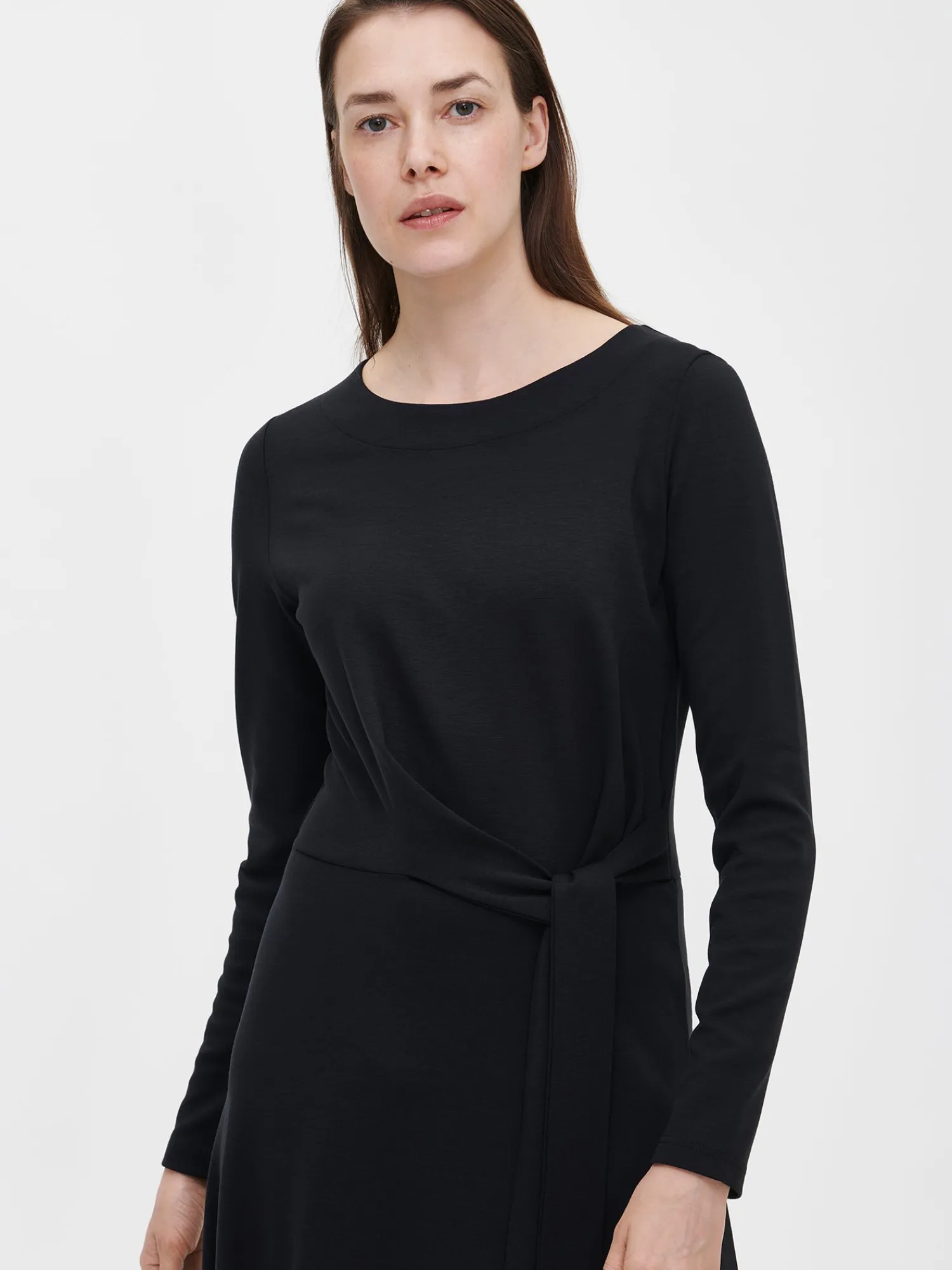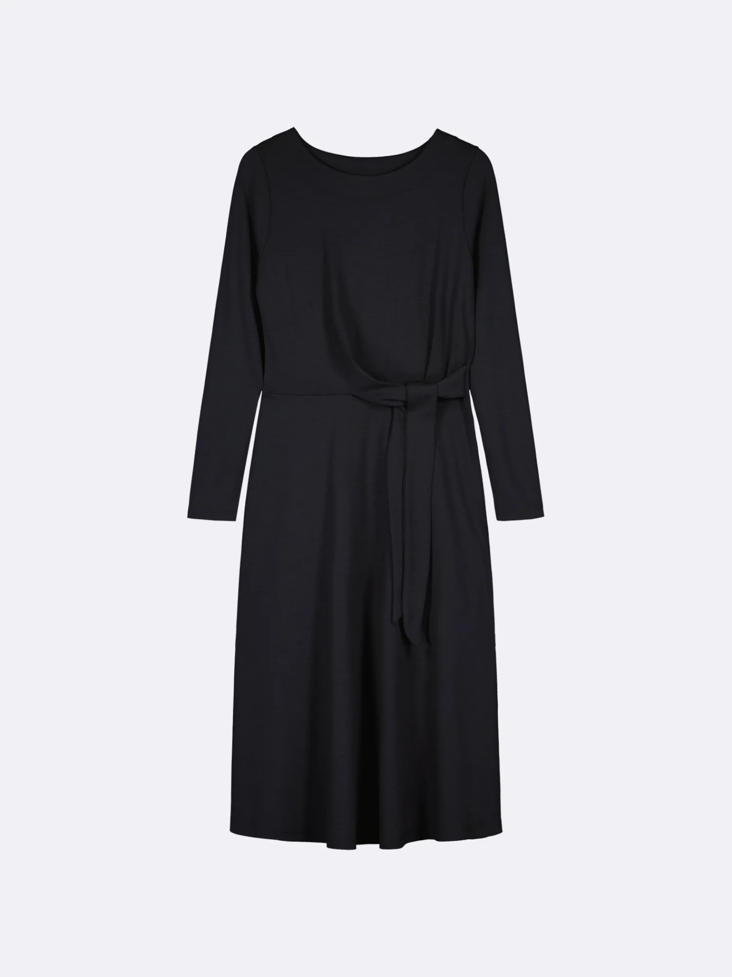 Naisten kaunis musta Piirre-mekko pitkillä hihoilla. Piirre-mekko on luottovaate arkeen. Mekossa on alavaralla huoliteltu ovaali pääntie ja täyspitkät hihat. Mekon vasemmalle sivulle muodostuu kaunis, naisellinen solmuke vyön avulla. Mekon pituus koossa M on noin 115cm. Materiaali on pehmeää, paskumpaa viskoosi-polyamidi-elastaani -neulosta.