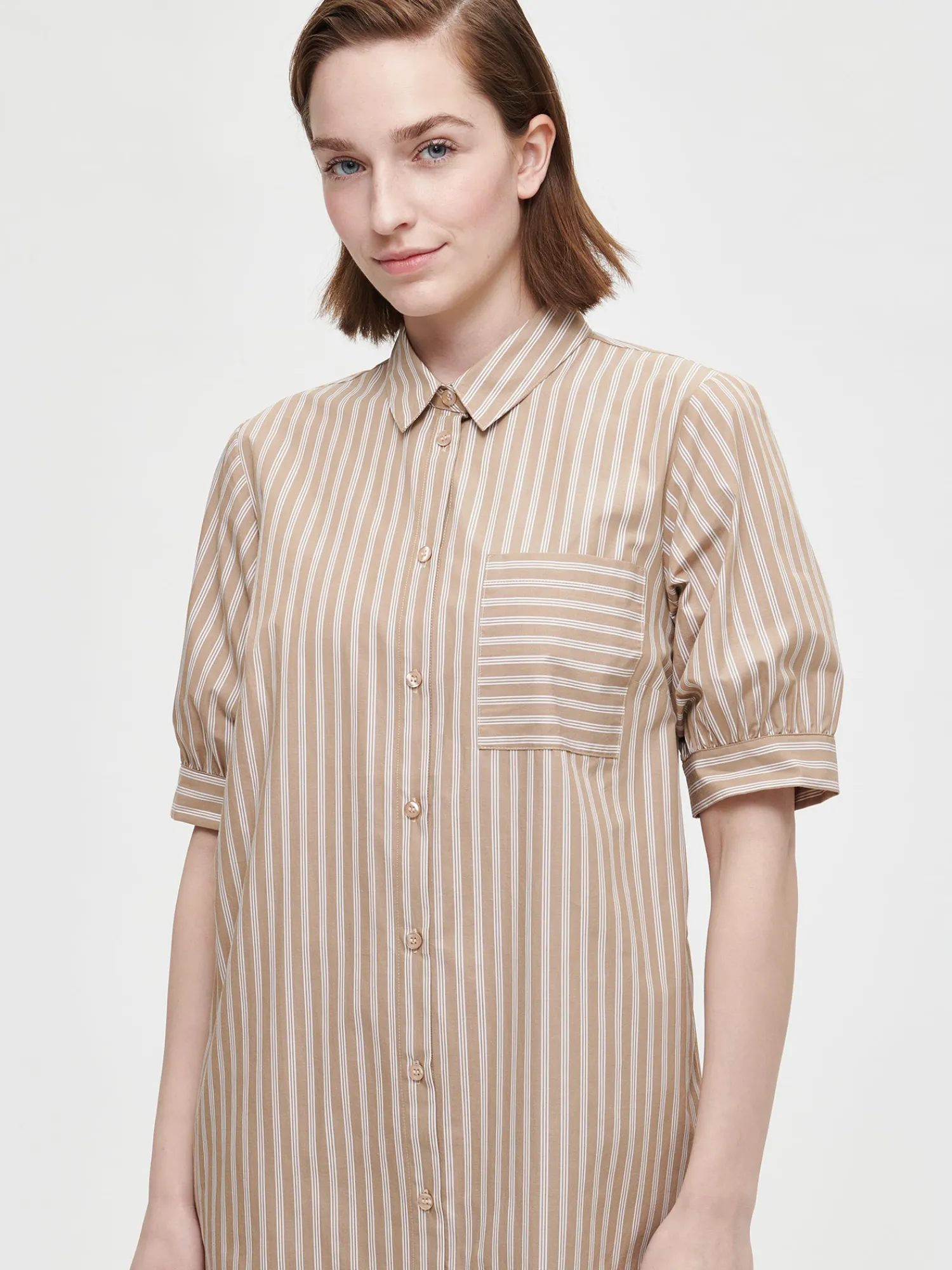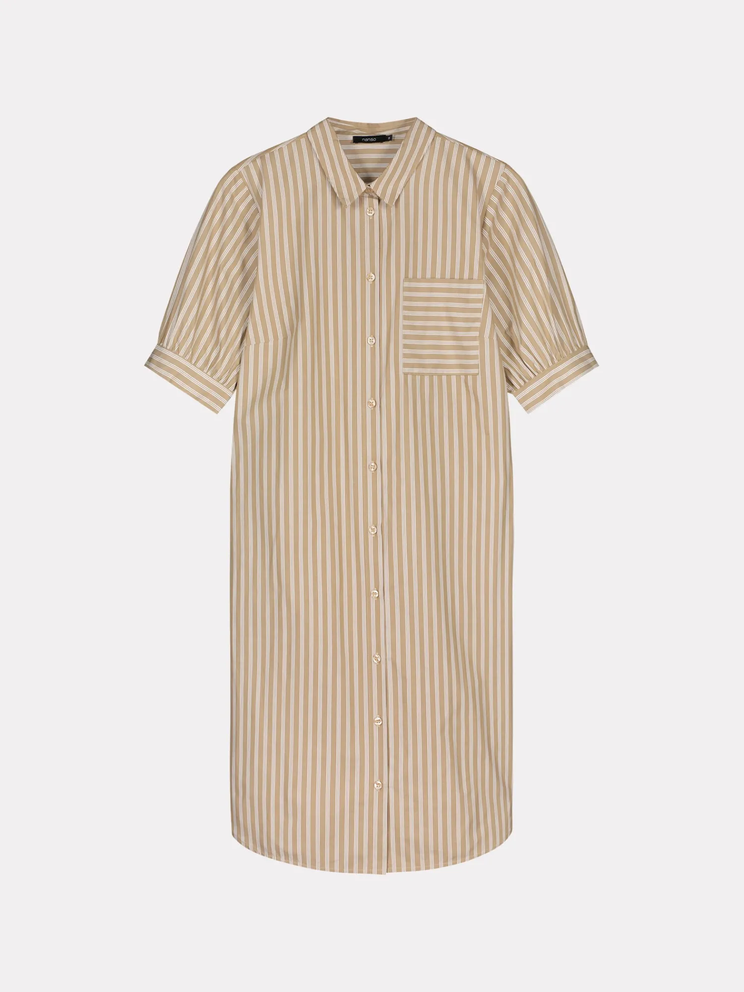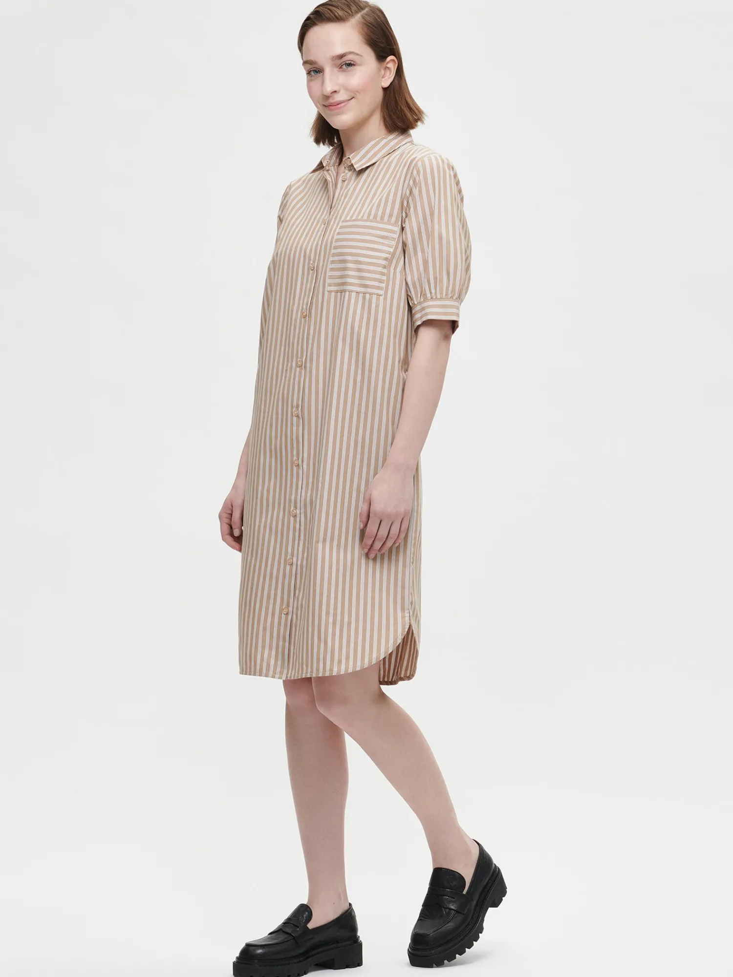 Naisten raidallinen ruskea Piirto-paitamekko. Tyylikkään paitamekon voi pukea arkeen tai juhlaan. Mekossa on kaulus, edessä napitus, rintamuotolaskokset ja paikkatasku. 2/4 pituiset hihat poimuttuvat kauniisti hihansuun leveän kaitaleen yläpuolella. Mekossa on sivutaskut ja pyöristetty helma. Mekon pituus koossa 38 on noin 105 cm. Materiaali on kevyttä kudottua puuvillakangasta.