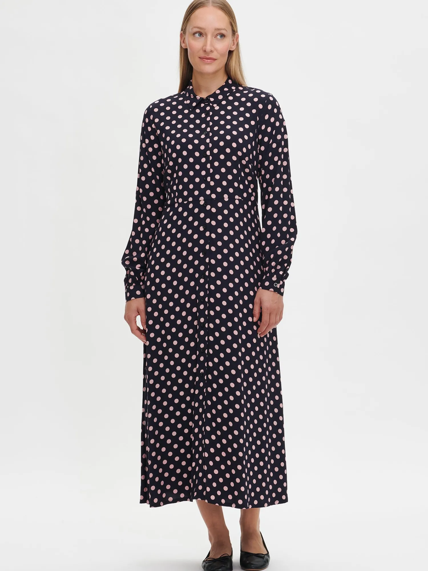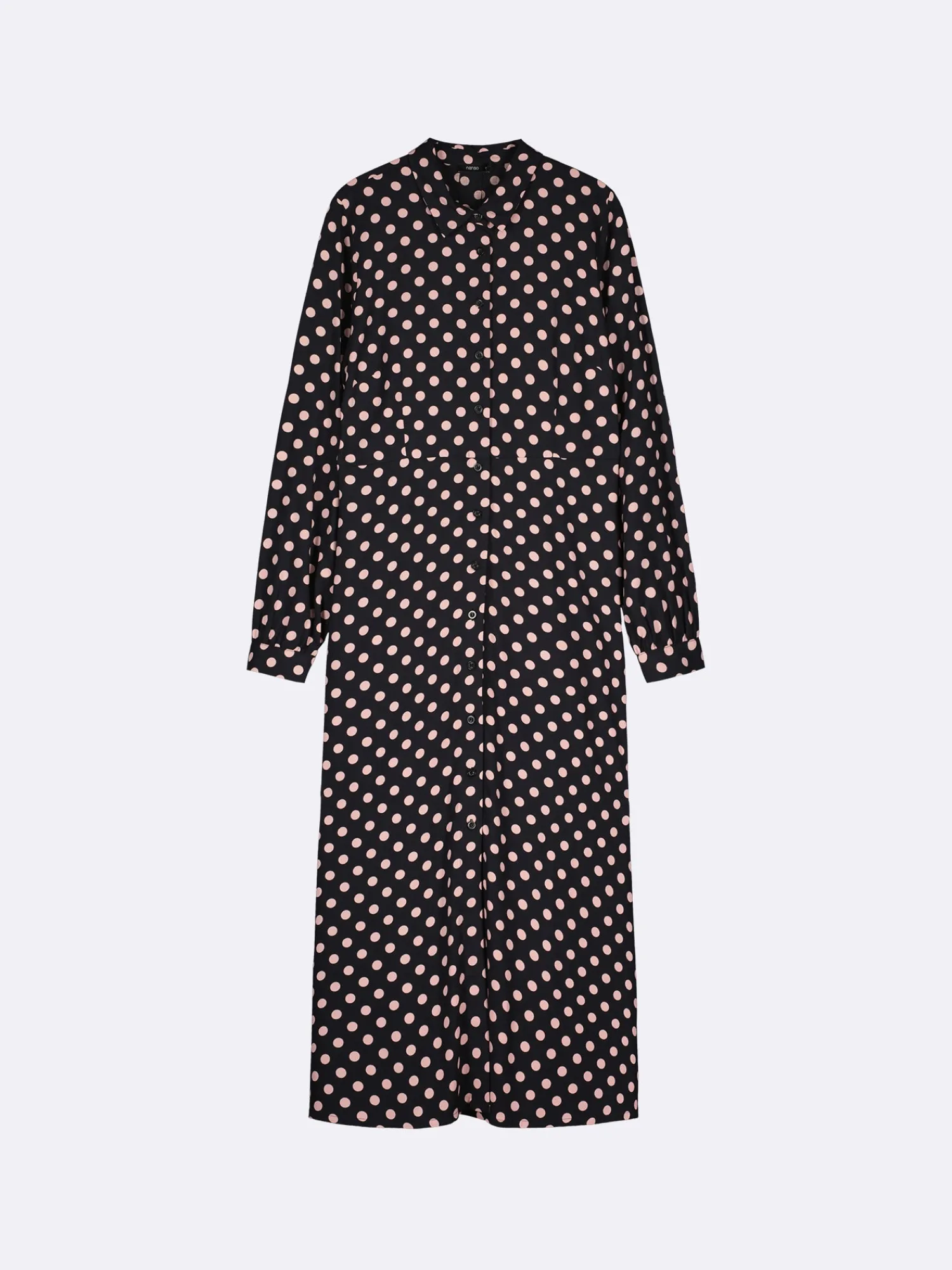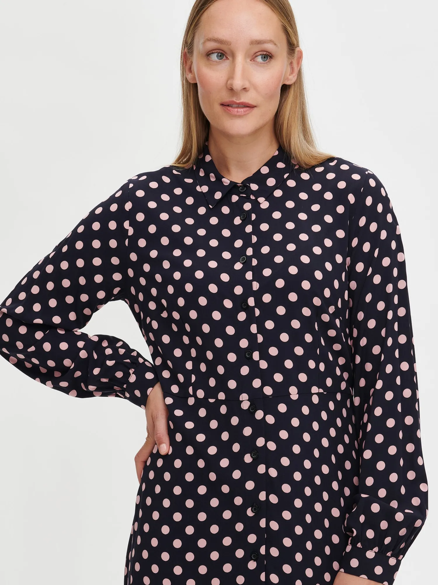 Naisten kuosillinen tummansininen pitkä Polkka-mekko. Yläosastaan istuvassa mekossa on klassiset kaulukset, edessä napitus sekä rintamuotolaskokset ja takana on laskos. Mekossa on leikkaussauma vyötäröllä ja kauniisti kellottuva helma. Täyspitkien hihojen hihansuissa on nappikalvosimet. Mekon pituus koossa 38 on noin 130 cm. Materiaali on kauniisti laskeutuvaa kudottua 100 % viskoosikangasta. Materiaalille on ominaista 3-5% kutistuminen ensimmäisessä pesussa.