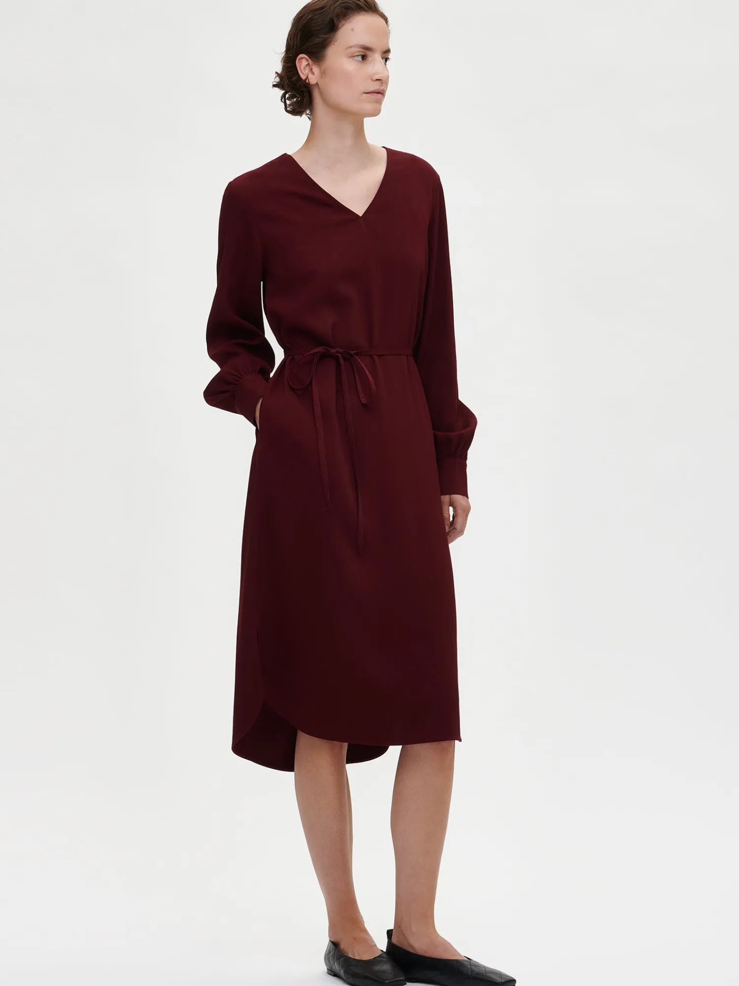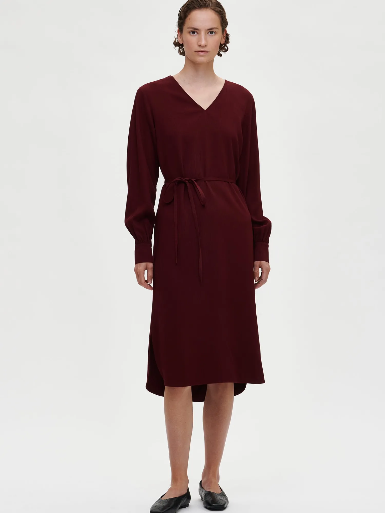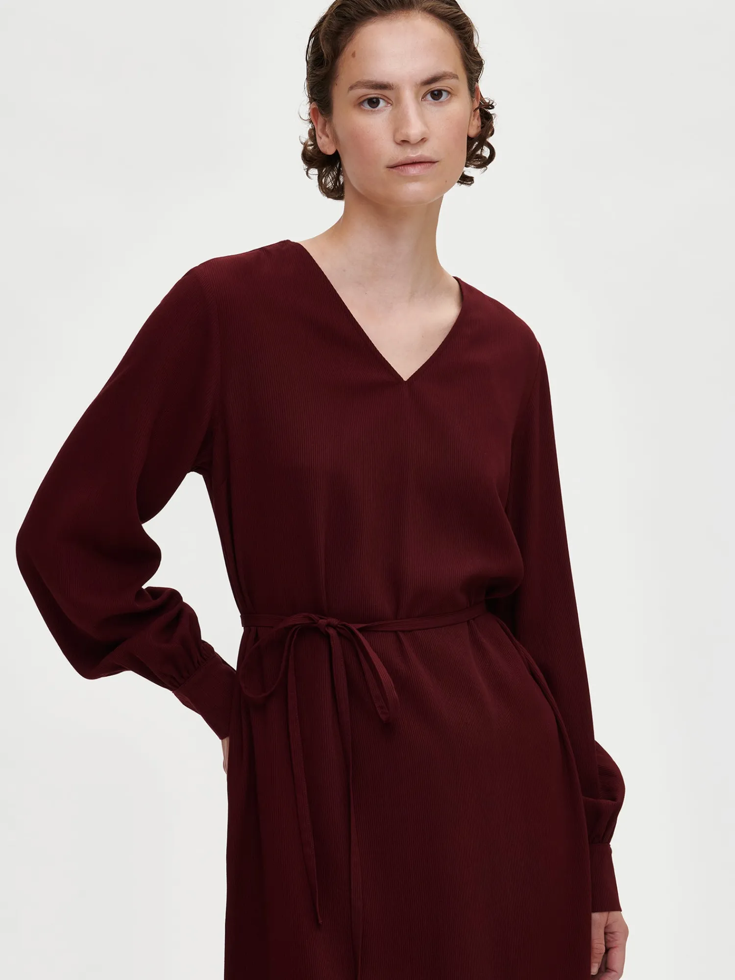 Naisten rento, pitkähihainen, viininpunainen Sanna-mekko. Tyylikkäässä mekossa on v-pääntie, sivuissa taskut, rintamuotolaskokset ja vyö, jolla voi kuroa mekon väljyyttä. Mekon helma on pyöristetty. Mekon hihat ovat täyspitkät ja hihansuissa on nappikalvosimet. Mekon pituus koossa 38 on noin 115 cm. Materiaali on laadukasta ja miellyttävän tuntuista viskoosikangasta, jossa on raidallinen pintakuvio. Materiaalille on ominaista 3-5% kutistuminen ensimmäisessä pesussa.