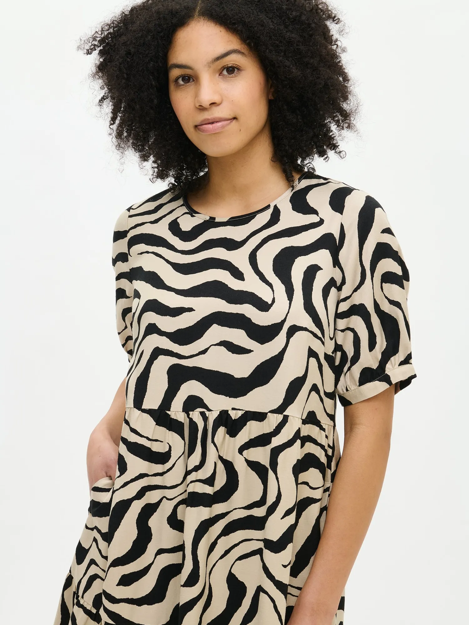 Naisten kaunis kuviollinen midi Savanna-mekko volyymisilla frillakerroksilla ja lyhyillä puhvihihoilla, joissa on napit säätövaralla. Mekossa on sivutaskut, pyöreä pääntie sekä niskassa pieni halkio ja solmittavat nyörit. Mekon pituus koossa M on noin 113 cm. Materiaalina on kudottua viskoosipellavakangas. Materiaalille on ominaista 3-5% kutistuminen ensimmäisessä pesussa.
