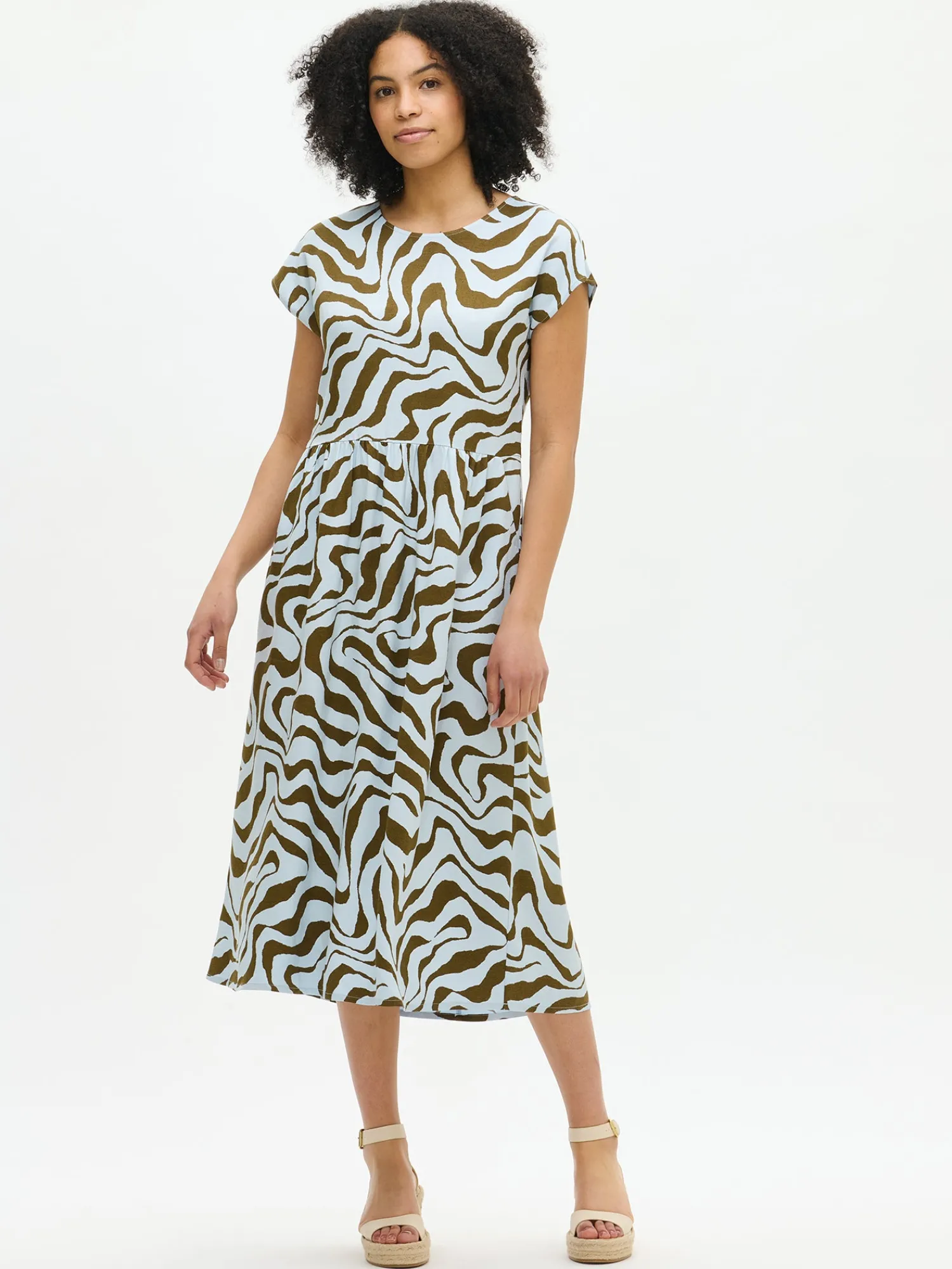 Naisten kuosillinen vaaleansininen Savanna-mekko. Rento mekko tuo arkeesi ripauksen rohkeaa kuosia ja pehmeää helppoutta. Mekossa on kantilla viimeistelty ovaali pääntie ja kädentiet. Mekon helma poimuttuu kevyesti vyötärön leikkaussaumaan ja sivuissa on taskut. Mekon pituus koossa 38 on noin 125 cm. Materiaali on laadukasta ja miellyttävän tuntuista viskoosi-pellava-kangasta. Materiaalille on ominaista 3-5% kutistuminen ensimmäisessä pesussa.