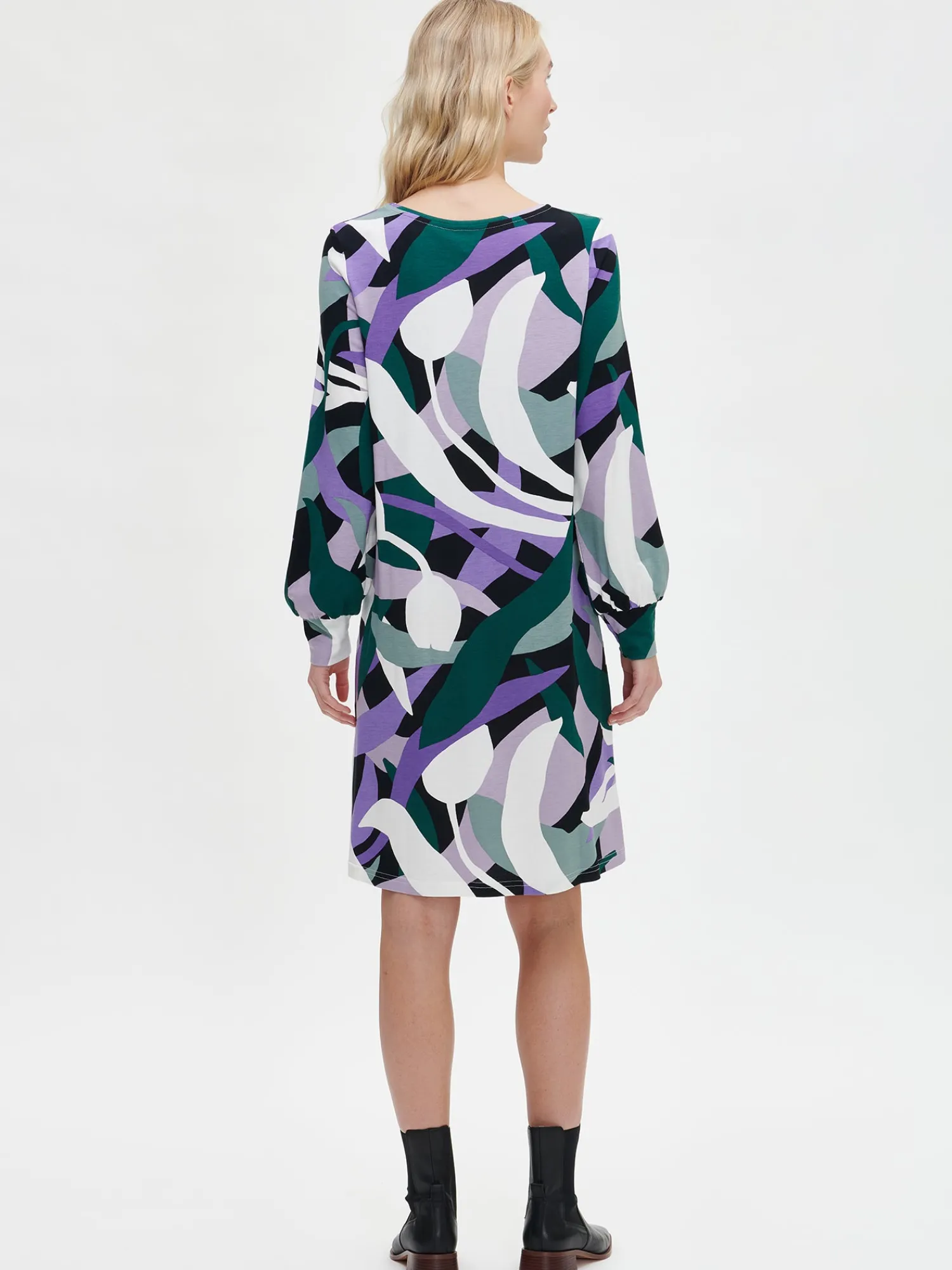 Naisten kuosillinen monivärinen Siimes-mekko. A-linjaisessa mekossa on tereellä viimeistelty ovaali pääntie ja sivuissa taskut. Mekossa on täyspitkät hihat, jotka poimuttuvat kauniisti hihansuun leveän rannekkeen yläpuolelle. Mekon pituus koossa M on noin 95 cm. Kauniisti laskeutuvan mekon materiaali on laadukasta ja miellyttävän tuntuista viskoosi-elastaani-neulosta. Viskoosineulos on sähköistymätöntä ja helppohoitoista. Tuote on valmistettu LENZING™ ECOVERO™ -viskoosista. Materiaalille on ominaista 3-5% kutistuminen ensimmäisessä pesussa.