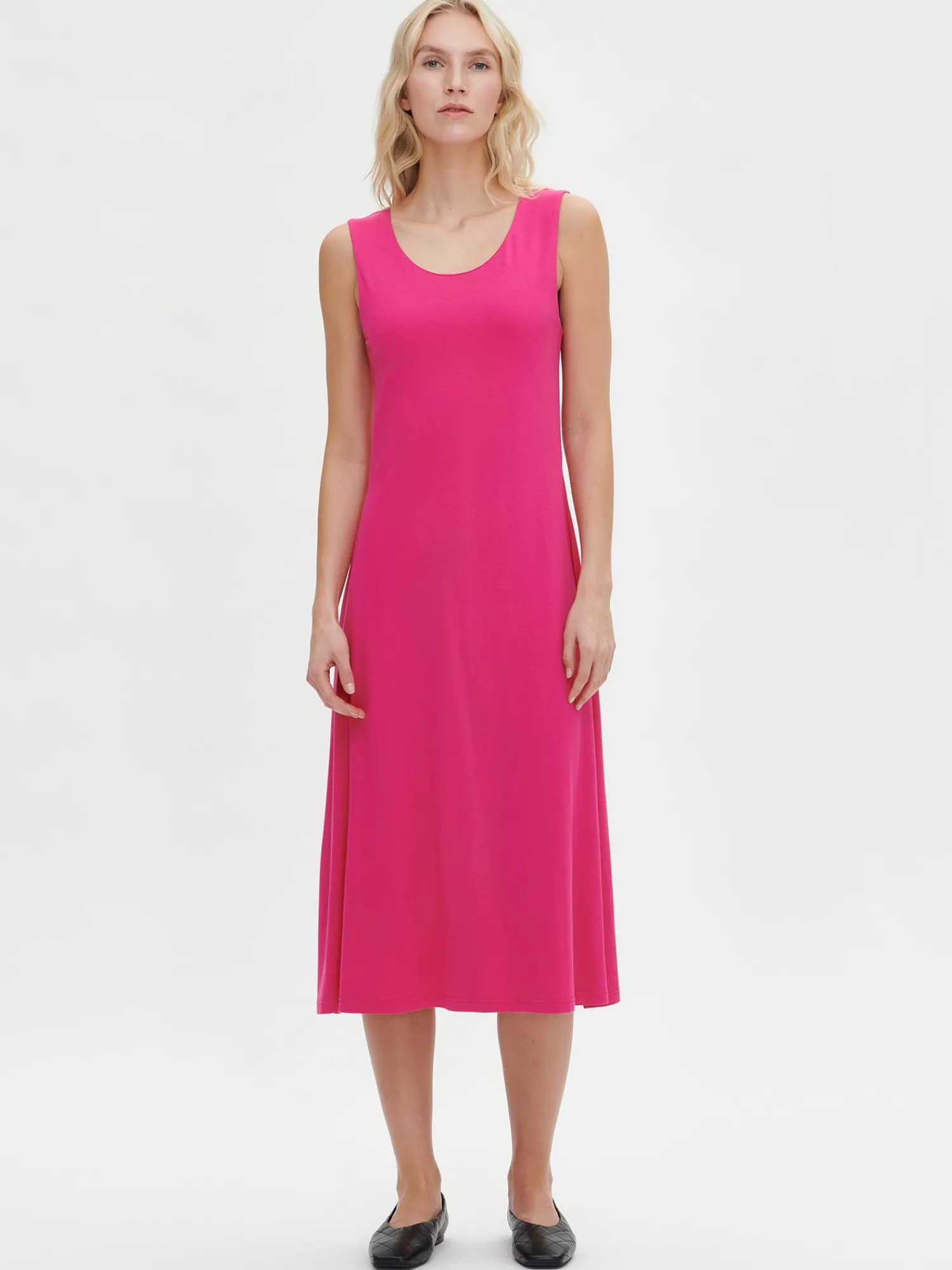 Naisten pinkki hihaton Sonja-mekko. Tyylikäs yksivärinen mekko on arjen luottovaate. Leveä helmaisen mekon yläosa on vuoritettu ja pääntien takana on pisaranmuotoinen nappihalkio. Mekon pituus koossa M on noin 115 cm. Kauniisti laskeutuvan mekon materiaali on laadukasta ja miellyttävän tuntuista viskoosi-elastaani-neulosta. Viskoosineulos on sähköistymätöntä ja helppohoitoista. Tuote on valmistettu LENZING™ ECOVERO™ -viskoosista. Materiaalille on ominaista 3-5% kutistuminen ensimmäisessä pesussa.
