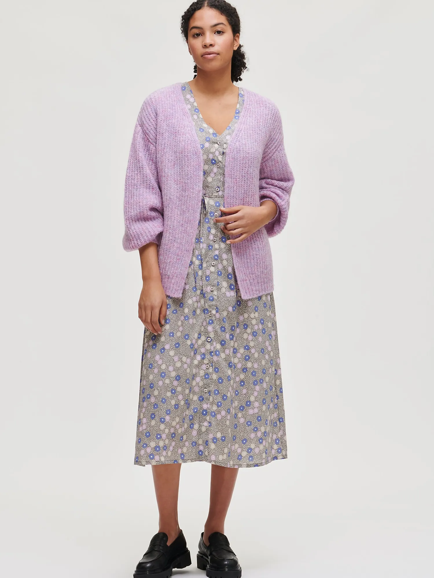 Naisten kuosillinen oliivinvihreä Sorbetti -pitkä kangasmekko. Kuosillisessa mekossa on edessä napitus ja v-pääntie. Mekko on yläosastaan istuva ja siinä on 3/4 pituiset hihat, jotka poimuttuvat kauniisti hihansuun kapean kuminauhan yläpuolelta. Mekon vyötäröllä on irroitettava kapea vyö ja sivuissa on taskut. Mekon kaarrokkeen reunassa takana sekä vyötäröllä on poimutusta. Mekon helma on kauniisti kellotettu. Mekon pituus koossa 38 on noin 125 cm. Materiaali on ylellisen pehmeää, mutta ryhdikästä vastuullisempaa lyocell-popliinia. Materiaalille on ominaista 3-5% kutistuminen ensimmäisessä pesussa.