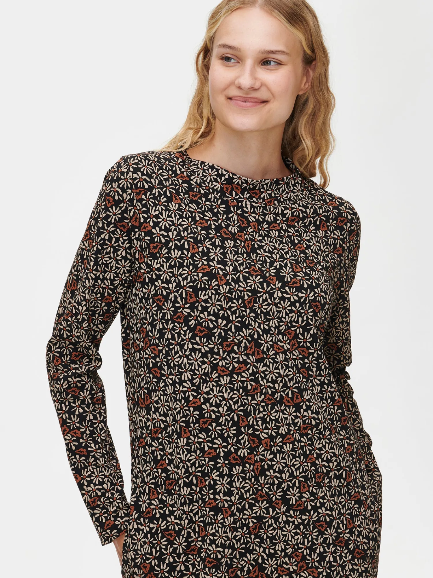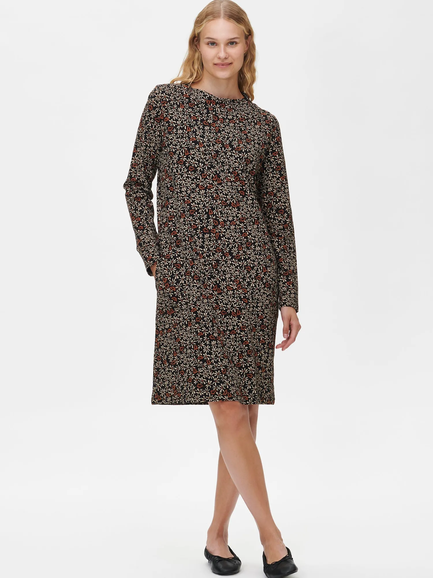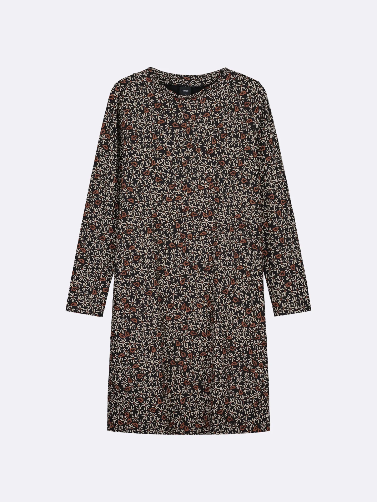 Naisten kuosillinen ruskeasävyinen pitkähihainen Tammi-mekko. Mekossa on kaunis ovaalin muotoinen pääntie pystykauluksella, sivutaskut ja täyspitkät hihat. Mekon pituus koossa M on noin 98 cm. Materiaali on miellyttävän tuntuista ja helppohoitoista puuvilla-elastaani-neulosta.