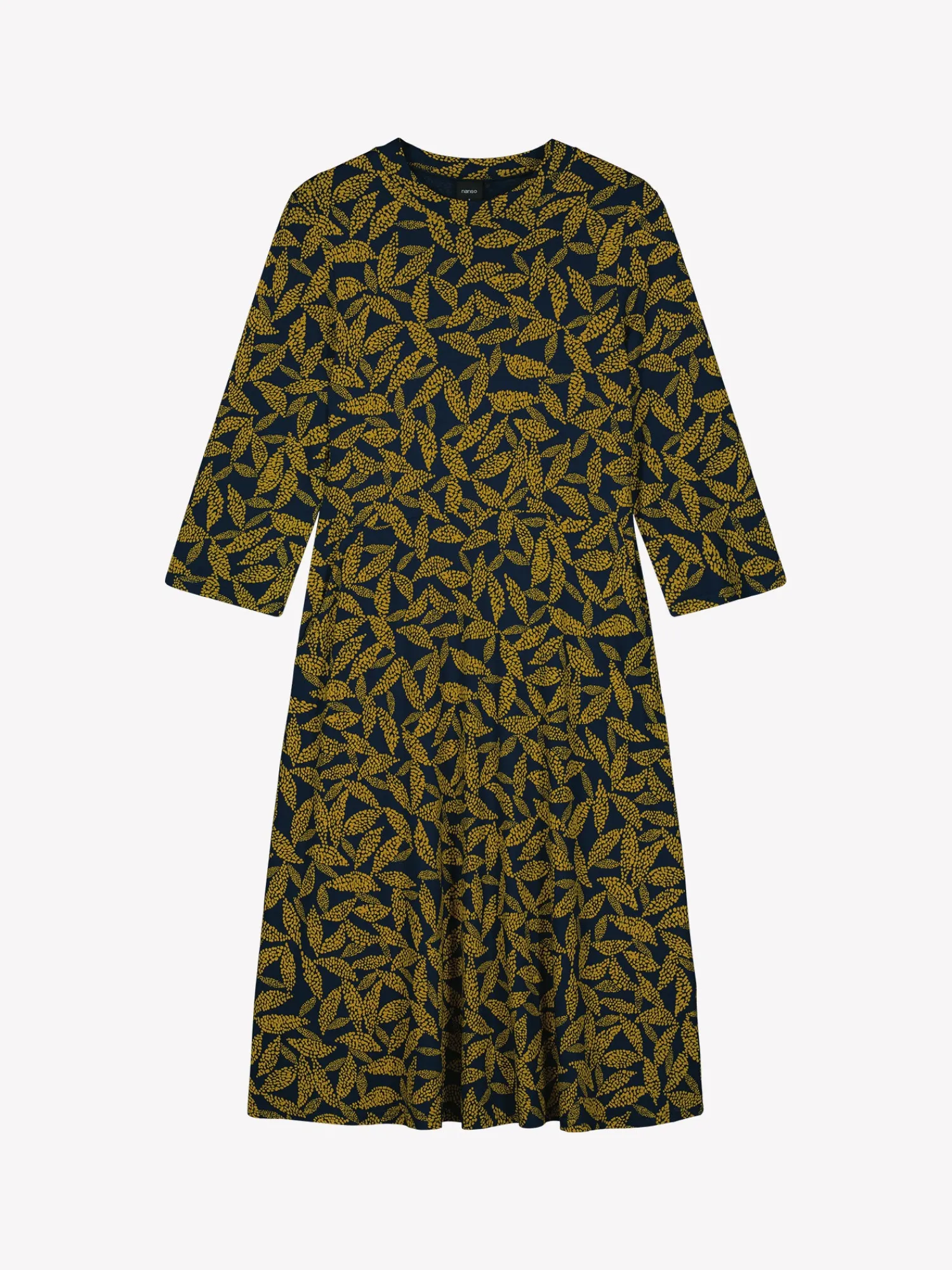 Naisten kuosillinen keltainen Triine-mekko. Mekossa on pieni pystykaulus, sivuissa taskut ja 3/4 pituiset suorat hihat. Mekko on yläosasta istuva ja helmassa on hieman kellotusta. Mekon pituus koossa M on noin 110 cm. Kauniisti laskeutuvan mekon materiaali on laadukasta ja miellyttävän tuntuista, ohutta viskoosi-elastaani-neulosta. Viskoosineulos on sähköistymätöntä ja helppohoitoista. Tuote on valmistettu LENZING™ ECOVERO™ -viskoosista. Materiaalille on ominaista 3-5% kutistuminen ensimmäisessä pesussa.