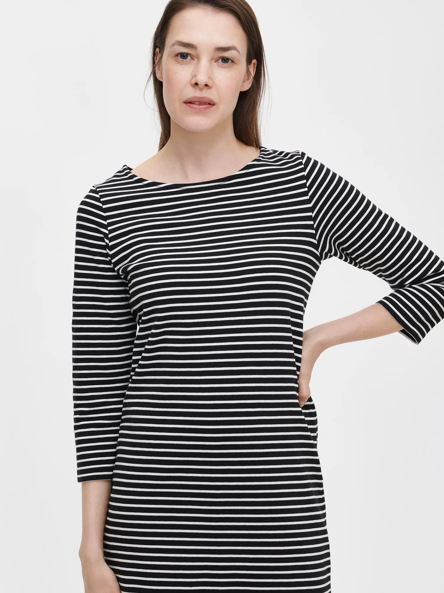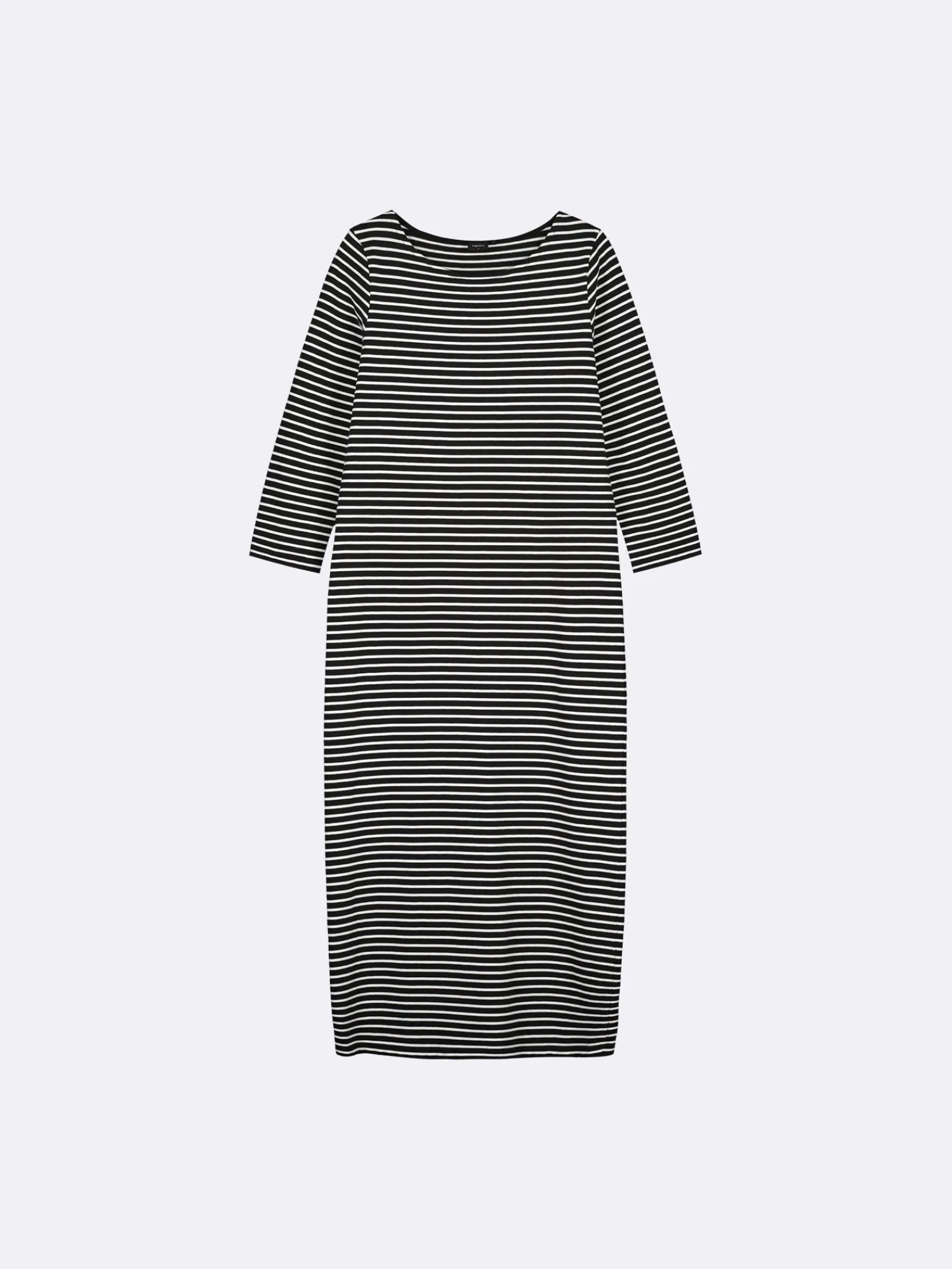 Naisten raidallinen mustavalkoinen Vaaka-mekko. Istuva mekko on tyylikäs valinta arkeen. Mekon voi kerrostaa lämpimän neulepaidan kanssa viileämmällä säällä. Istuvassa mekossa on kantilla viimeistelty venepääntie ja 3/4 pituiset hihat. Mekon pituus koossa M on noin 130 cm. Materiaali on miellyttävän tuntuista ja helppohoitoista puuvillaneulosta. Materiaalille on ominaista 3-5% kutistuminen ensimmäisessä pesussa. Pesun jälkeen muotoile tuote kosteana.