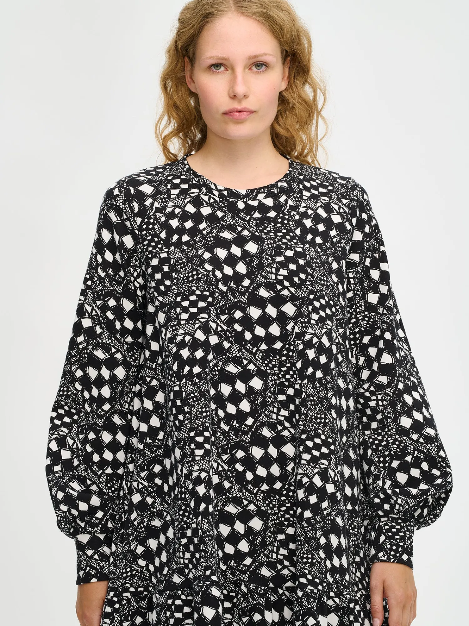 Naisten rento mustavalkoinen Virkkuu-mekko. Malliltaan rennon tyylikäs mekko on mukava päällä, ja siksi se on ehdoton suosikkivaate. Lyhyessä mekossa on pyöreä pääntie, sivuissa taskut, helmassa poimutus ja kauniisti hihansuihin poimuttuvat täyspitkät hihat. Mekon pituus koossa M on noin 90 cm. Materiaali on miellyttävän tuntuista, paksumpaa interlock-neulosta.