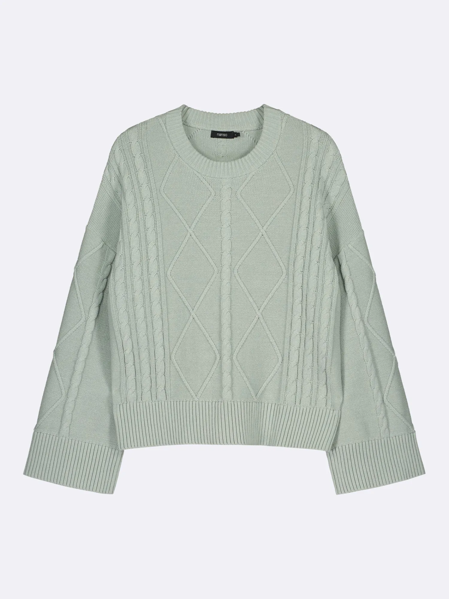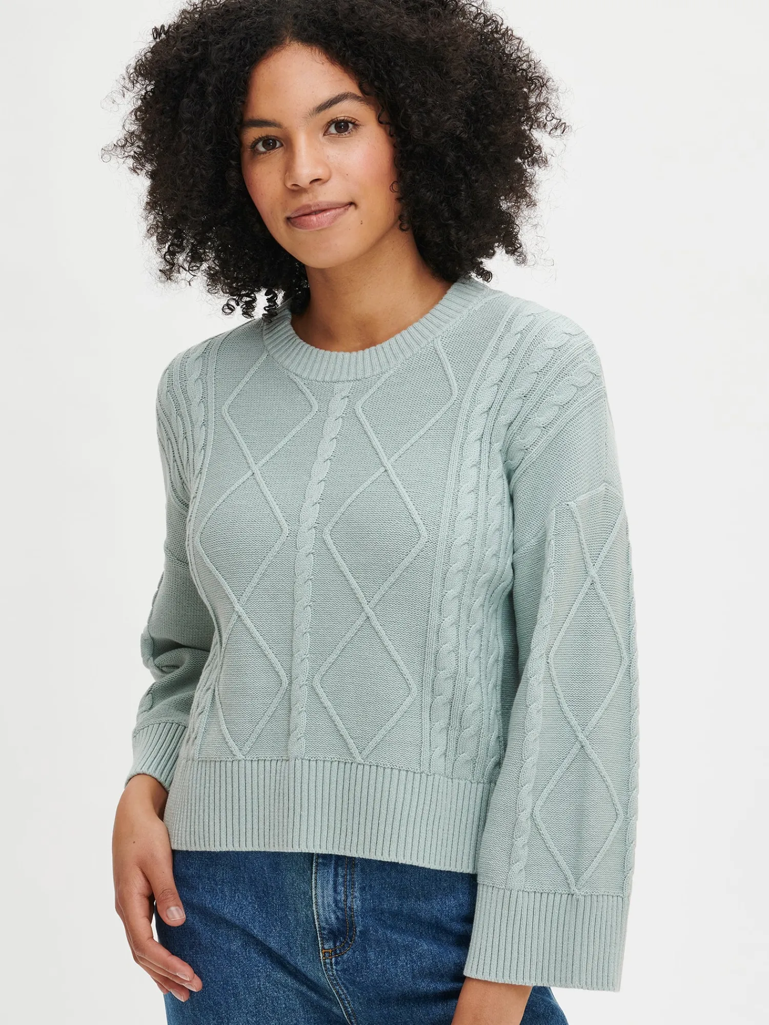 Naisten sinivihreä Coletta-neulepusero kauniilla palmikkokuviolla. Tyylikkääseen puuvillaneuleeseen on mukavaa pukeutua aina. Muotoonneulotussa laatikkomaisessa neulepuserossa on pyöreä pääntie ja hieman vajaamittaiset hihat. Neuleessa on kaunis palmikko kuviointi ja resori hihansuissa sekä helmassa. Tuotteen pituus koossa M on noin 58 cm. Neulepusero on valmistettu laadukkaasta sertifioidusta puuvillasta.