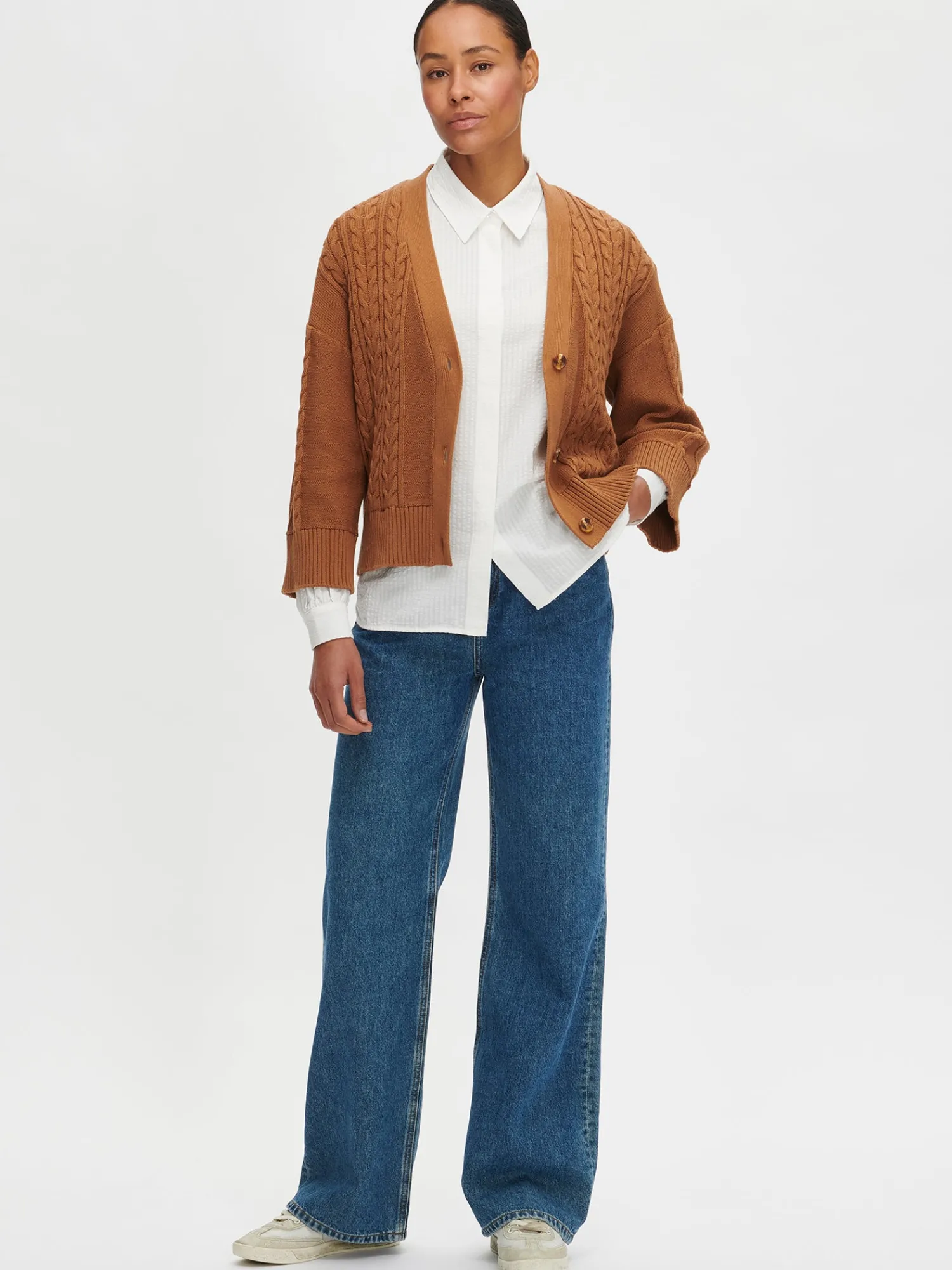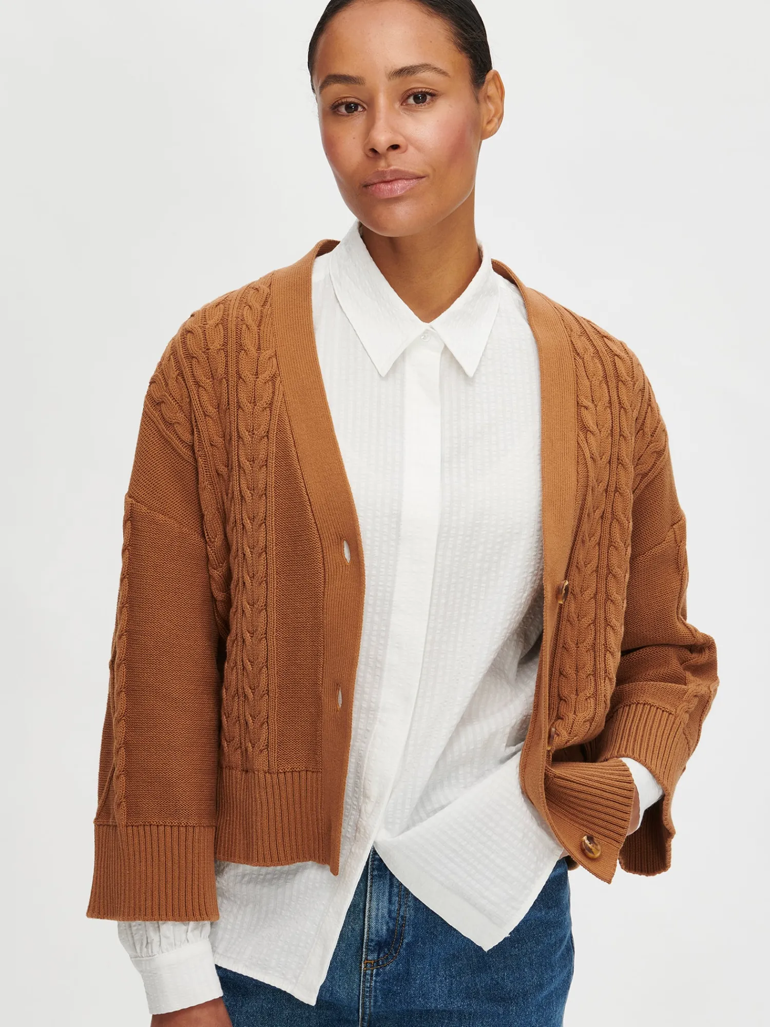 Naisten ruskea Coletta-neuletakki kauniilla palmikkokuviolla. Laadukas puuvillaneuletakki on vaatekaapin luottovaate ja kulmakivi. Neuletakissa on edessä napitus, täyspitkät hihat ja hihansuissa sekä helmassa on resori. Tuotteen pituus koossa M on noin 58 cm. Neuletakki on valmistettu laadukkaasta sertifioidusta puuvillasta. Neuleen hoito-ohjeet löydät .