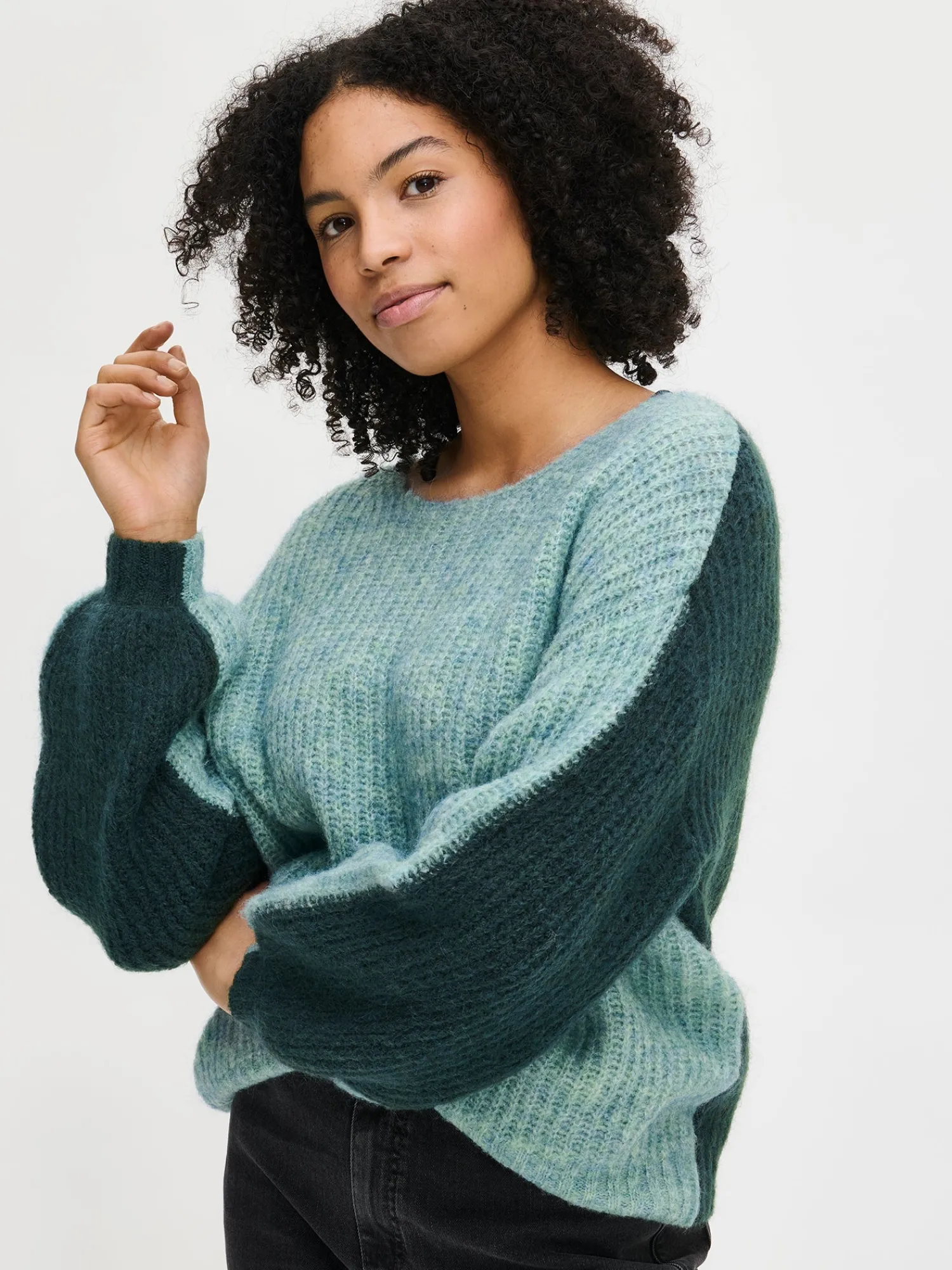 Naisten ylellinen vihreä Karamelli-neulepusero, jossa etu ja takakappale ovat eriväriset. Muhkean neulepuseron neulos on sekoite, jossa on osaksi sertifioitua mohairia, sertifioitua villaa, polyamidia ja hieman elastaania. Muotoonneulotussa neulepuserossa on vene pääntie ja täyspitkät suoralinjaiset hihat. Neulepuseron pituus koossa M on noin 61 cm.