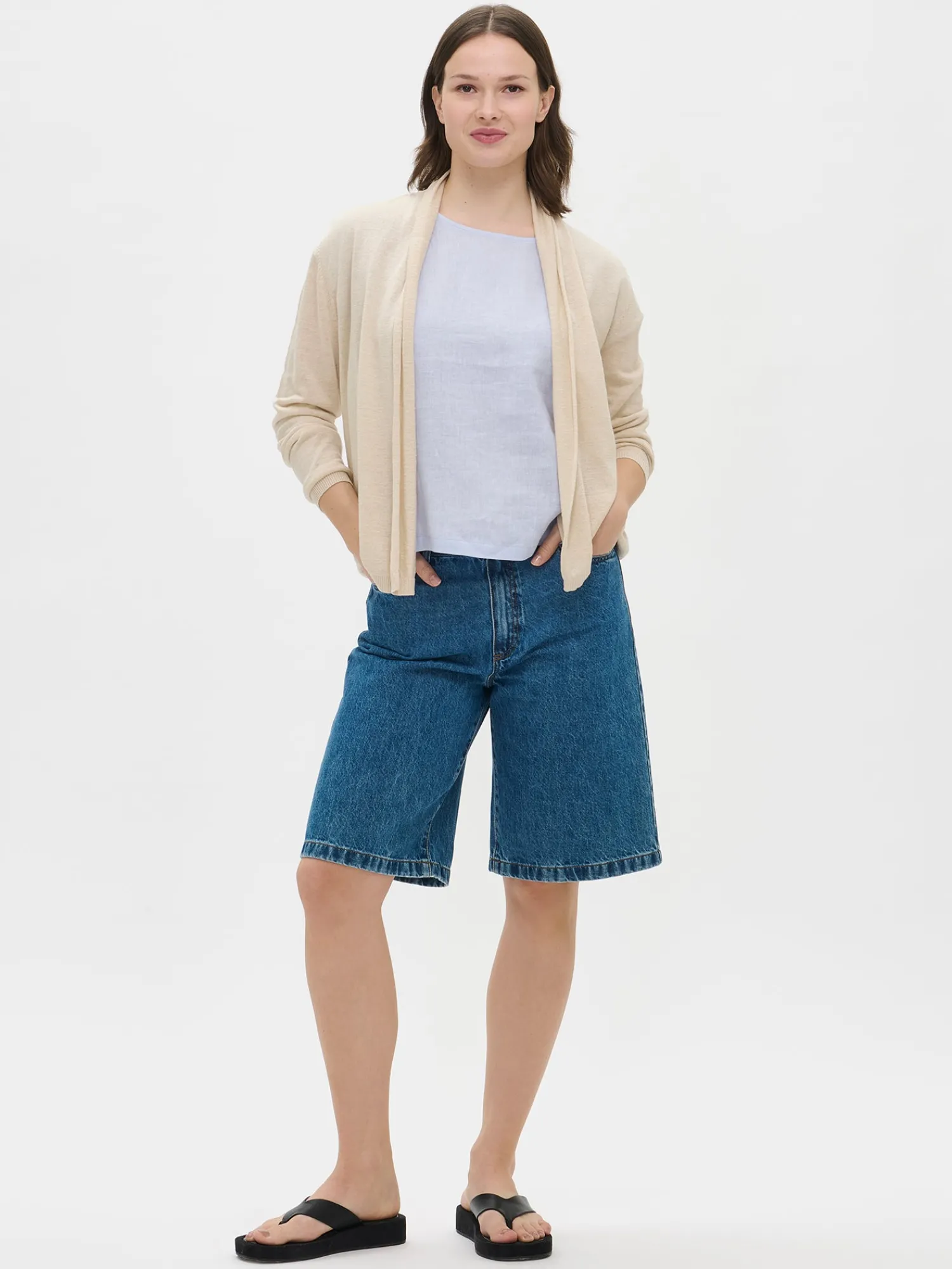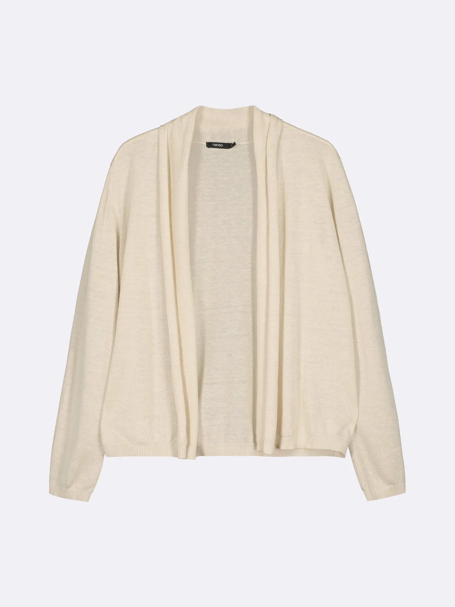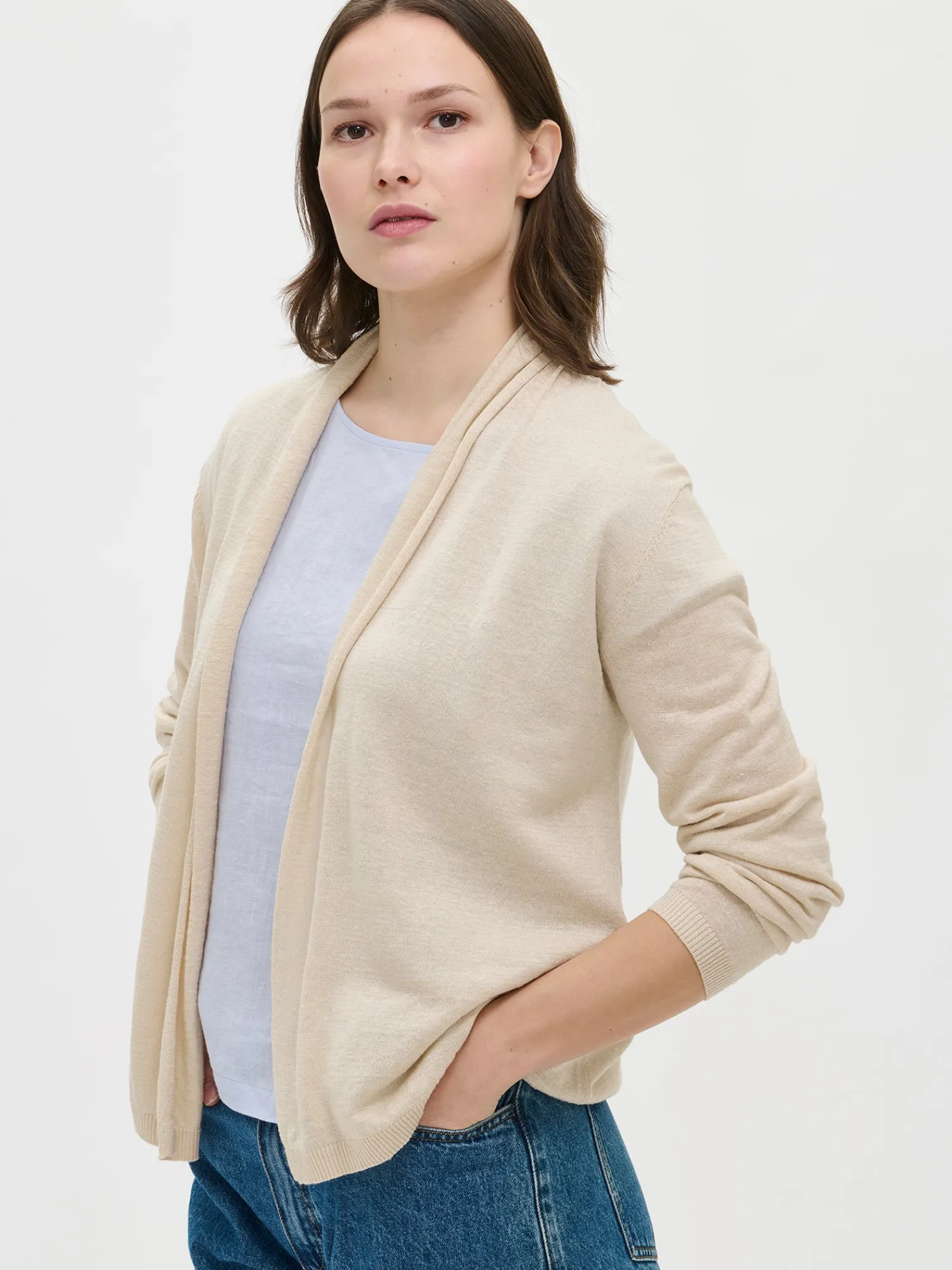 Naisten pitkähihainen beige Karina-neuletakki. Mukava ja kevyt neuletakki on muotoonneulottu laadukkaasta pellavan ja viskoosin sekoitteesta. Tyylikäs neuletakki on juuri sopiva kesäksi. Neuletakissa on klassinen shaalikaulus ja täyspitkät hihat. Neulatakin pituus koossa M on noin 60 cm.