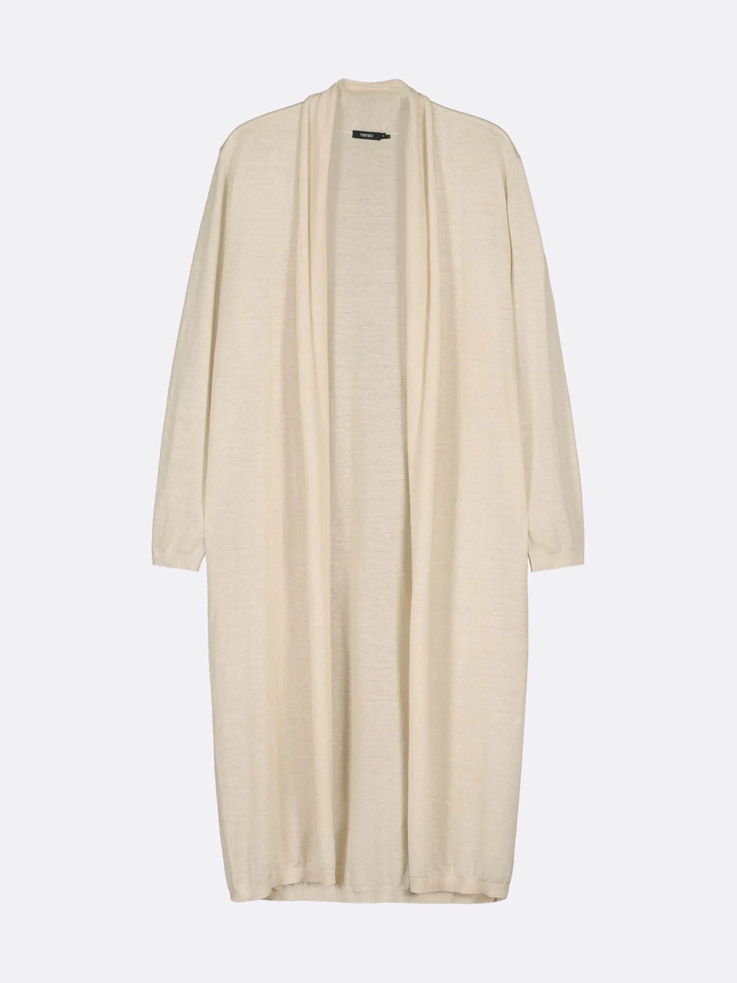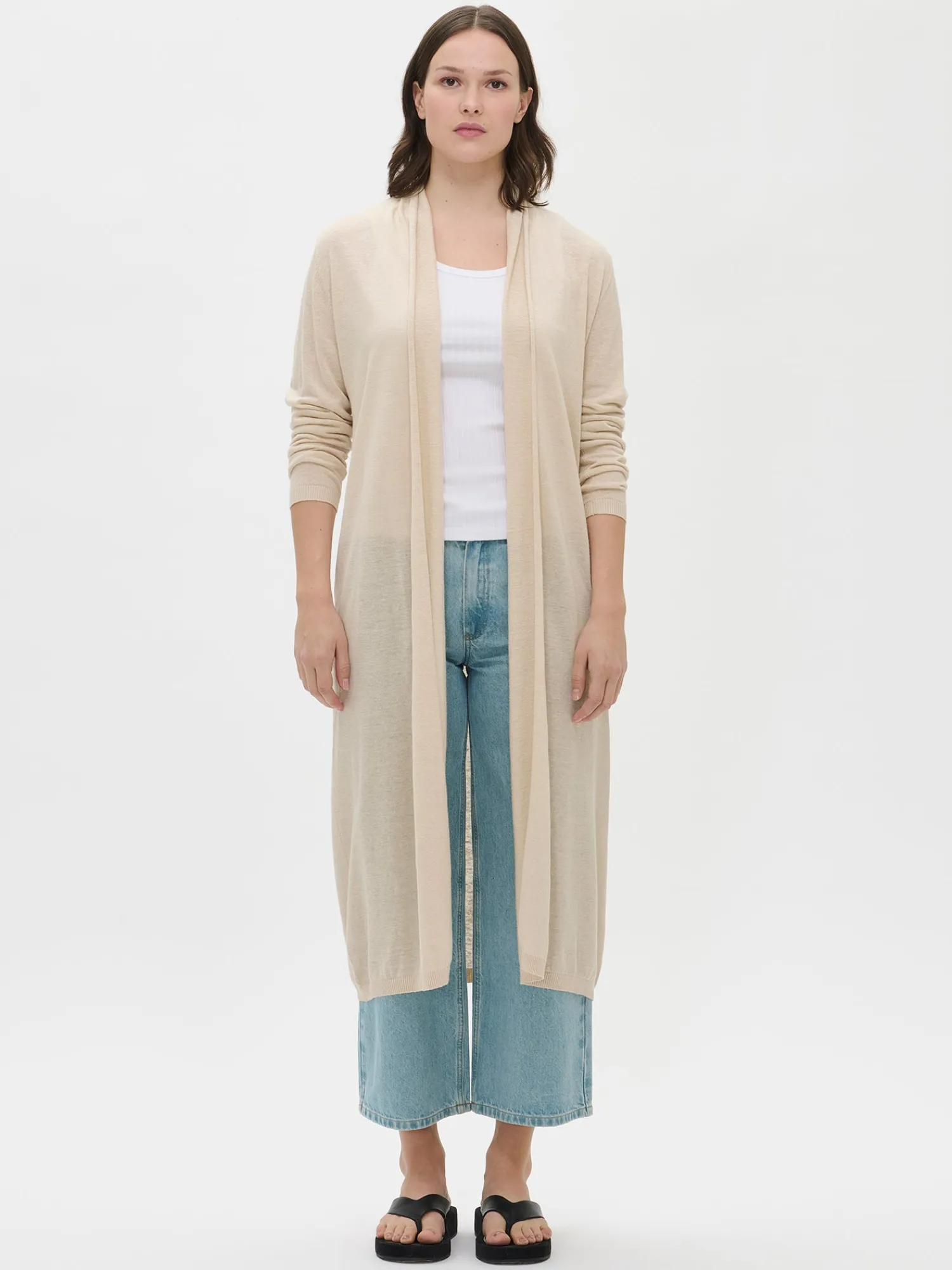 Naisten pitkä, beige Karina-neuletakki. Tyylikäs ja mukava neuletakki on muotoonneulottu laadukkaasta pellavan ja viskoosin sekoitteesta. Ohut neuletakki on ihana kevään lämpenevään säähän. Neuletakissa on klassinen shaalikaulus ja täyspitkät hihat. Neuletakin pituus koossa M on noin 110 cm.