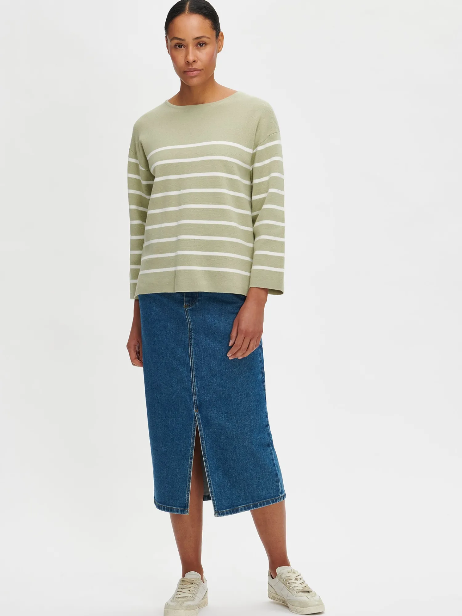 Naisten pitkähihainen, raidallinen vihreä Milano-neulepusero. Tyylikäs ja ajaton raitaneule on aina muodissa. Rennossa suoralinjaisessa neulepuserossa on ovaali pääntie, pudotettu olka ja täyspitkät hihat. Tuotteen pituus koossa M on noin 64 cm. Neulepusero on milano-neulosta, joka pysyy ryhdikkäänä käytössä. Neulepusero on valmistettu vastuullisesti tuotetusta laadukkaasta puuvillasta.